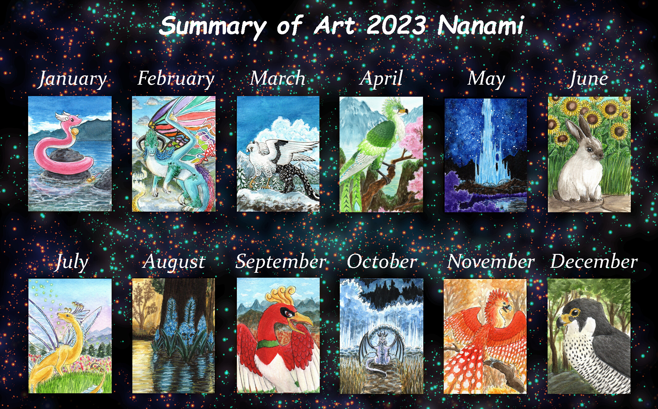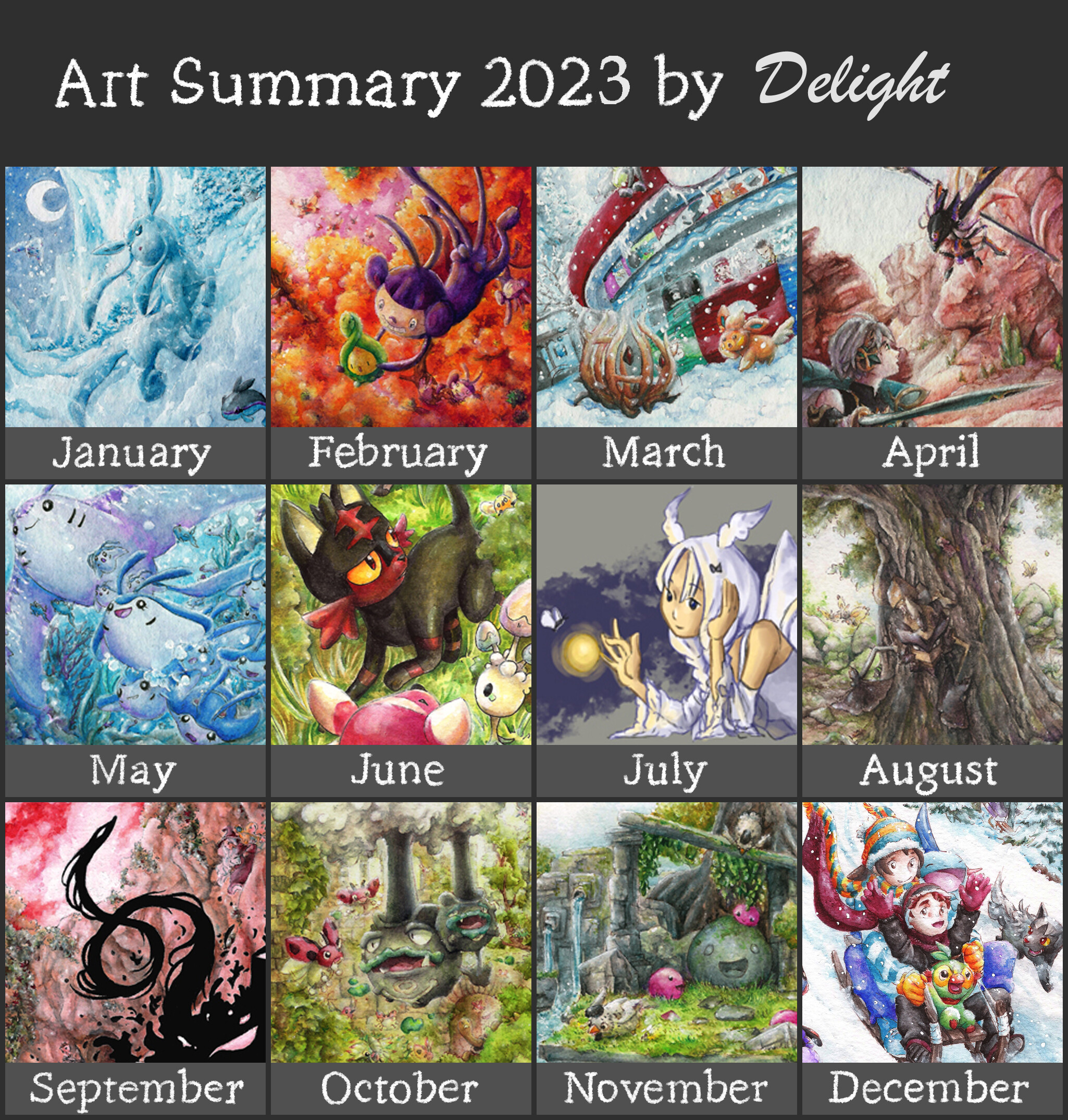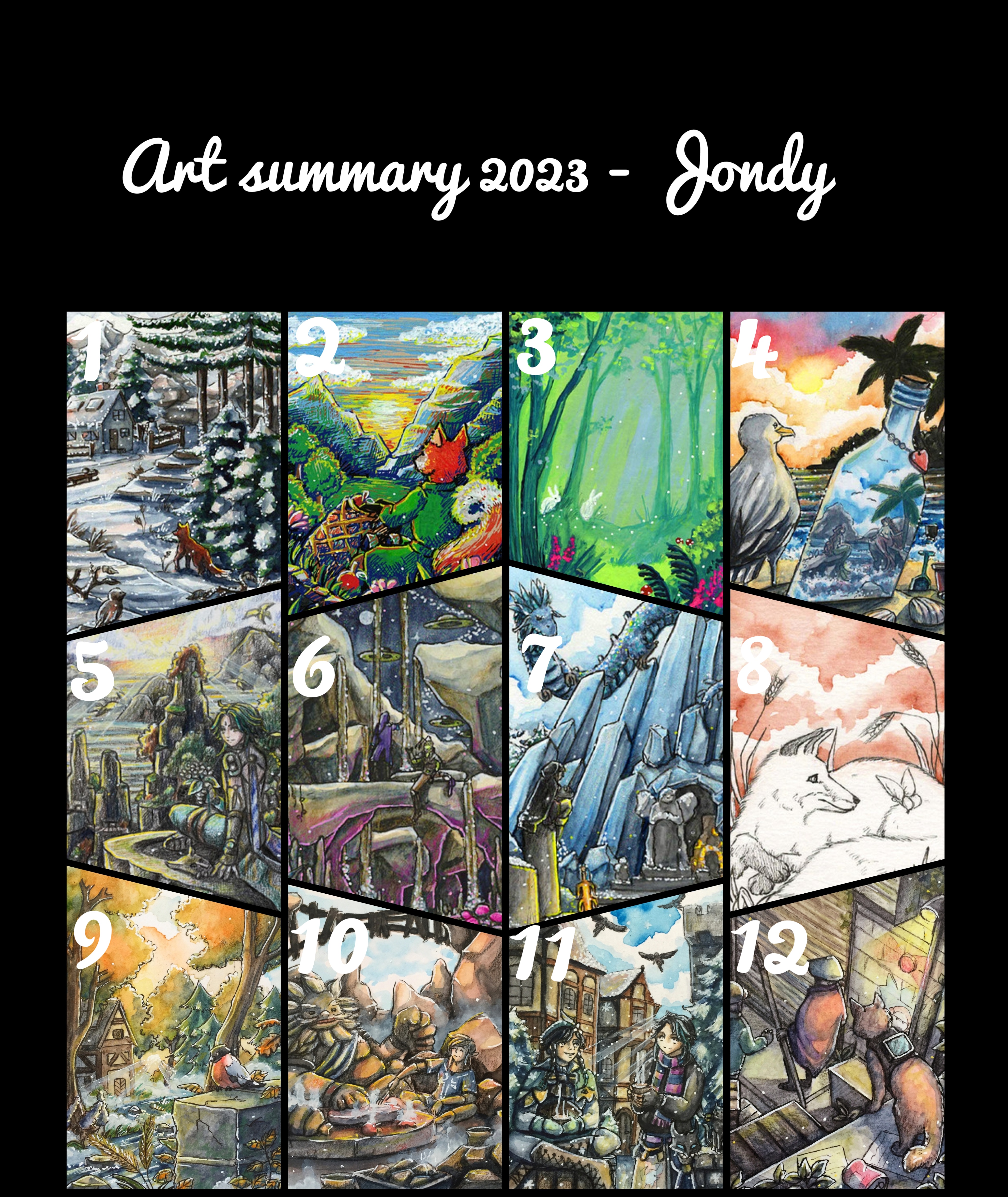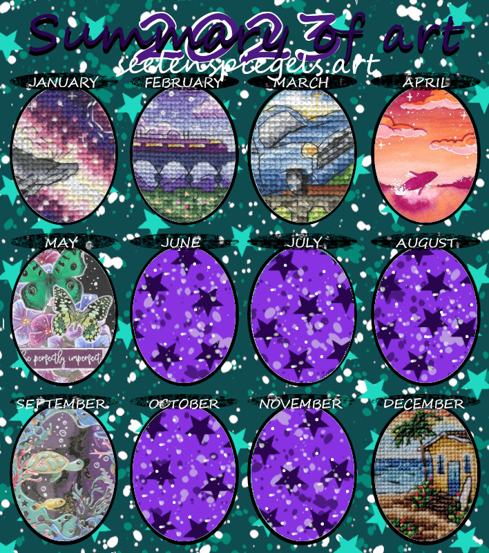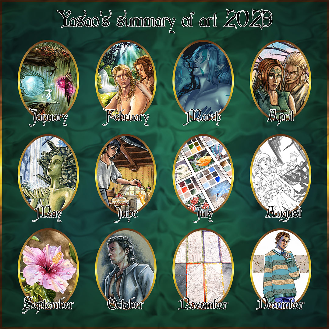 Seit letztem Jahr wollte ich bei mir nicht mehr explizit nach Monaten gehen, sondern nur insgesamt 12 meiner Bilder zeigen. Tatschlich waren es bei mir dieses Jahr auch nicht viel mehr Bilder. Aber durch “Artfight” sind die Hälfte der Bilder dieses Jahr digital entstanden.