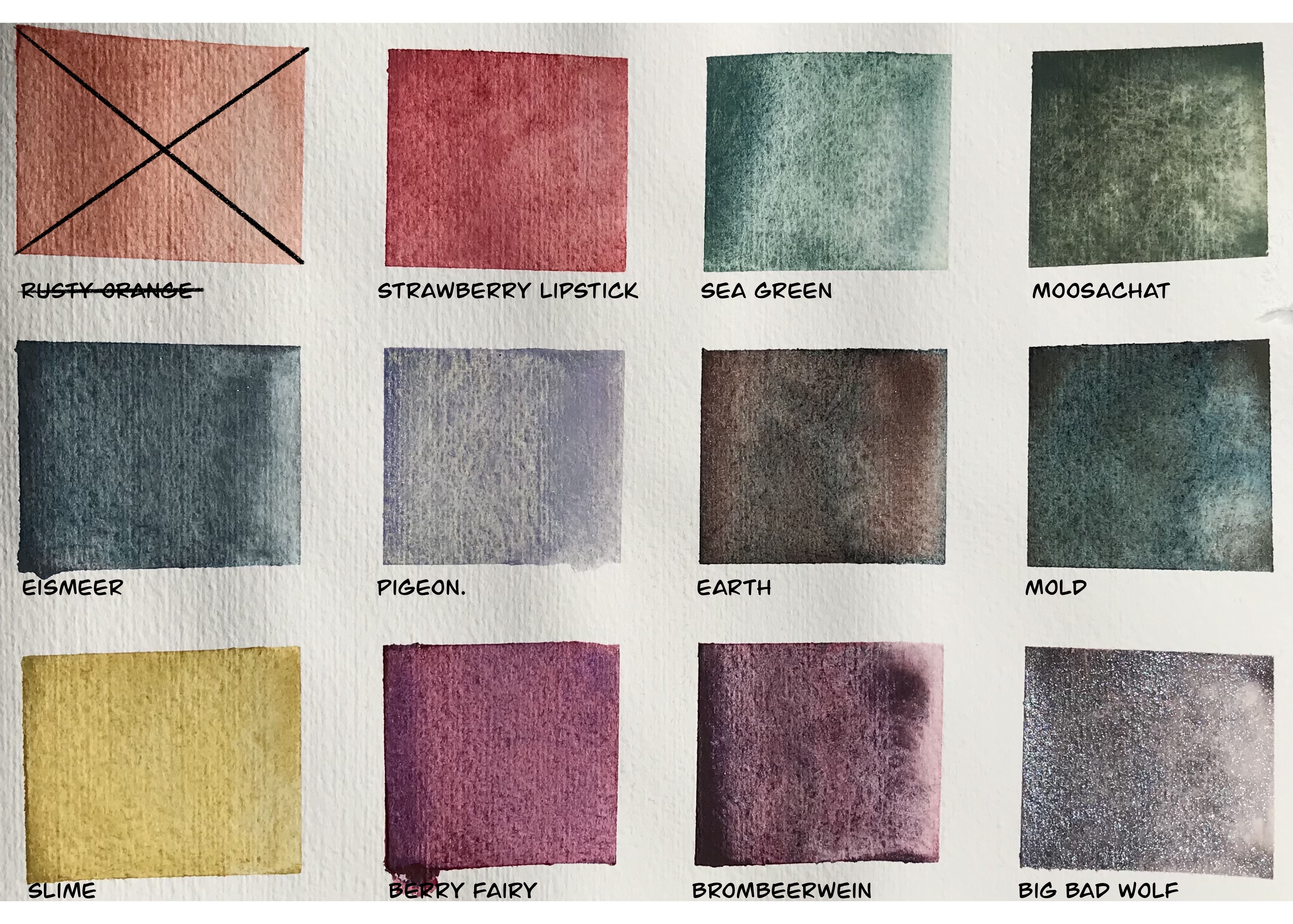 (Von oben links nach unten rechts: Sea Green, Moosachat, Earth, Mold, Brombeerwein, Big Bad Wolf)