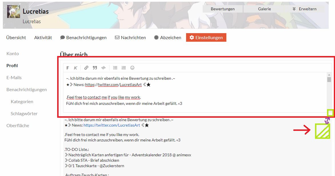 Bei den Einstellungen beim Steckbrief, wo man selbst einen eigenen Text verfassen kann, diese Box hat feste Maße, in der alten Version konnte man diese vergrößern. Gäbe es eine Möglichkeit diese Funktion wieder einzufügen?