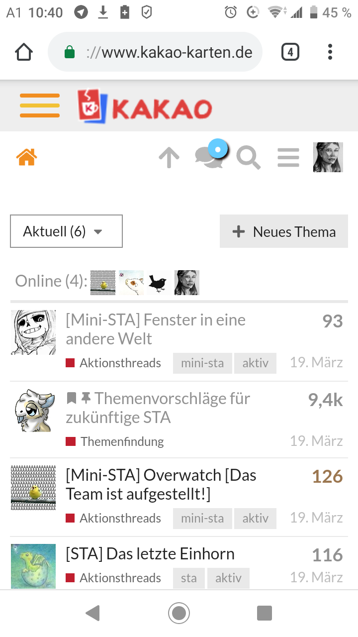 Also mir faellt seit mehreren Tagen auf, dass jedes Mal, wenn ich ich am Handy - von der Startseite ausgehend ueber das sidemenĂŒ - die Startseite des Forums aufrufe, wird mir die selbe, veraltete Seite aufgezeigt, inklusive der einzigen beiden User, die zum jeweiligen Zeitpunkt gerade online war.