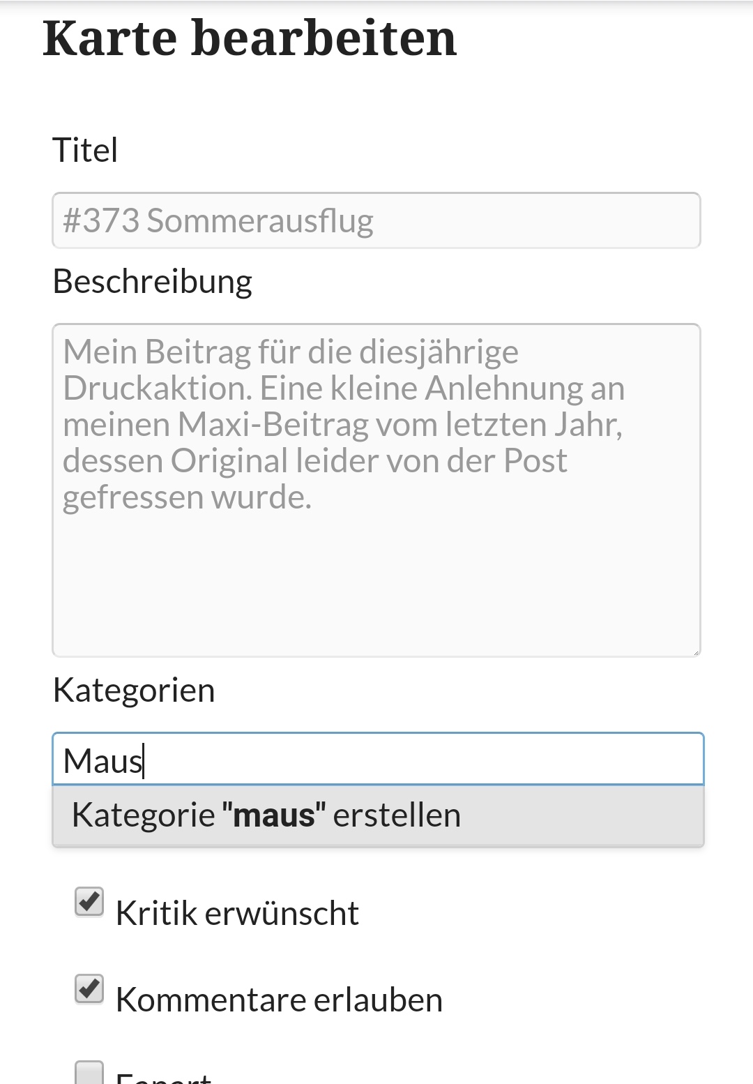 Ich habe gerade bei meiner neusten Karte versucht Kategorien anzugeben, leider hat das nicht funktioniert. Die automatische Anzeige bei den Kategorien hat mir nichts vorgeschlagen, egal was ich eingegeben habe, obwohl es die Kategorien auf jeden Fall schon gibt. Sowohl am Handy als auch am Laptop kam immer nur “Kategorie xy erstellen” als Vorschlag.
