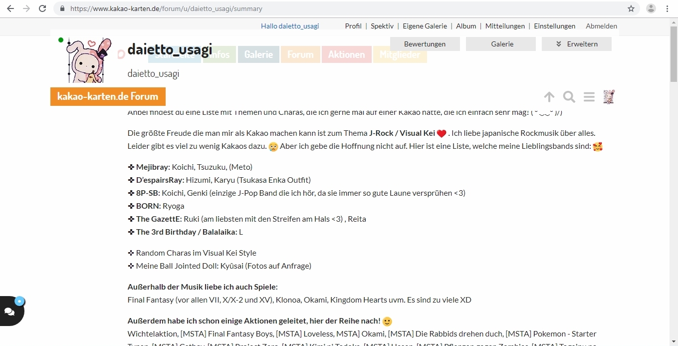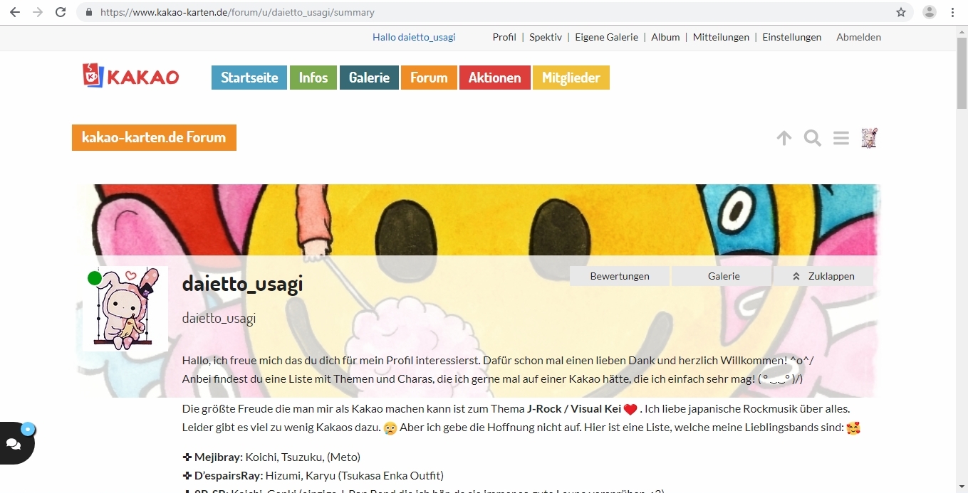 Die ganzen Tabs von “Startseite” bis “Mitglieder” liegen plötzlich im Hintergrund. Man kann sie nicht mehr anklicken. O.o Auch oben links das Kakaokarten Logo, wo man wieder auf die Startseite kommt, ist vom Profilbild überlappt und liegt im Hintergrund. Auch mein Beschreibungstext ist hoch gerutscht. Da fehlt so eine komplette Zeile und die Zweite ist nur halb zu sehen.