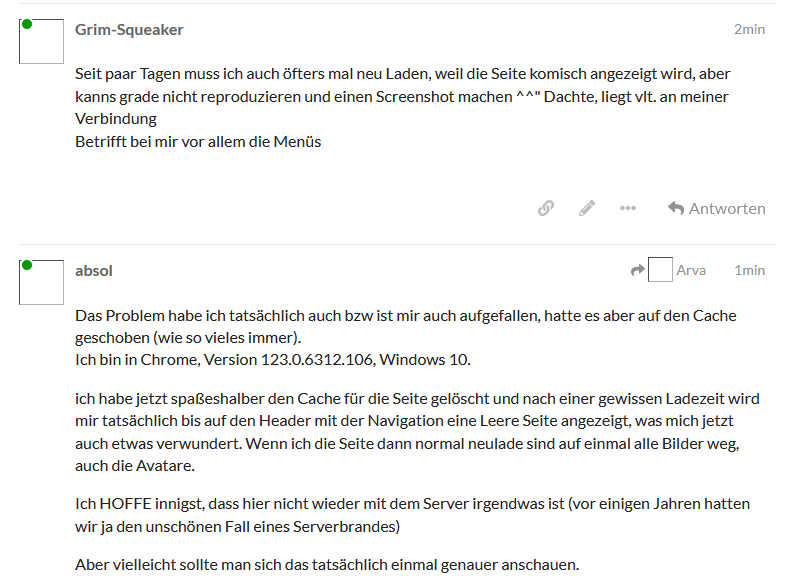 ich habe jetzt spaßeshalber den Cache für die Seite gelöscht und nach einer gewissen Ladezeit wird mir tatsächlich bis auf den Header mit der Navigation eine Leere Seite angezeigt, was mich jetzt auch etwas verwundert. Wenn ich die Seite dann normal neulade sind auf einmal alle Bilder weg, auch die Avatare.