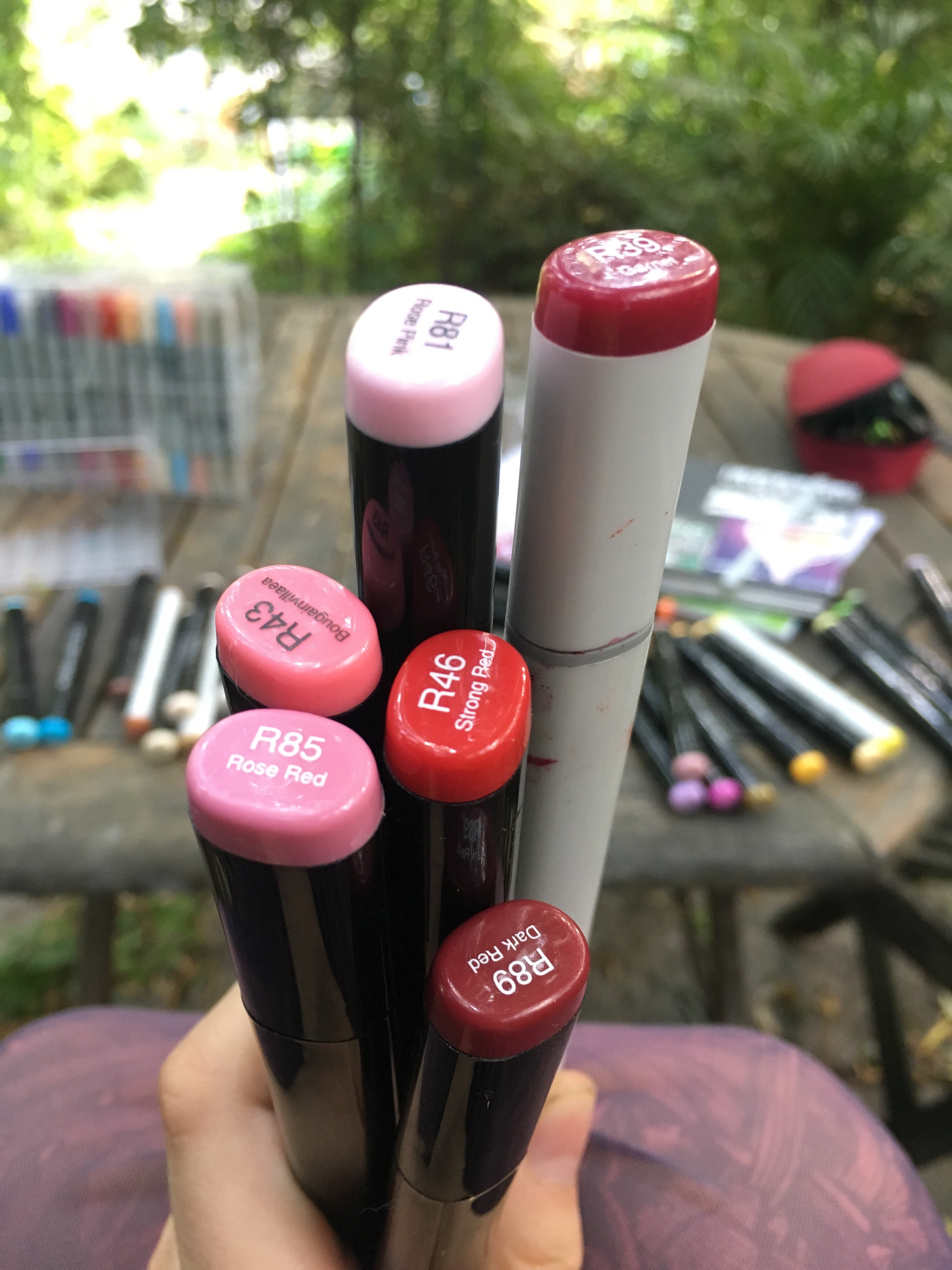 Mal eine ganz andere Frage: ich sortiere gerade meine Copics, und mir ist aufgefallen, dass es eine Diskrepanz zwischen Farbbezeichnung und meiner eigenen Benennung der Farbe gibt. Als Beispiel hier die Rottöne: