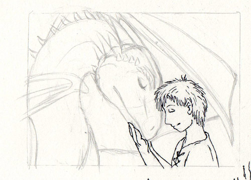 Mmh…find alle drei Ideen passend. Noch ein Drache, oder Drachen, die in der Ferne kreisen, Sonnenuntergang oder Gewitterwolken…mmh… Werd mal die größere Skizze dazu mal missbrauchen und schauen, was passt (x Danke für’s Feedback
