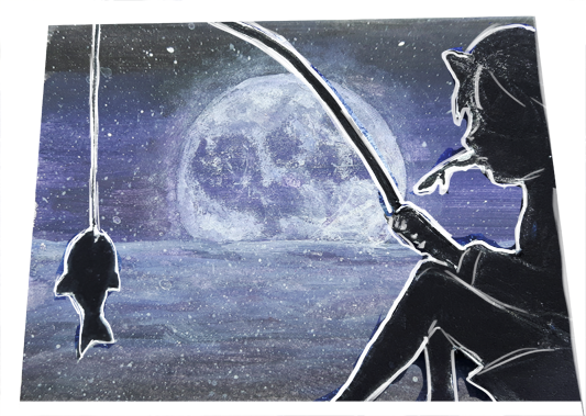 Ich würde eher in der rechten, unteren Ecke des Mondes ein kleines Boot mit dem fischenden Jungen setzen, aber wirklich nur minimal, um den Mond noch größer wirken zu lassen.
