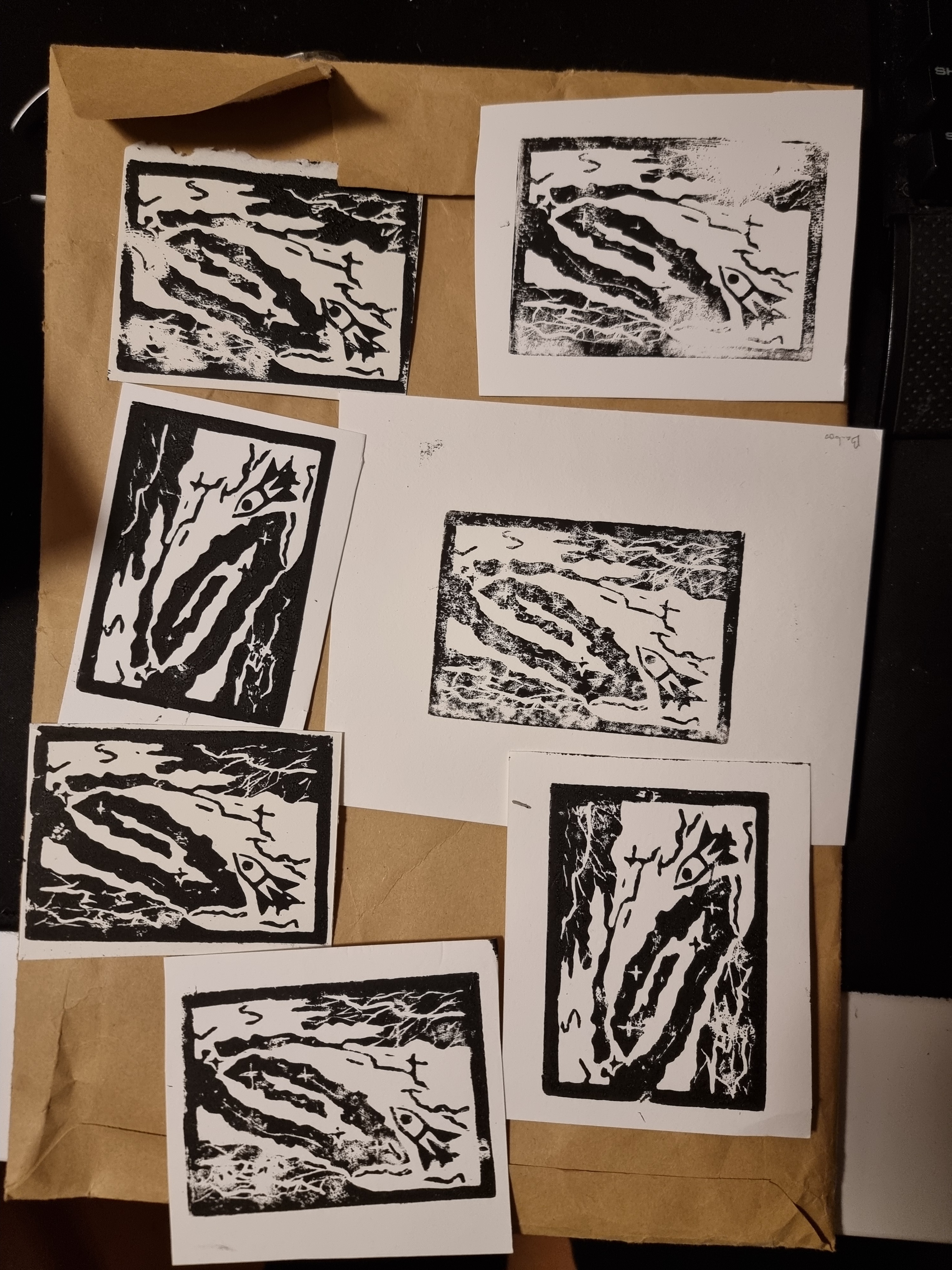 Ich habe mir zu Weihnachten selbst ein Anfänger-Linolschnitzset geschenkt und das mal ausprobiert. Bisher habe ich das erst 1x in der 7. Klasse gemacht