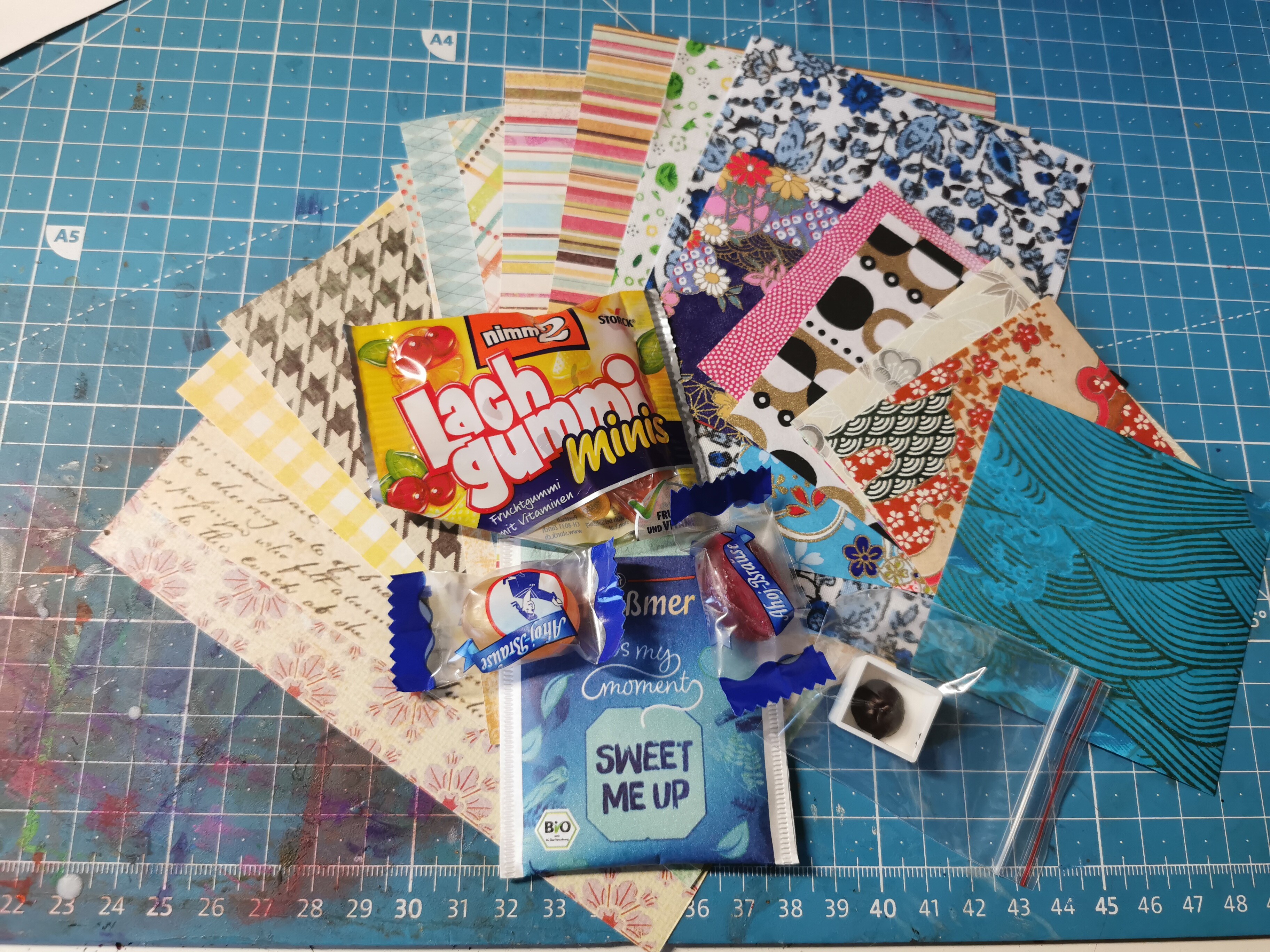 Das Stoffartige in der Motivpapiermischung sind tatsächlich ein paar selbstklebende Stoffe gesponsort von koko. Viel Spaß beim Verbasteln