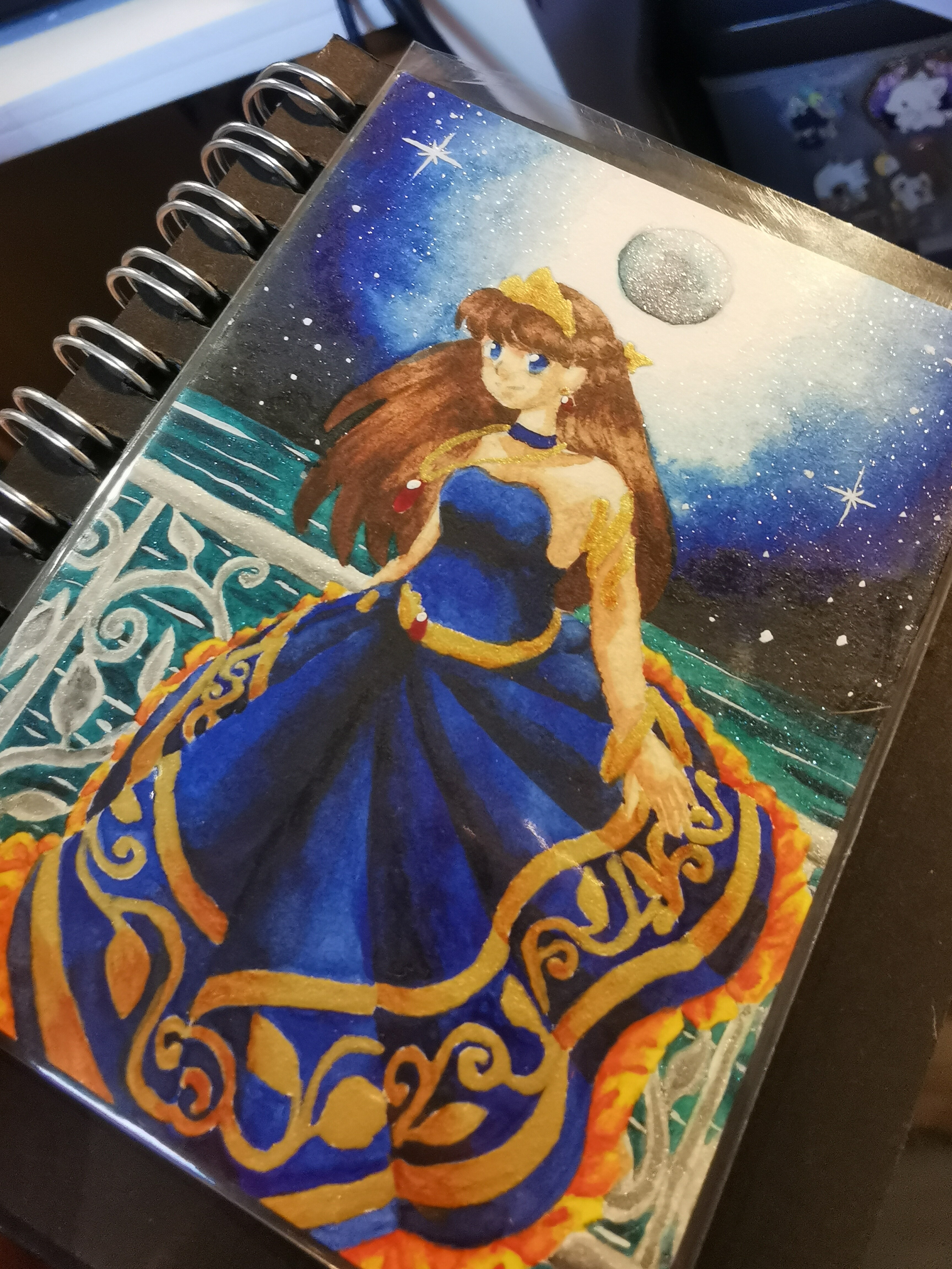 Ich mag solche Motive generell. Hier finde ich besonders toll, dass die gezeichneten Farben glitzern und man die Glitzer-Farben nicht nur auf dem gemalten Bild, sondern auch auf dem zerknüllten Papier, in dem Wasserglas und auf der Pinselspitze findet, während das restliche Motiv mit normalen Farben gezeichnet ist.