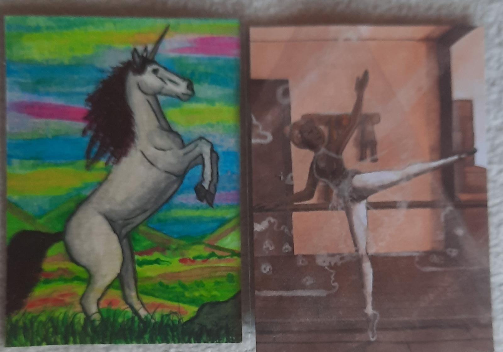 Leider ist es auf dem Foto nicht so gut zu sehen aber je nachdem wie man die Karte hält kann man ihr Tütü sehen und wie sie auf der Bühne tanzt.