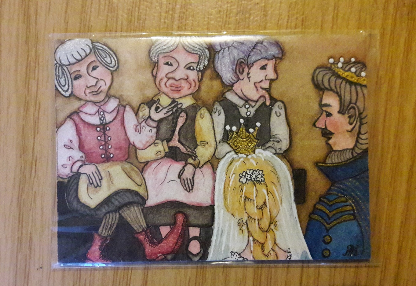 Ich bin ja eh ein größer Grimm-Fan und die Geschichte war mir zwar nicht mehr in allen Einzelheiten vertraut, aber dennoch vage bekannt. Ausschlaggebend für die Entscheidung allerdings war, dass dieses Kärtchen für mich auch als typische Märchenbuch-Illustration funktionieren würde. Lustig und alles ist mit drauf. Die Haare der Damen glänzen so schön . Und der König ist irgendwie schnuckelig XD