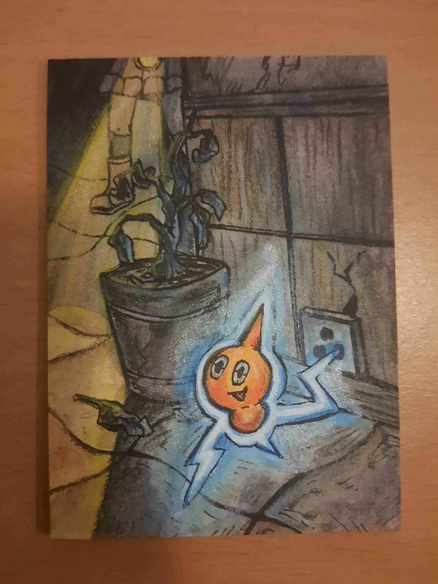Diese Karte ist mir direkt ins Auge gefallen! Das kleine Pionskora ist einfach zu niedlich wie es da unter dem Baumstamm versucht dem Regen zu entkommen