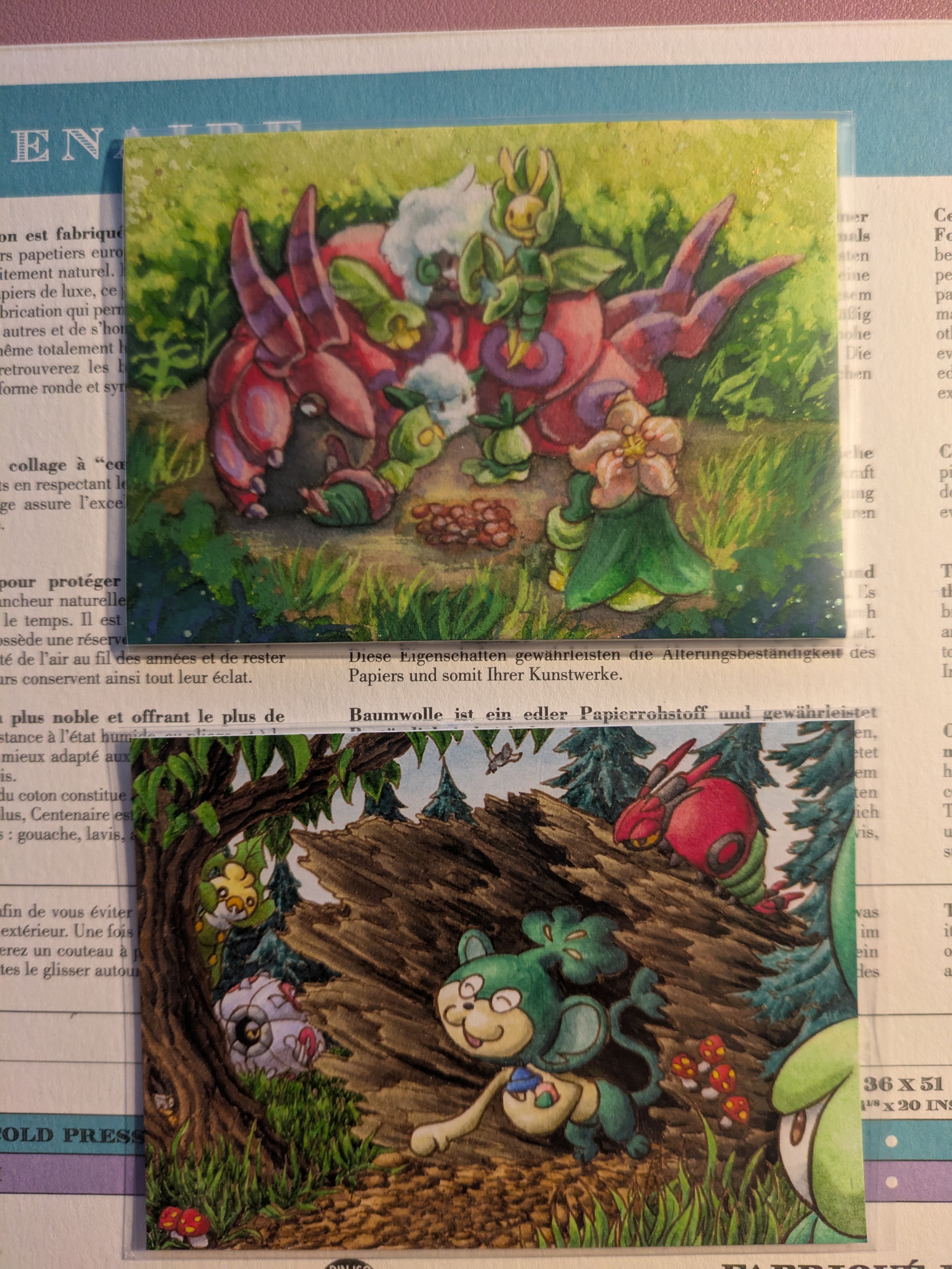 Dem aufmerksamen Betrachter werden eventuell Parallelen zu Nairas Karte auffallen…bin sehr dankbar, dass ich die beiden so nehmen durfte, denn sie ergeben ein geniales Set :D Hier ist Vegimak der Hauptakteur und drumherum sind einige Pokémon, die auf der anderen Karte ebenfalls vertreten sind…allerdings noch nicht voll entwickelt. Wie cool ist bitte die Vorstellung, dass auf dieser Karte die Pokémon als “Kinder” zu sehen sind, während sie auf der anderen “erwachsen” geworden sind