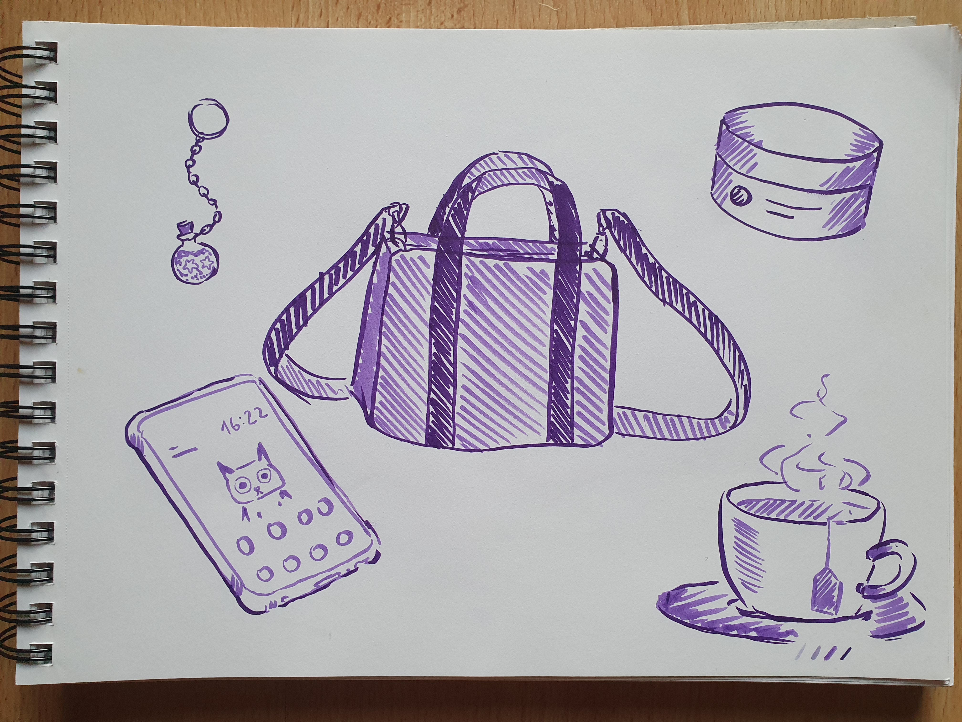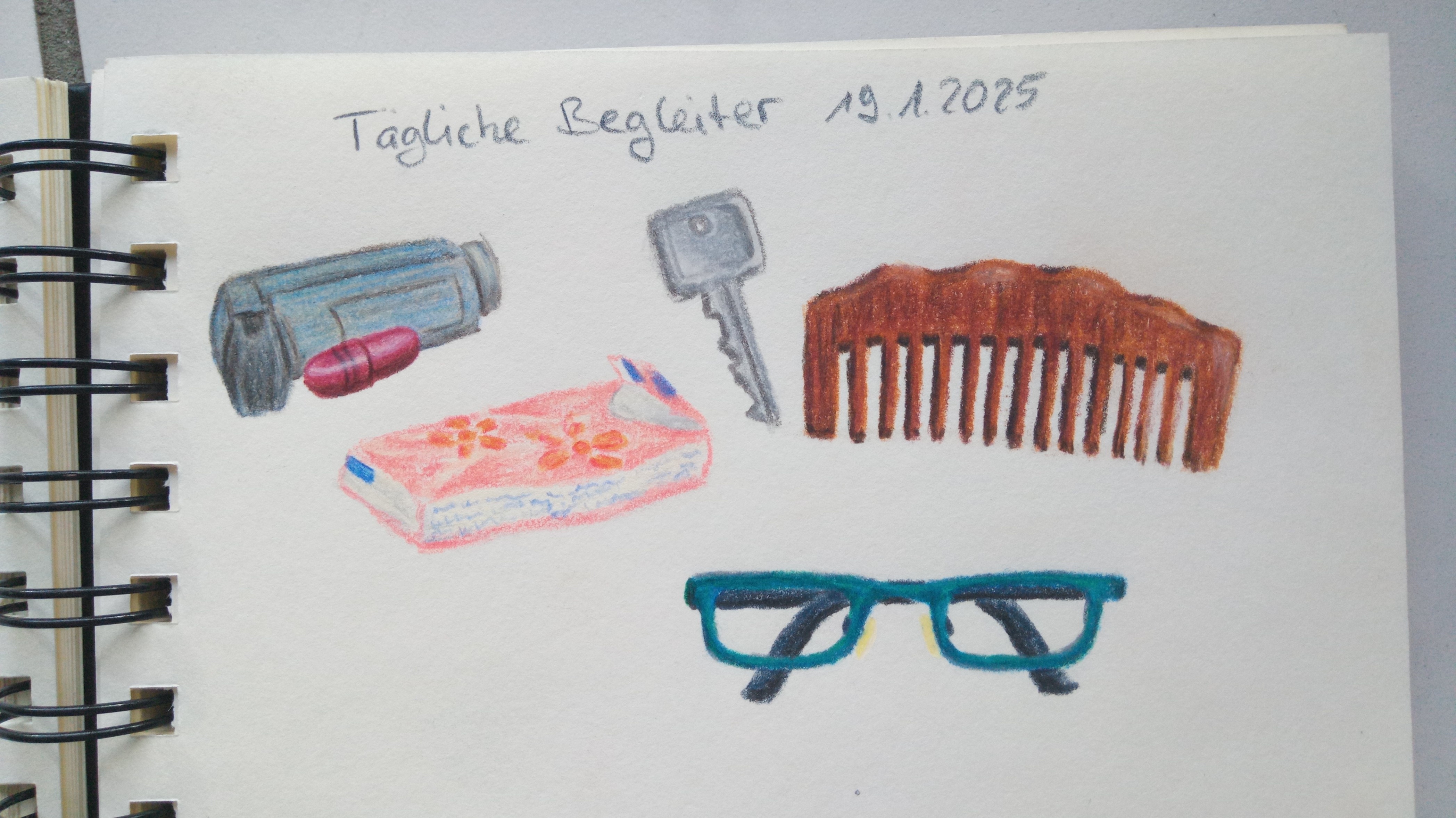 Wenn ich meins mit ein paar anderen Beiträgen vergleiche, muss ich feststellen, dass ich sehr pragmatisch bin mit den Dingen, die ich täglich benutze oder immer bei mir habe. Dabei habe ich natürlich nicht alles gezeichnet (zB Hygiene und Besteck und so…)