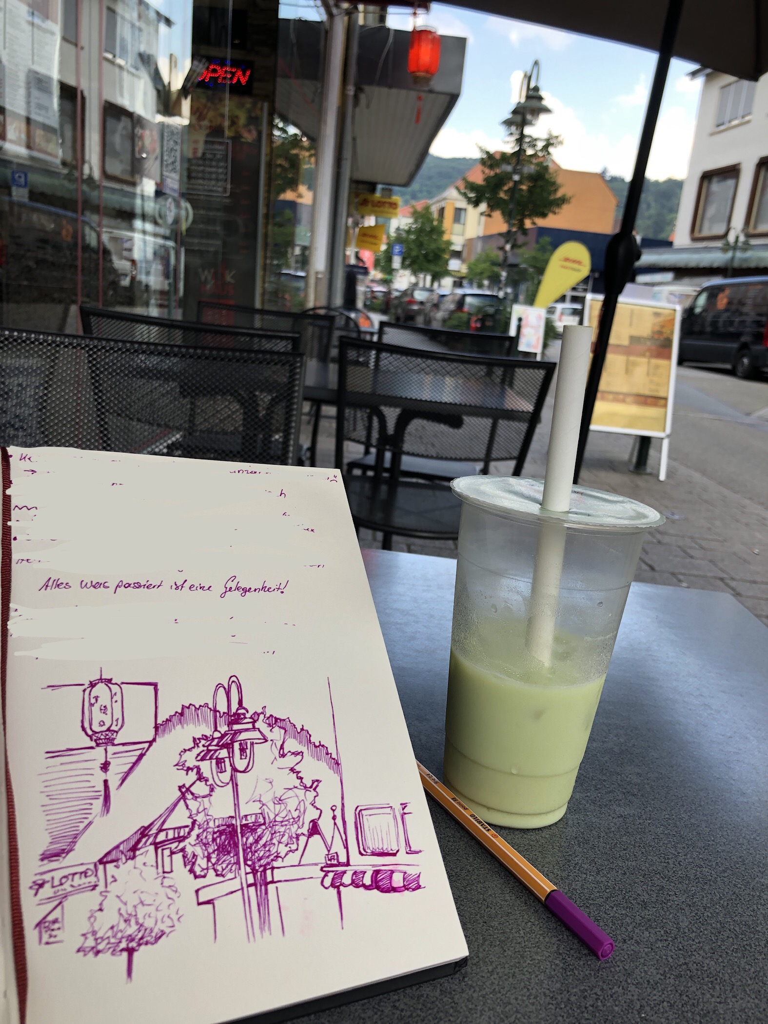Bei einem kalten Getränk mit Eiswürfeln unter einem Sonnenschirm urban sketchen.