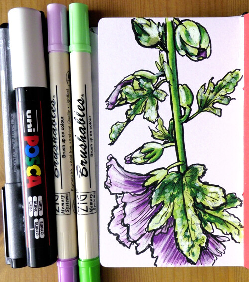 Da Blumen hier wohl auch mal ein Thema waren, bin ich so “faul”, auch gleich die gegenüberliegende Seite (eine weiße diesmal) mit einer Stockrose zu posten - passt ja auch zum Thema Sommer, ne? (Die Dinger blühen gerade echt überall, auch da, wo sie gar nicht wachsen sollen - diese hier kam aus einem Riss im Asphalt…) Sie entstand mit Fineliner, Markern und weißem Posca.