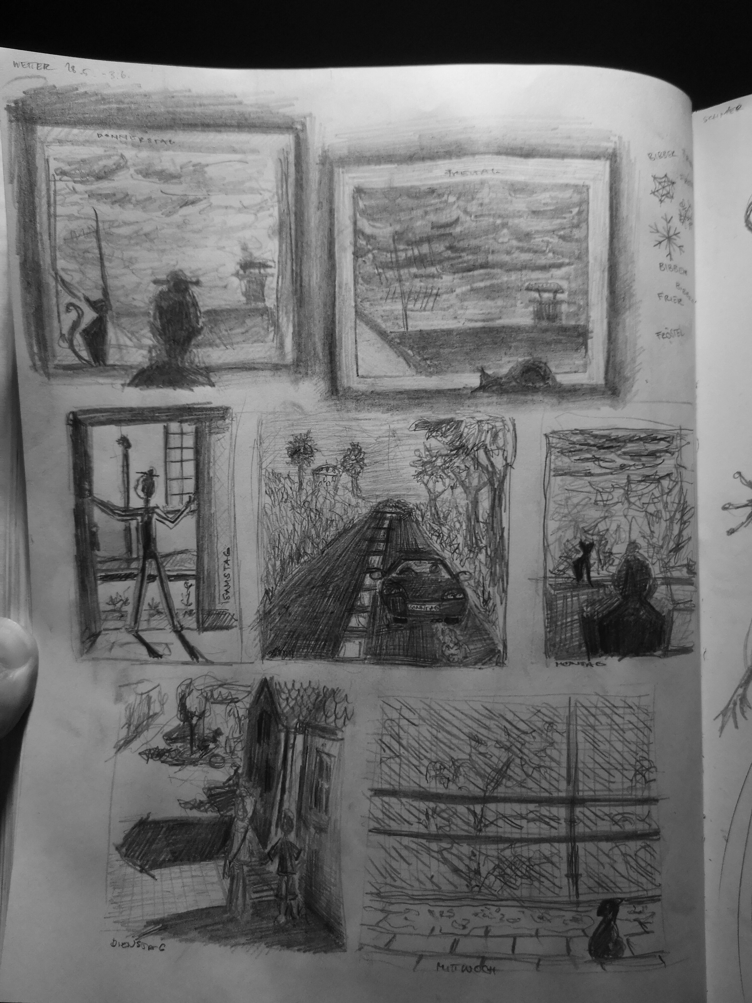Ich hab auch noch das Wetter nachgeholt. Hab jetzt die letzten sieben Tage jeweils eine kleine Skizze dazu gemacht, auch wenn das Wetter bei manchen eher eine Nebenrolle spielt