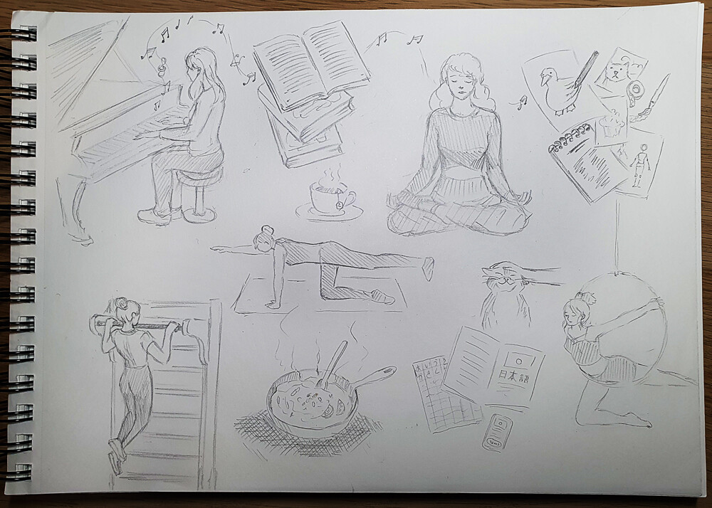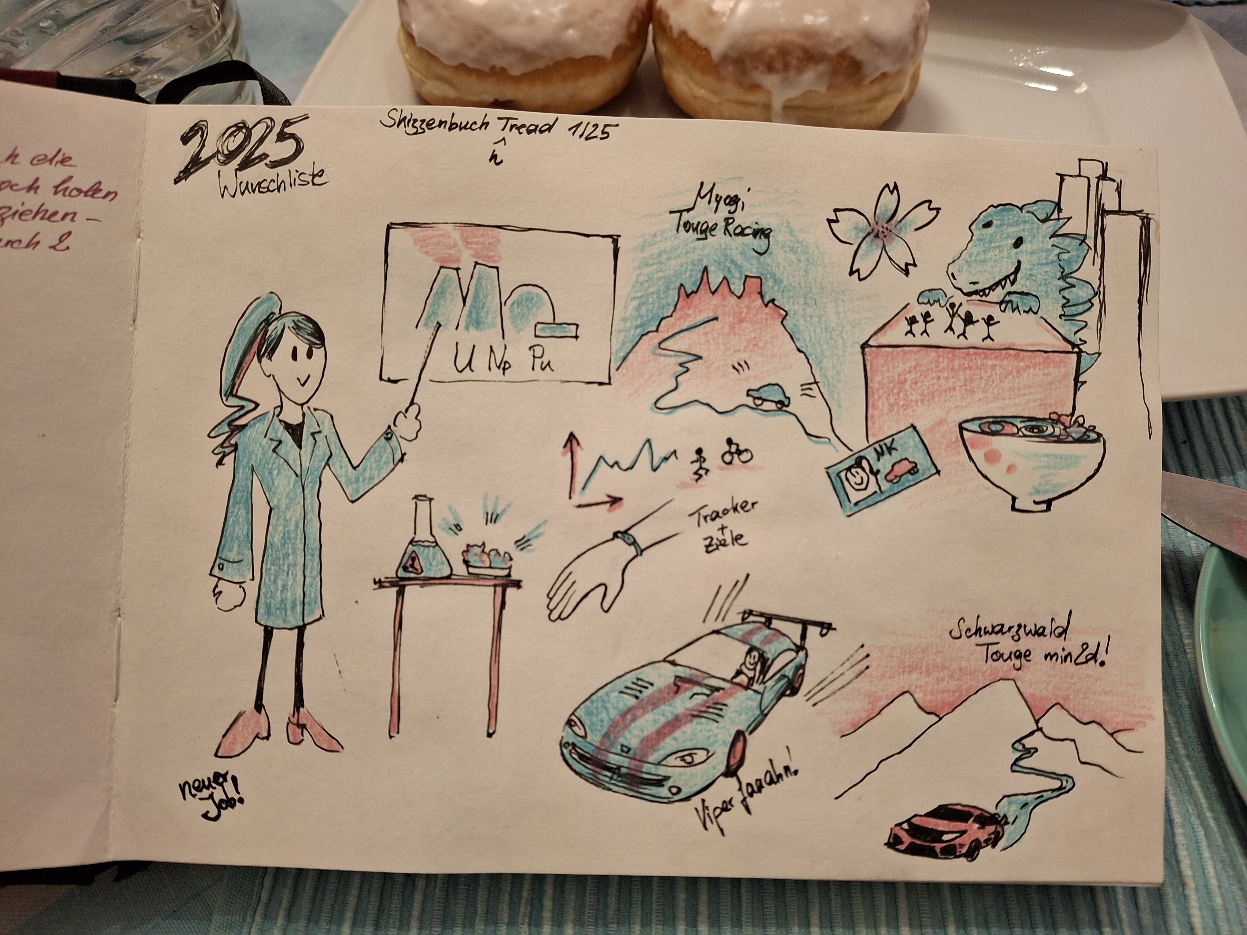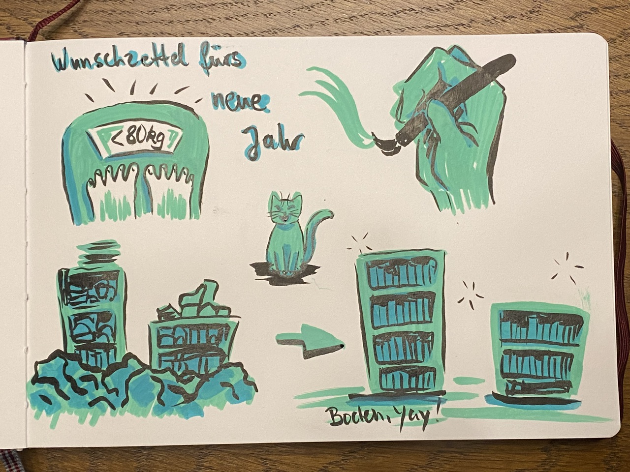 In der Skizze habe ich verschiedene Dinge dargestellt, die ich dieses Jahr schaffen möchte. Es sind z.B. Ziele für meine mentale und körperliche Gesundheit (Sport, Bücher lesen, Meditation usw.). Ansonsten Dinge, die mit Zeichnen, Kochen, Sprache lernen zu tun haben und ich möchte etwas für Tierschutz tun, ich weiß aber noch nicht was, daher die Katze. Und ich möchte ein Lied auf Klavier lernen, das ich schon seit über 10 Jahren lernen will (und nein, ich habe keinen Flügel, sondern nur ein sehr altes Keyboard, ich kann auch kein einziges Lied mehr, aber wird schon werden :'D )