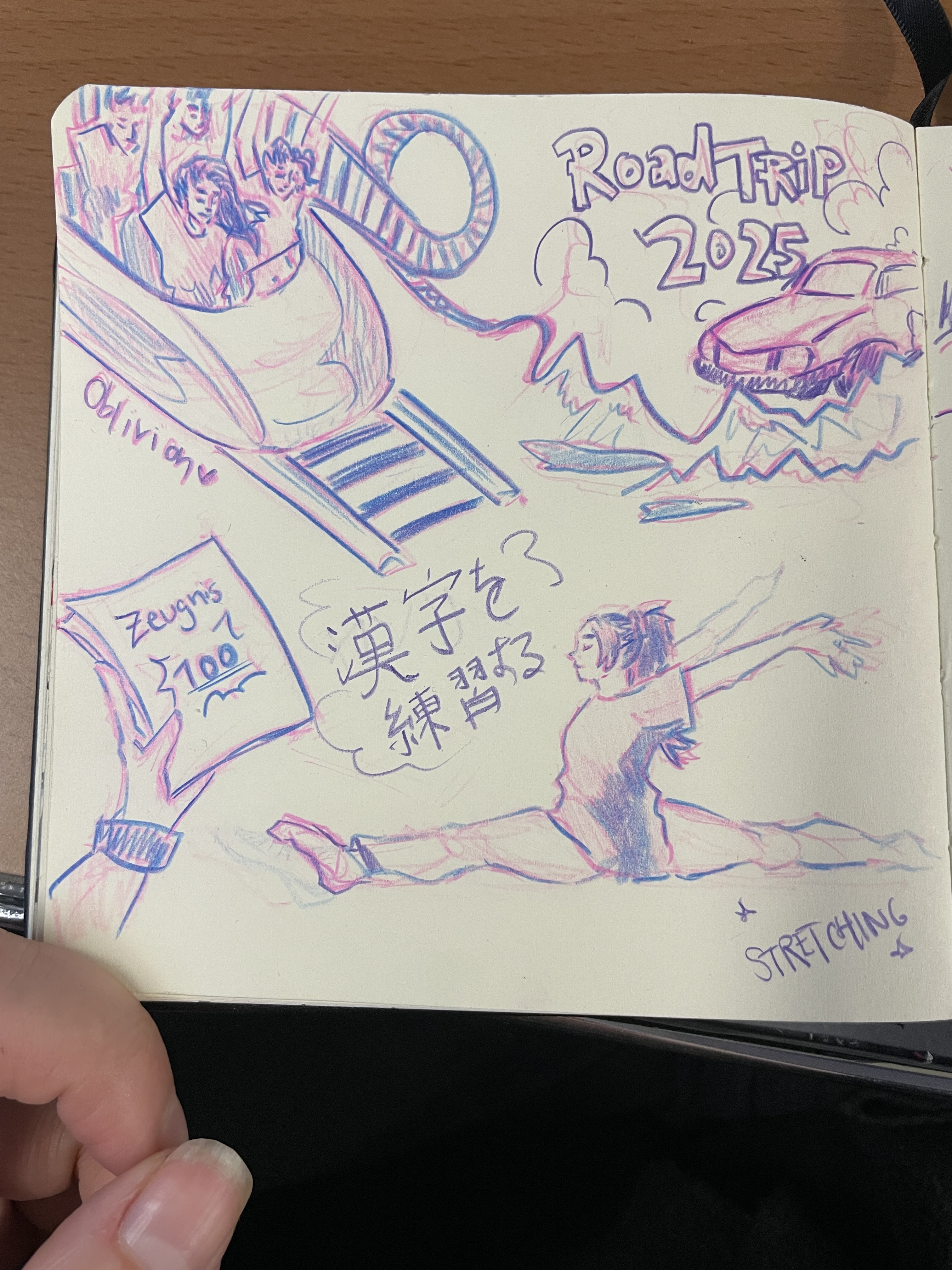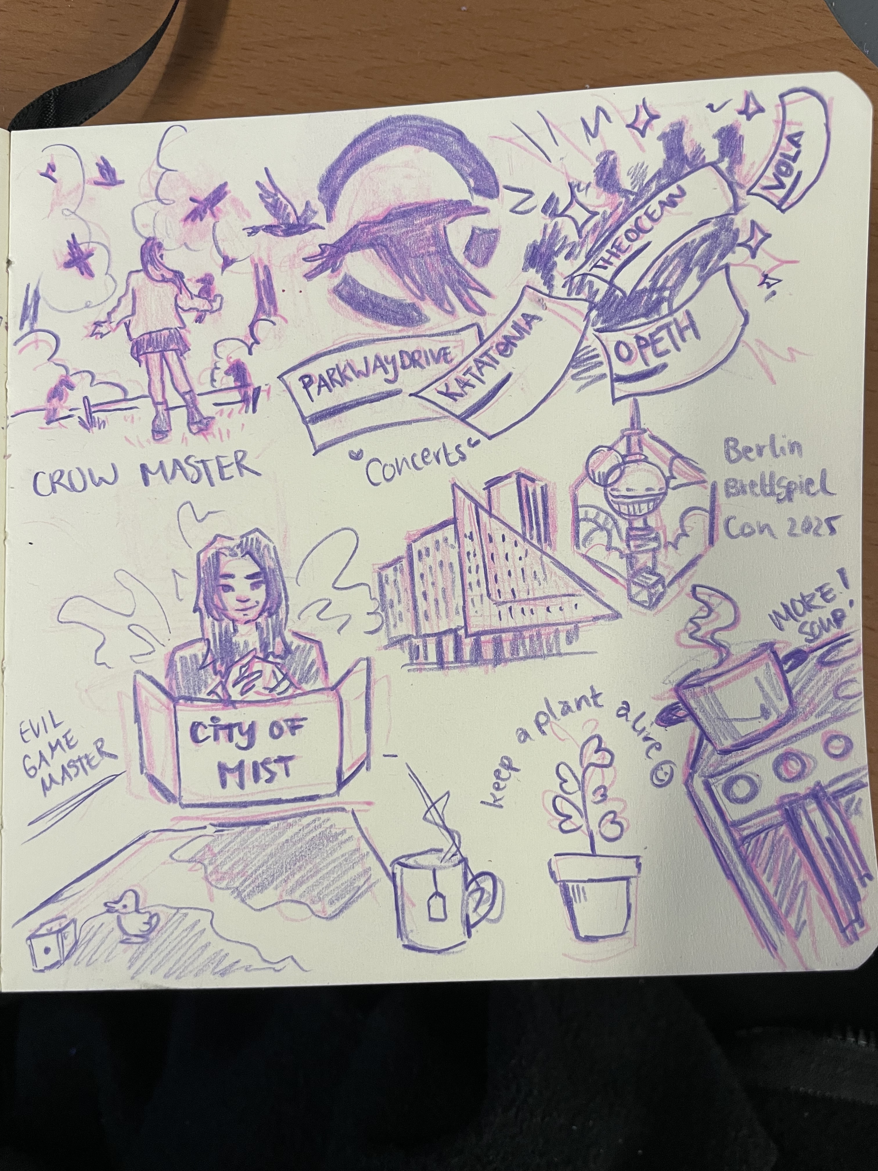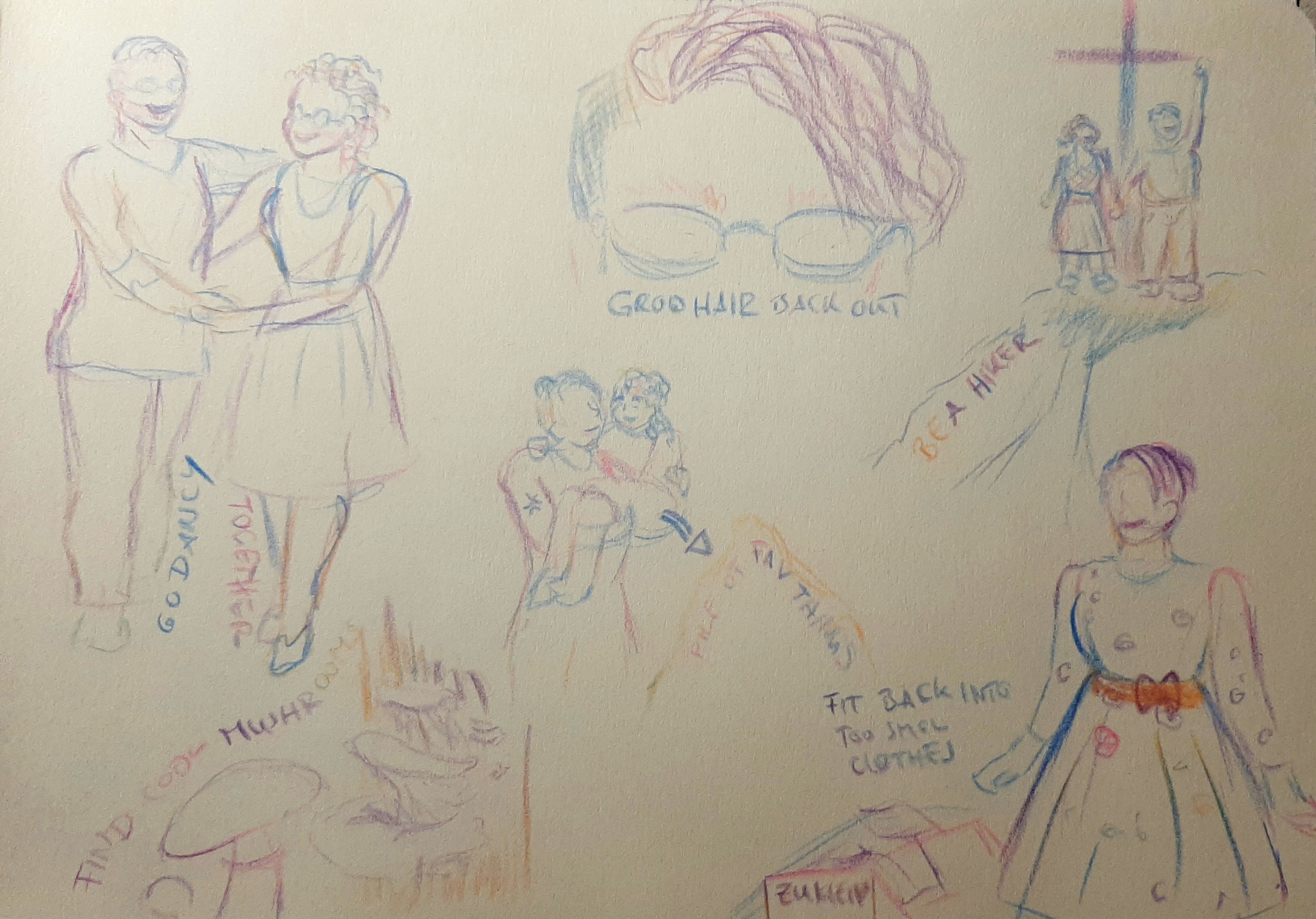 In der Skizze habe ich verschiedene Dinge dargestellt, die ich dieses Jahr schaffen möchte. Es sind z.B. Ziele für meine mentale und körperliche Gesundheit (Sport, Bücher lesen, Meditation usw.). Ansonsten Dinge, die mit Zeichnen, Kochen, Sprache lernen zu tun haben und ich möchte etwas für Tierschutz tun, ich weiß aber noch nicht was, daher die Katze. Und ich möchte ein Lied auf Klavier lernen, das ich schon seit über 10 Jahren lernen will (und nein, ich habe keinen Flügel, sondern nur ein sehr altes Keyboard, ich kann auch kein einziges Lied mehr, aber wird schon werden :'D )