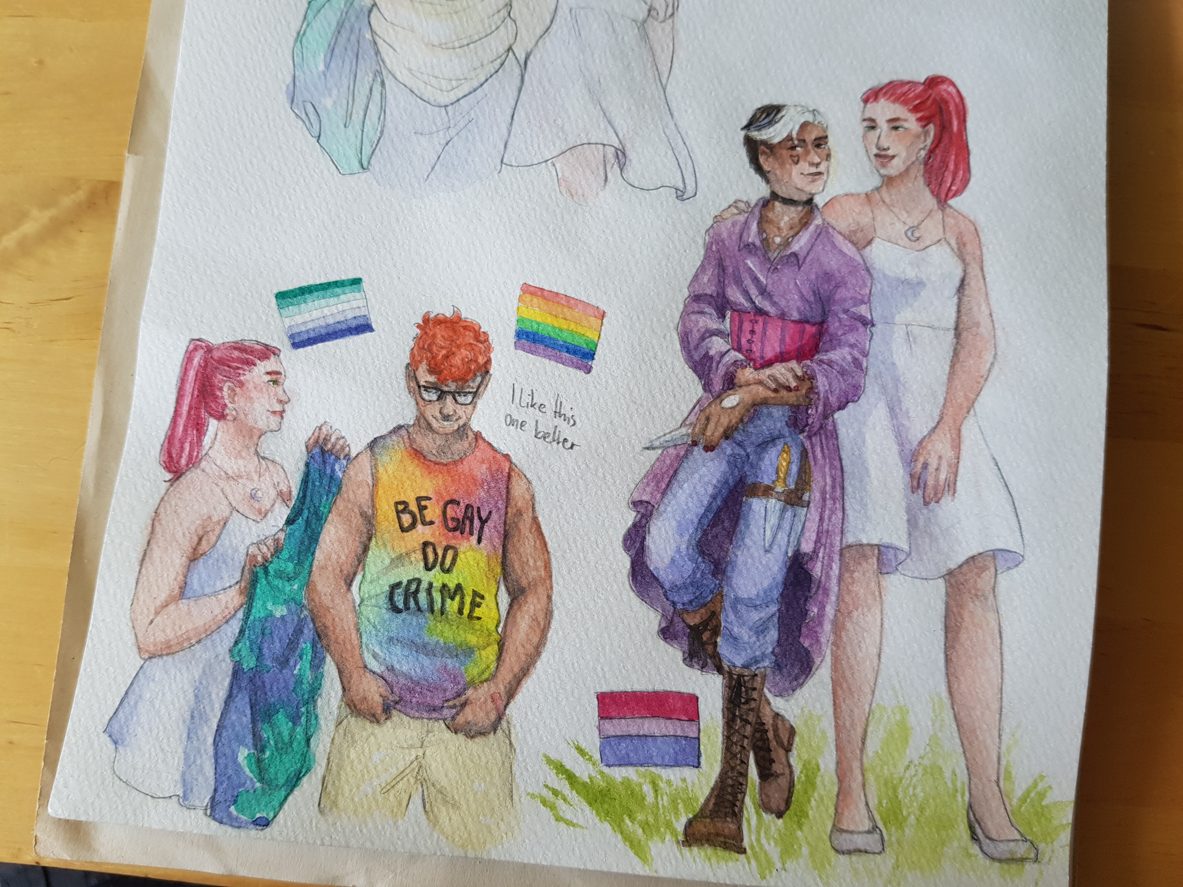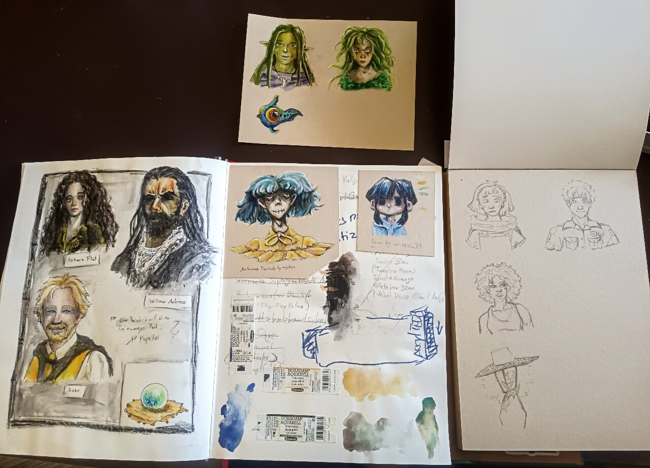 Es kann auch Papier sein, das man unbedingt haben musste und dann nie verwendet, schließlich kann man auch Dinge ins Skizzenbuch kleben. Das mach ich mit Copics gerne so, auch ein Material der Schande bei mir. Weil sie durchdrücken. Also kleb ich entweder Papier mit Copic bemalt ein oder ich klebe etwas auf die durchgedrückte Rückseite.