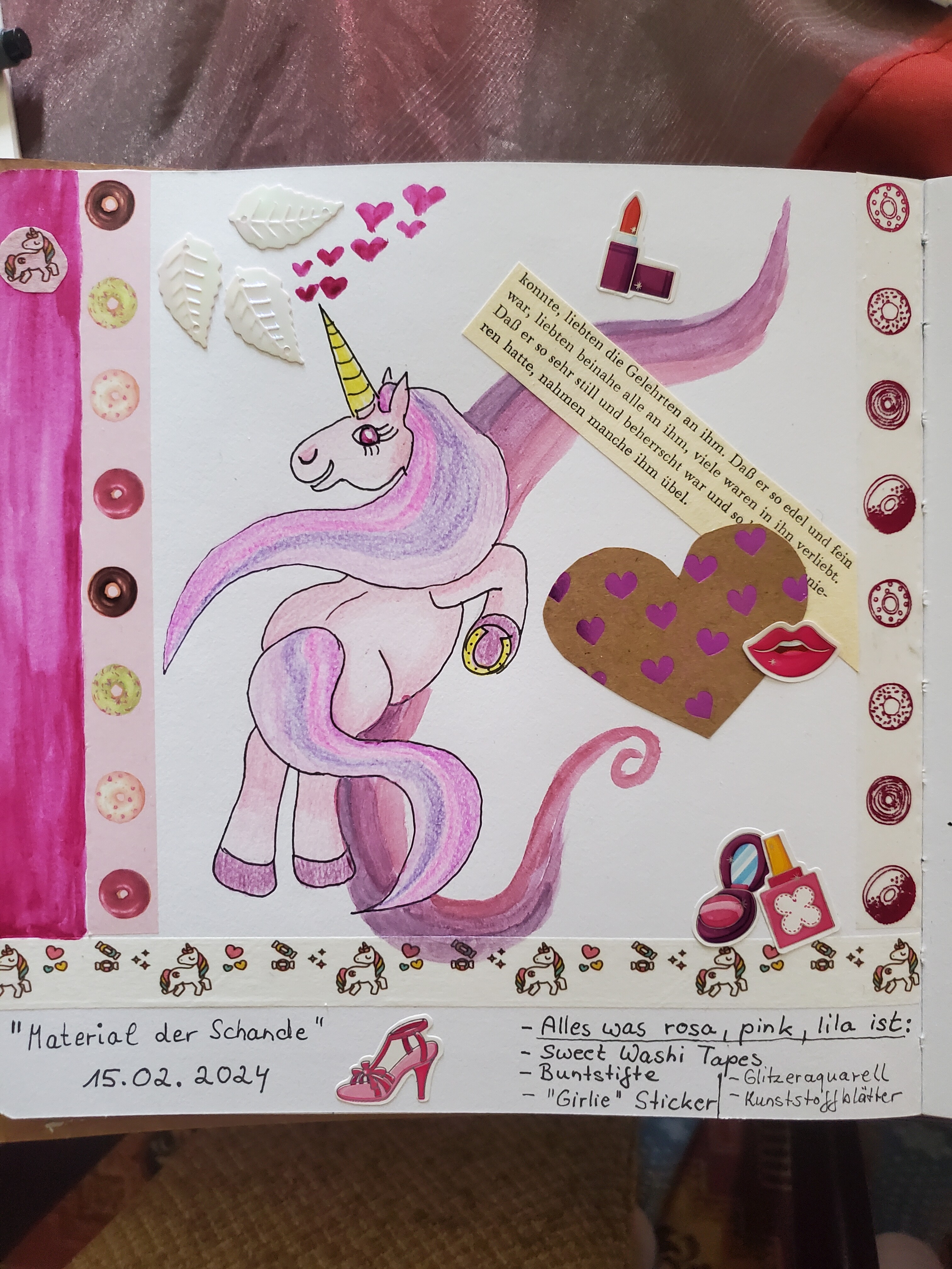 Ich habe als " Material der Schande" mal etwas in rosa, pink, lila Tönen gewählt. Die werden bei mir besonders “stiefmütterlich” behandelt. Buntstifte kommen zu kurz, Glitzeraquarell, “Girlie” Sticker, Washitape aus einem Sortiment das man unbedingt haben musste (wegen einer Rolle), dünnes Motivpapier… :
