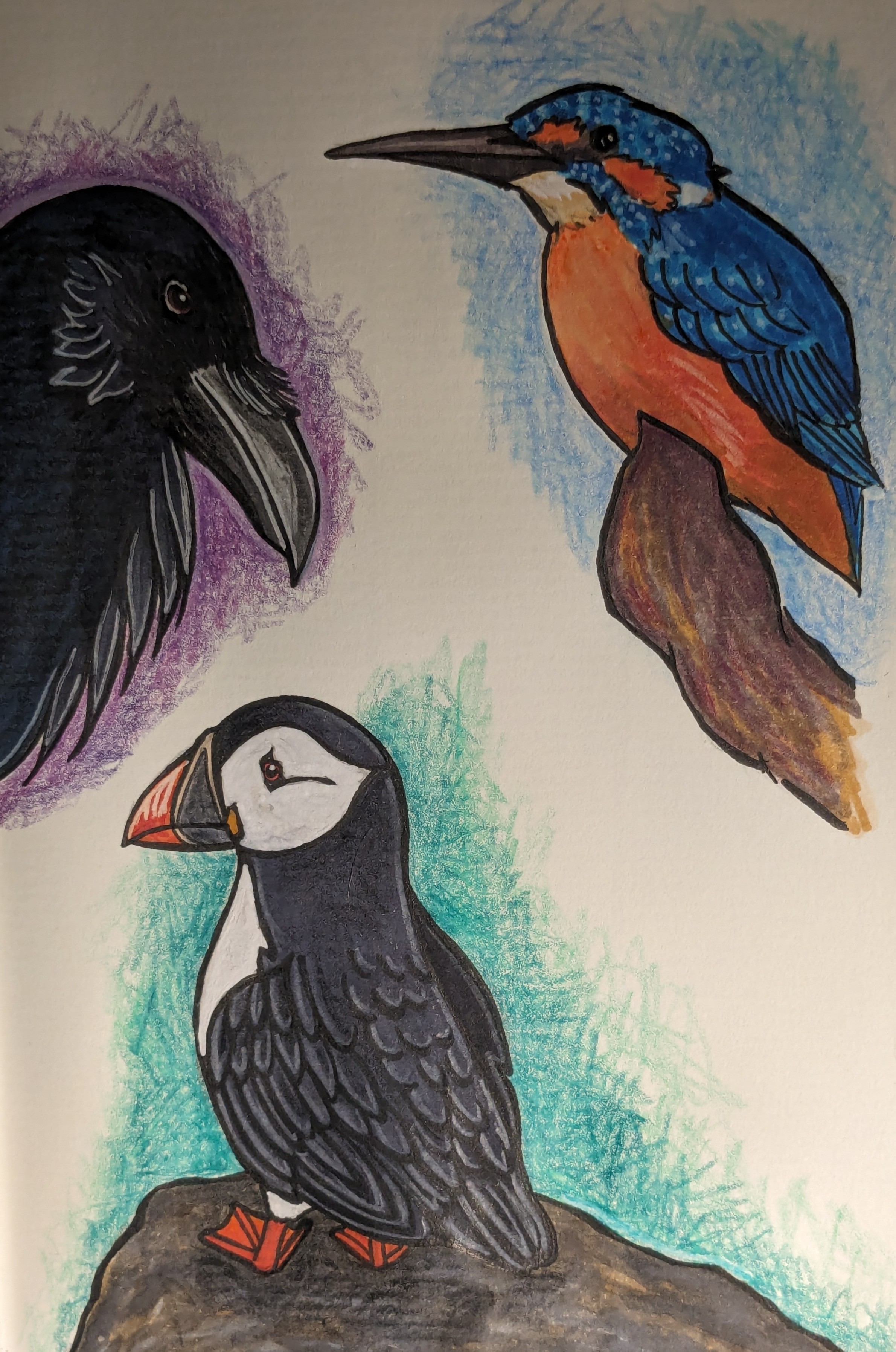 Der Eisvogel ist schon etwas älter, aber auch mit Materialien der Schaden (Alko Marker und Lidl-Buntis), Rabe und Puffin sind mit Aquarell Marker und Lidl Buntis.