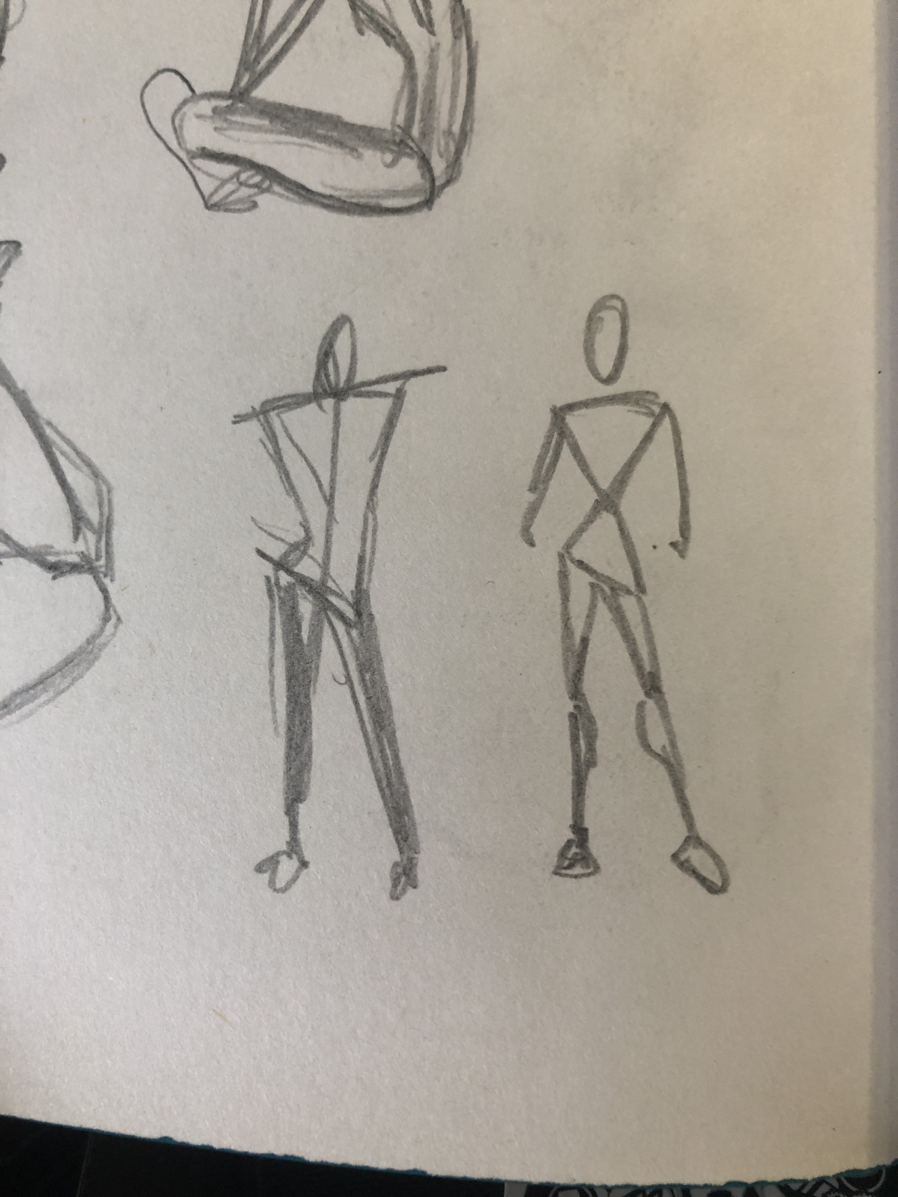Es geht um die beiden Striche der Figur links. Der Richtungsstrich für Schulterstellung und für Hüftstellung. Schaut euch nochmal die Modeübersicht an, auch da sind die Striche immer unterschiedlich zu setzen und definieren am Ende, wie die Beine stehen können und wie die Linien des Oberkörpers verlaufen können. Tatsächlich fange ich mit diesen beiden Strichen an. Hilft mir auch, wenn ich den Hintergrund schon habe und die Figur dann da rein soll.