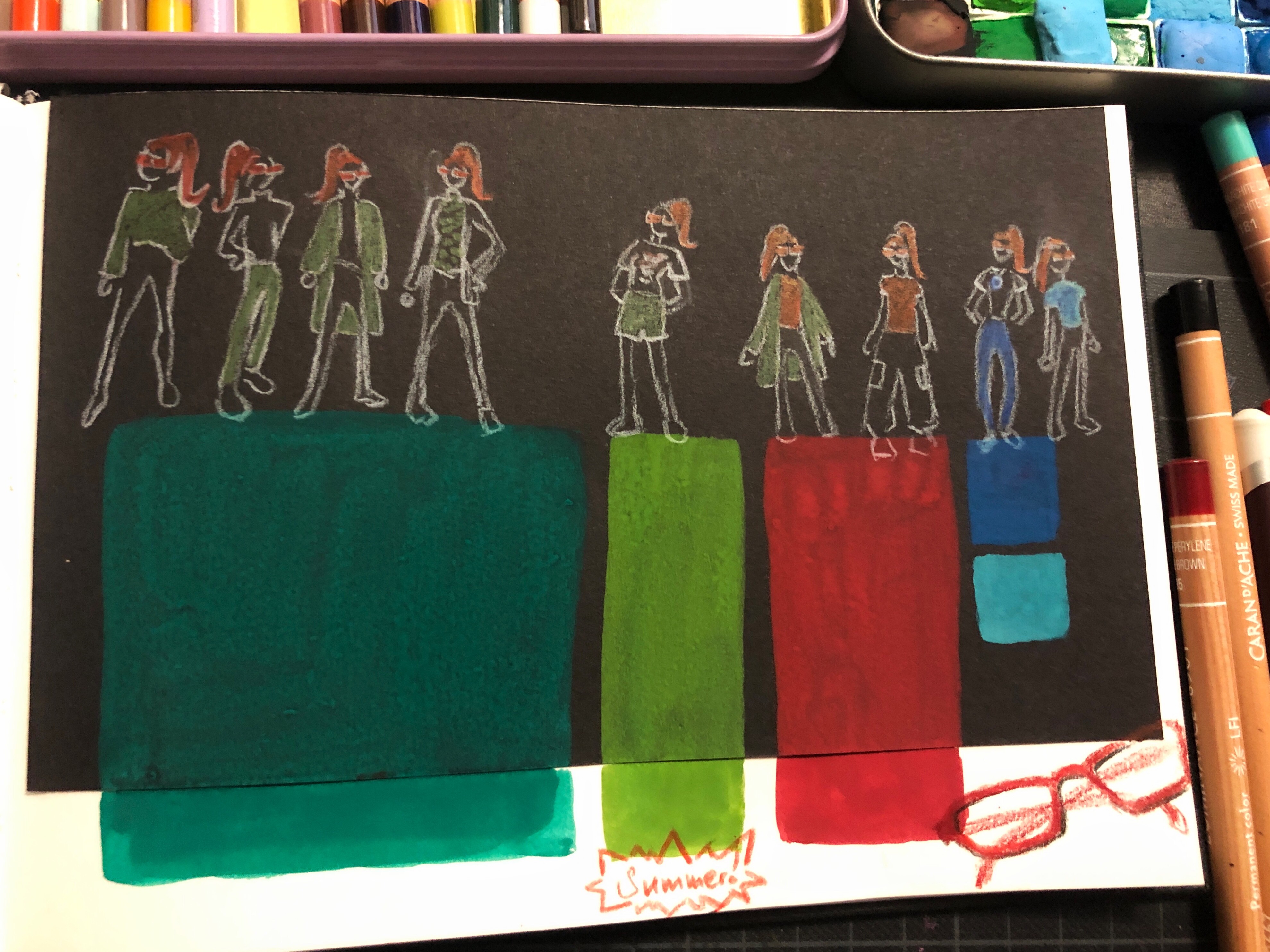 Heute kramen wir genau sowas raus und benutzen das. Dabei bitte nicht zu viel Druck verspüren. Mein ewiges Material der Schande sind die 40 Neocolor 2 die ich habe und natürlich muss ich nicht alle 40 Kreiden benutzen. Es reicht, wenn man zumindest eine benutzt oder eben so viele wonach es sich gerade anfühlt. Vielleicht auch in Kombination mit einem vertrauten Material, das nimmt den Druck. Über die geliebten Aquarellfarben etwas Glitterfarbe sparklen, die man sonst nie nutzt. Die Kreiden als Akzente verwenden statt eine reine Kreideseite.