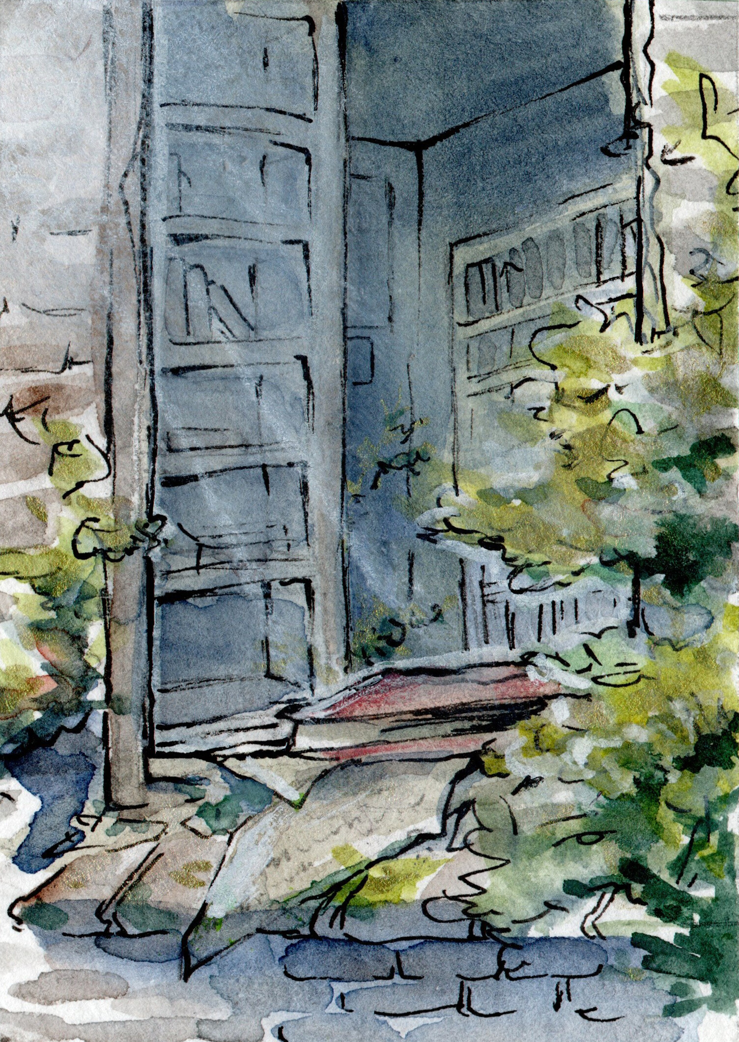 - Einen Vorgarten mit Andeutung von Haus / Bauernhaus / Scheunentor oder ähnlichem im Urban Sketching Style, z.B. wie hier oder wie hier ein etwas ausgearbeiteter Vorgarten. Hauptsache Pflanzen mit dem urbanen verbinden