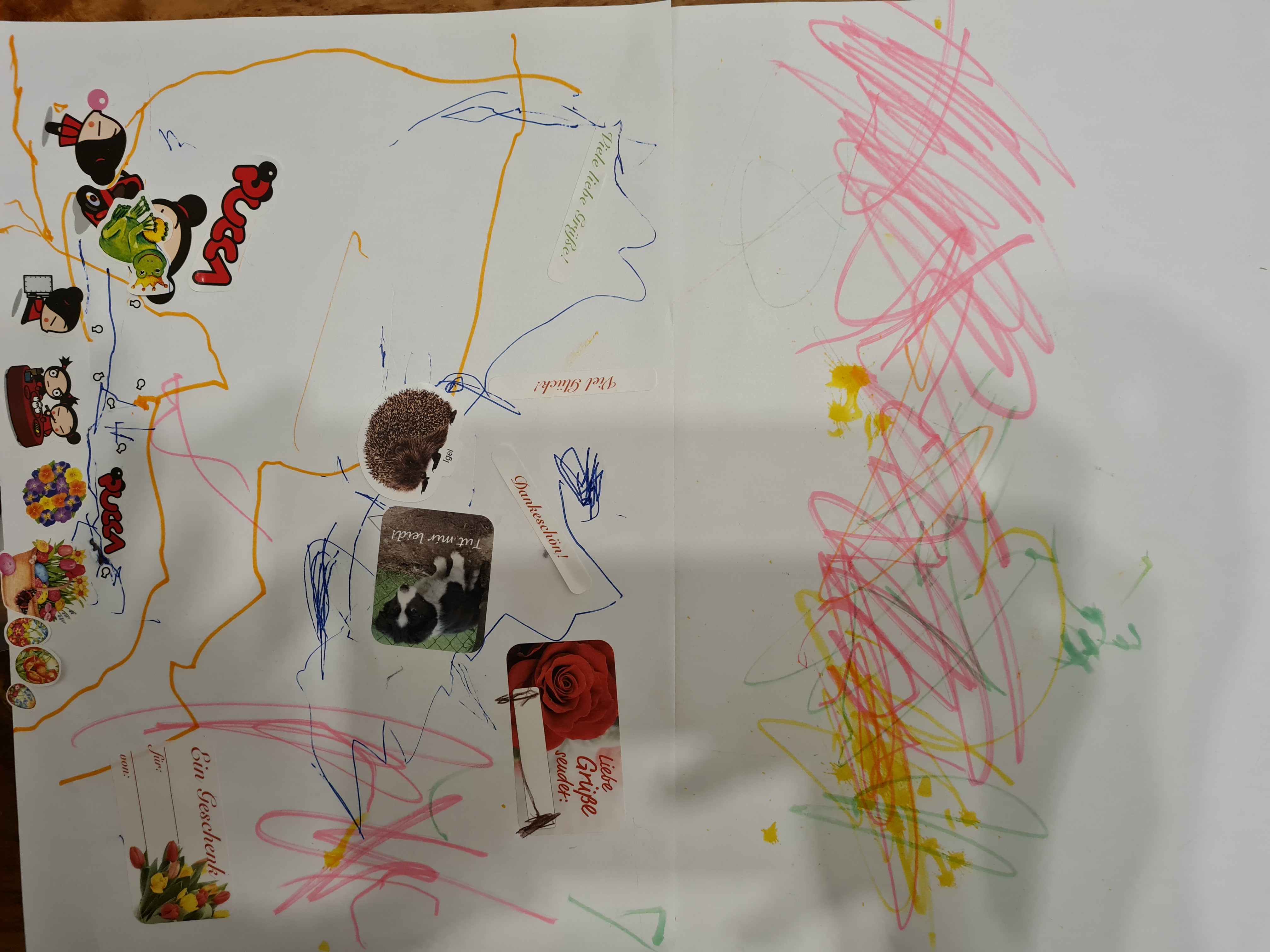 Diese zwei direkt entstanden “Kunstwerke” haben tatsächlich eine ausführliche Geschichte während des Schaffens erzählt: zu sehen ist der Kindergarten, wo ein Kind zu spät zum Frühstück kommt und der Froschkönihpolizist verhaftet das Kind auf dem Motorrad und das Kind mit dem Kaugummi weil das dürfen Kinder nicht :D"