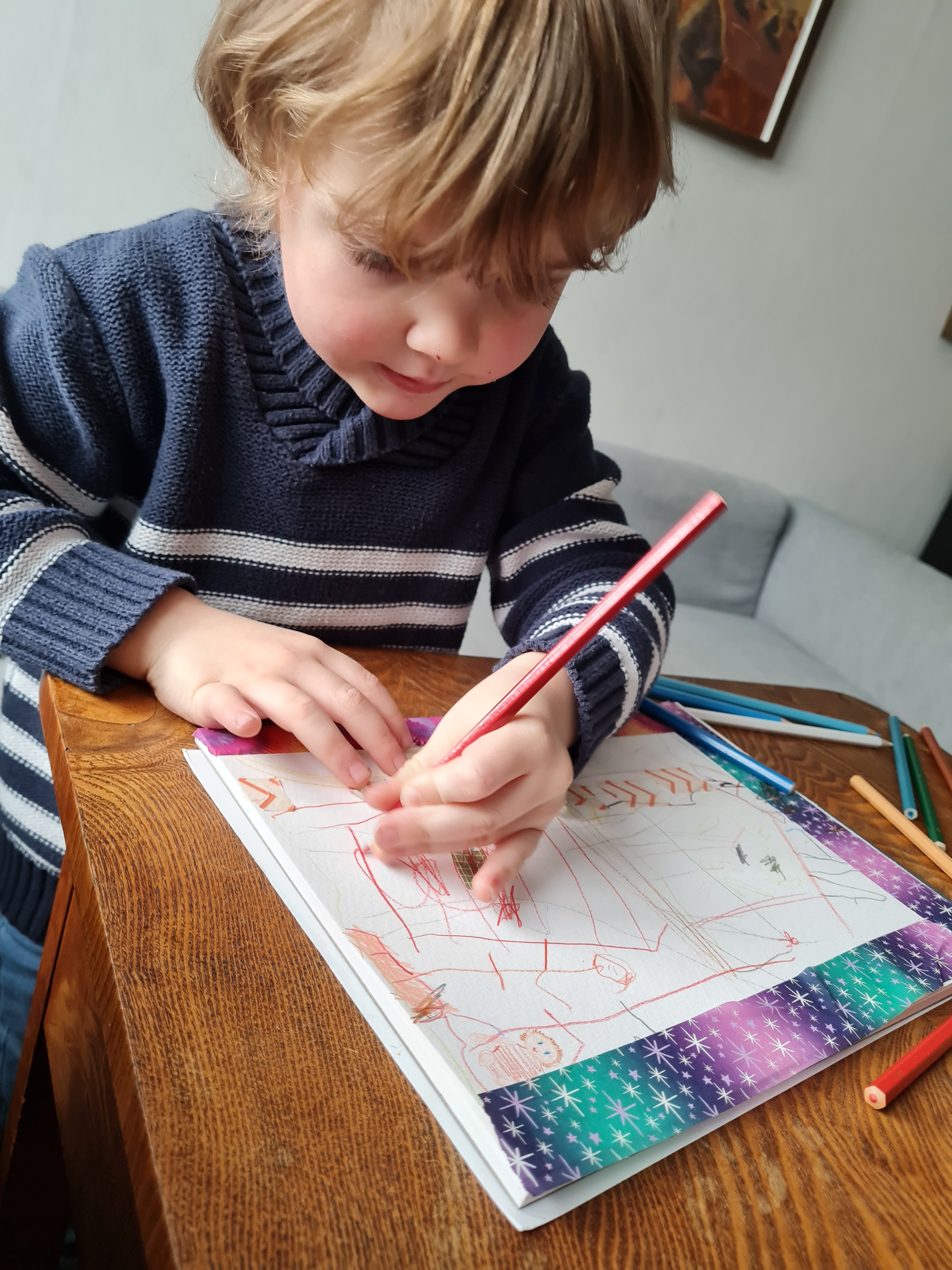 Mein Großer hat wie er gehört hat, dass es ein Kakao-Paket ist auf Verdacht alle seine “Pipi-Punkte” eingelöst: für 12 Punkte kann er sich eine “Bastelüberraschung” kaufen ;D der konnte seinen Augen auch kaum trauen, als nicht nur Buntstifte, sondern auch Washi-Tapes und Wasserfarben aus dem Paket kamen :D die nächsten 4 Stunden war er tief konzentriert mit malen beschäftigt :P