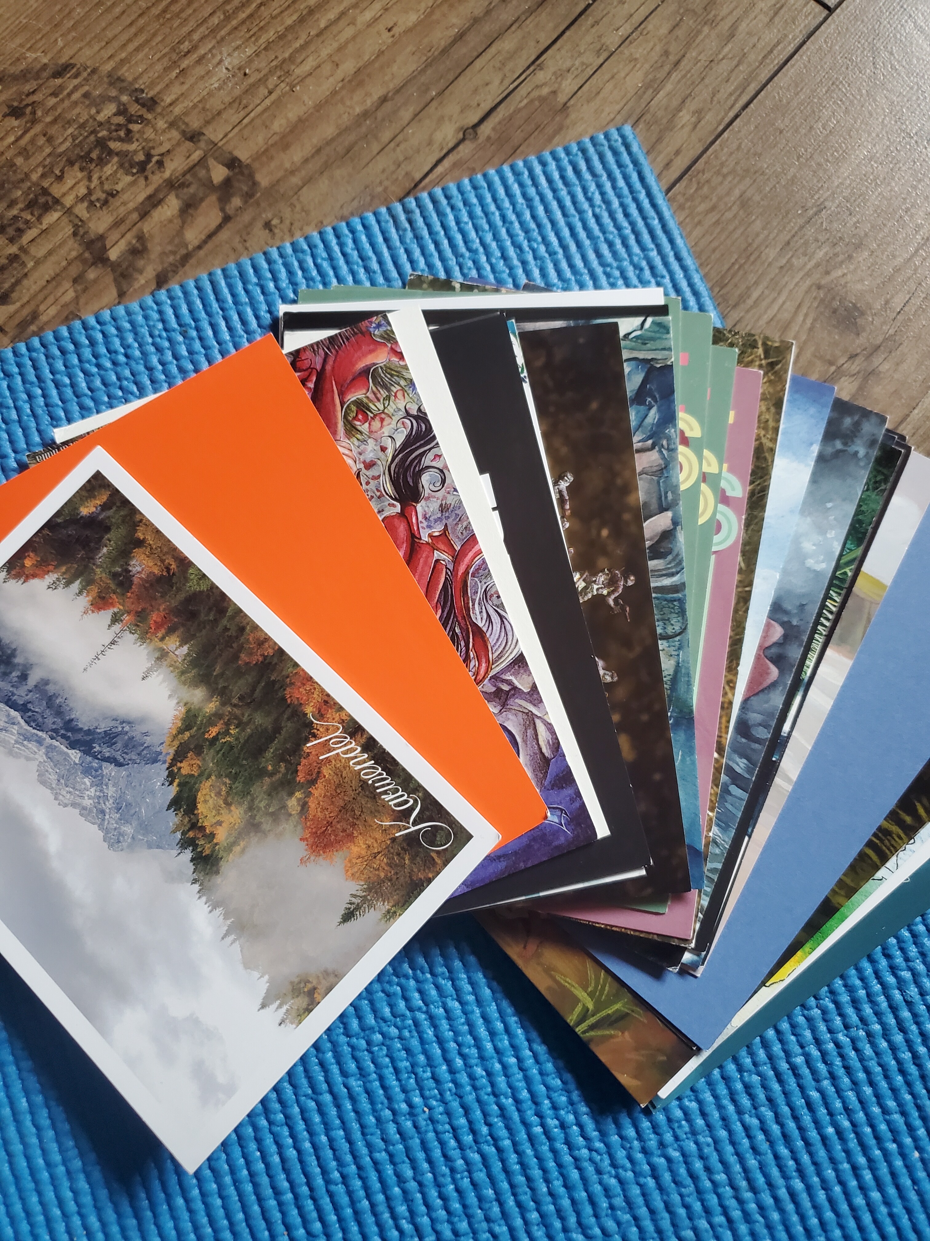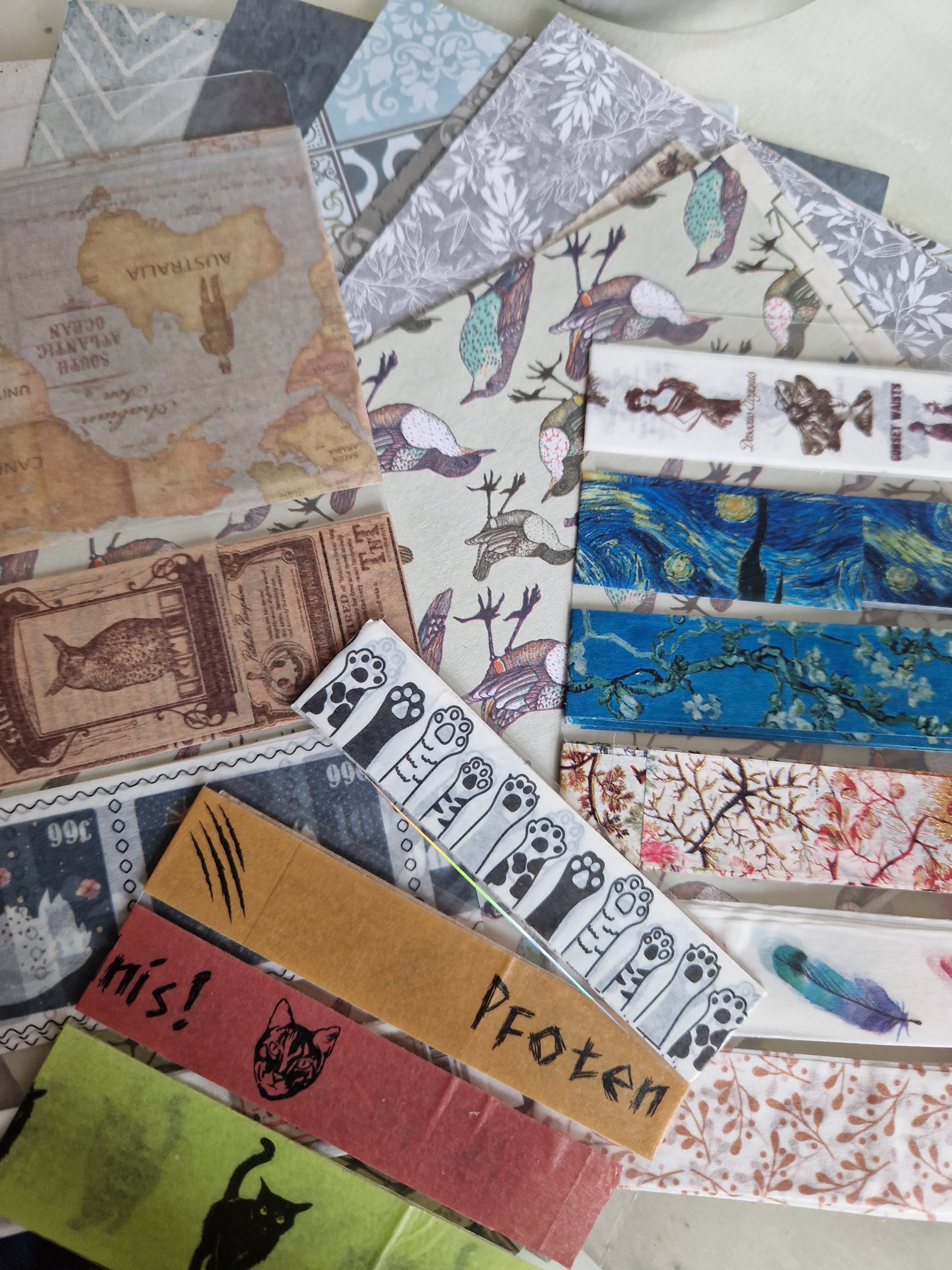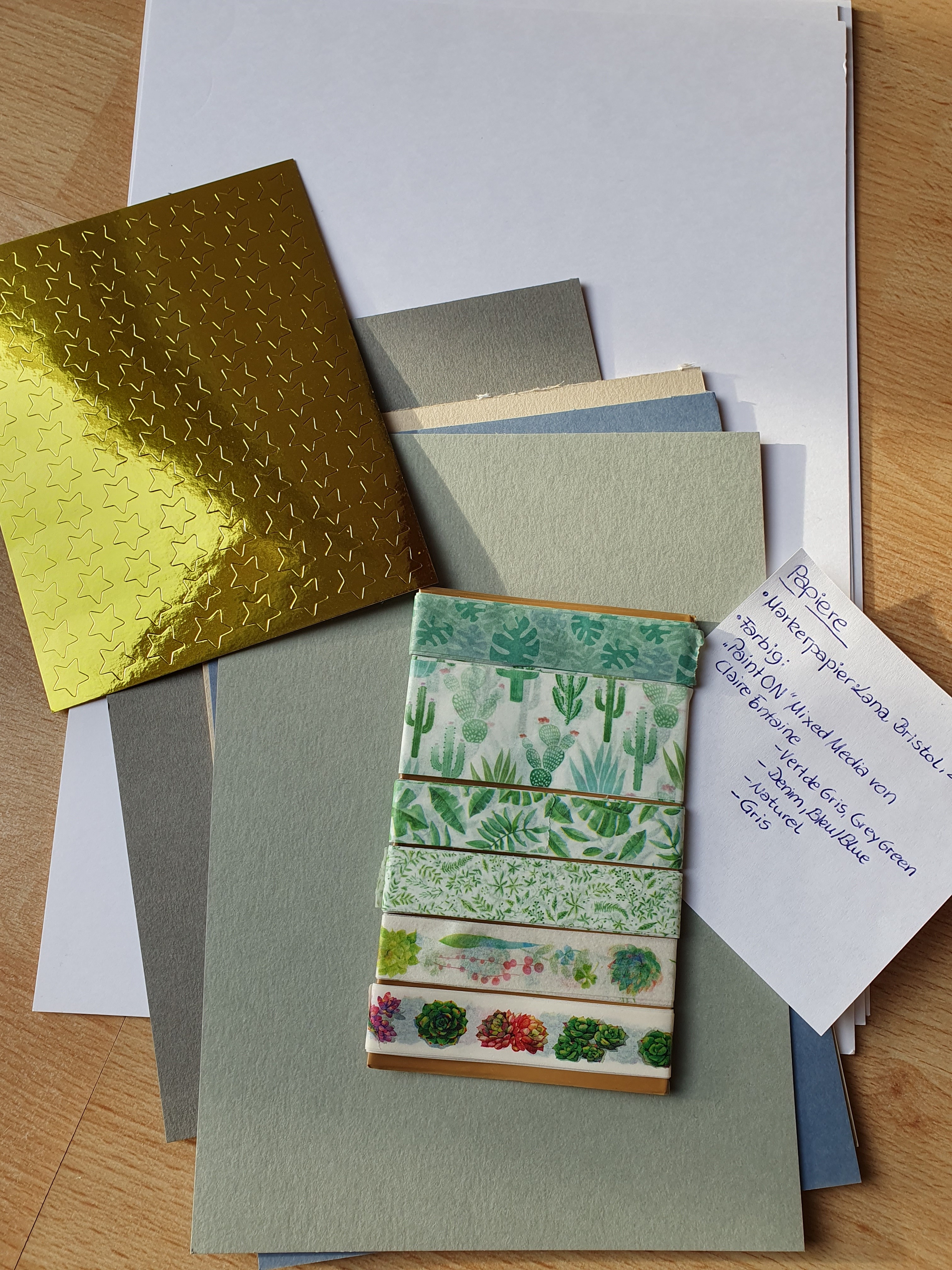 CaitlynMurphy schickte mir viiieeeeeele spannende Maluntergründe: Kraftpapier, Steinpapier, Holzfurnier, braune Blanko-Postkarten, diverse getönte Papiere (die ich nachher noch mal in aller Ruhe sichten und testen muss) und ein spannendes Skizzenbuch mit schwarzem Papier, auf das ich mich schon sehr freue - von der Marke hatte ich schon mal ein Skizzenbuch mit hellem Papier (aus einem Adventskalender, wenn ich mich recht erinnere) und war sehr zufrieden, und das scheint jetzt die gleiche Papierstruktur zu sein, nur in dunkel. YAY!