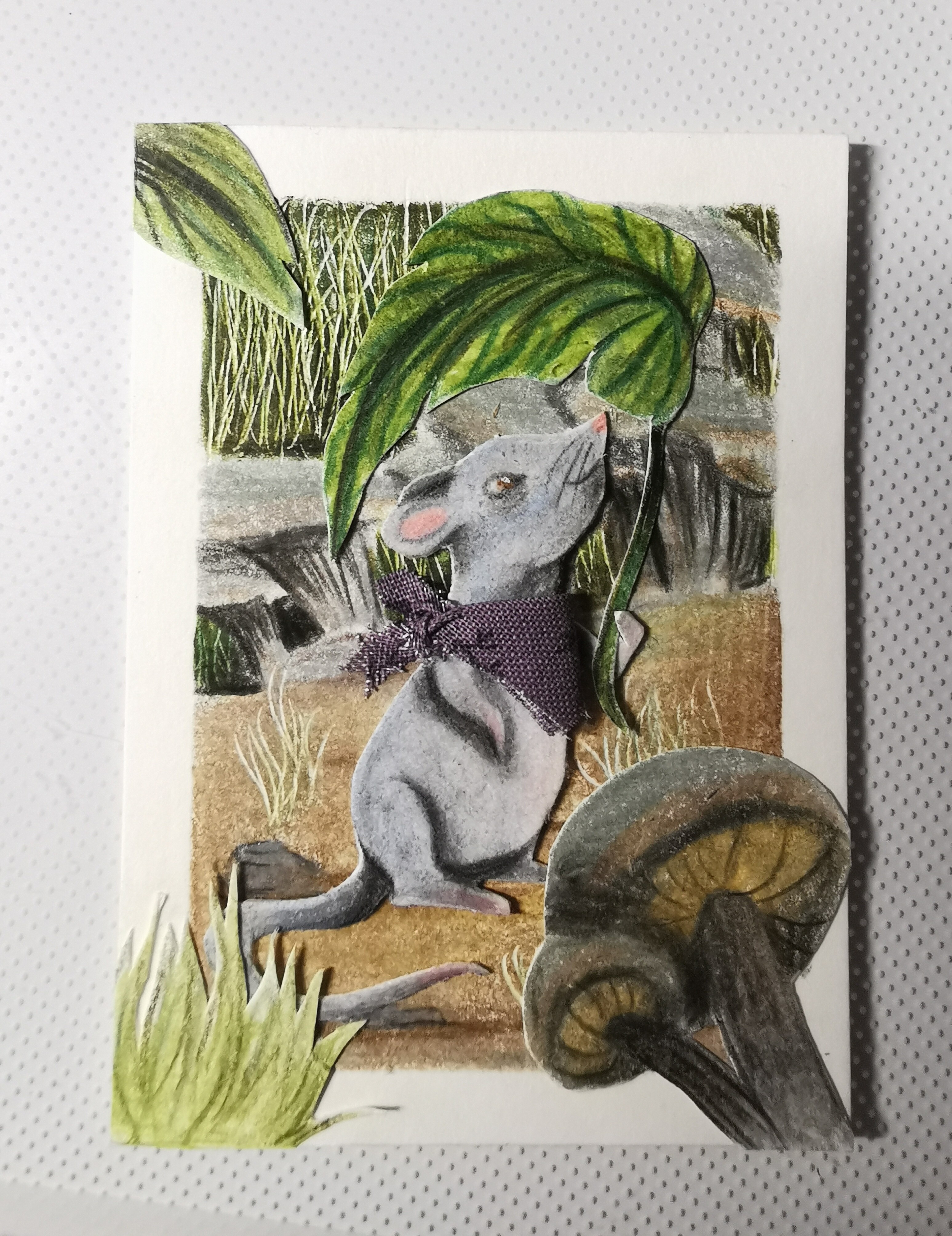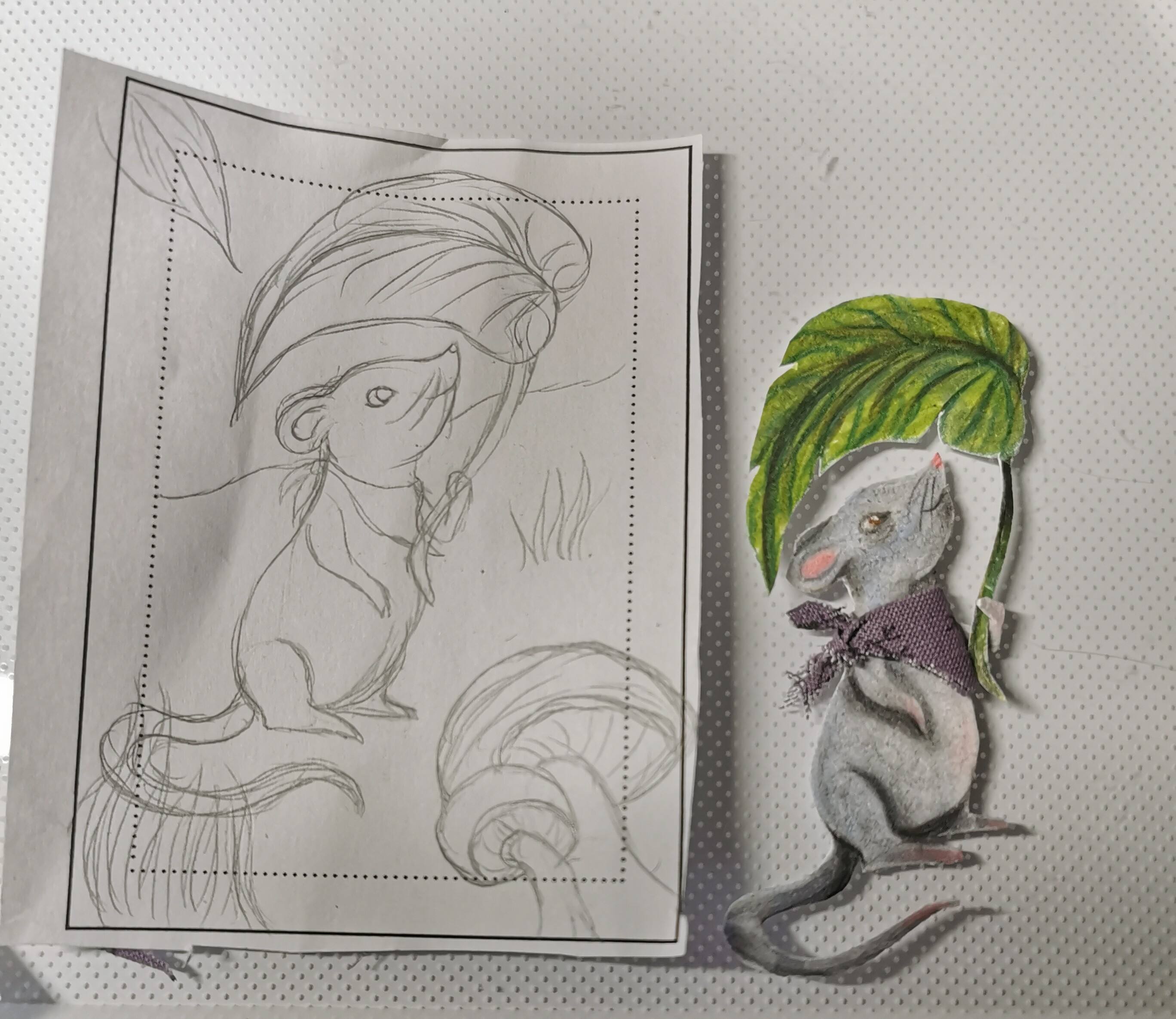 Die Bastelelemente sind okay und haben wie vorab auch besprochen, aber der Rand gefällt mir leider nicht. Das Motiv wird dadurch nur auf die Maus reduziert und eigentlich mag ich die Karte weil alle Komponente so gut stimmen: die Maus in der Mitte, die Landschaft drumherum und die Atmosphäre eines Regentages.