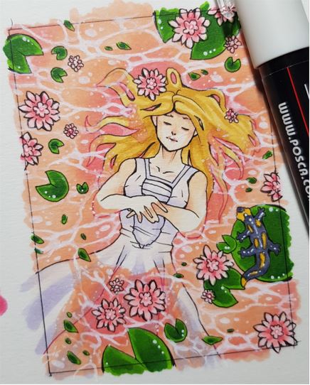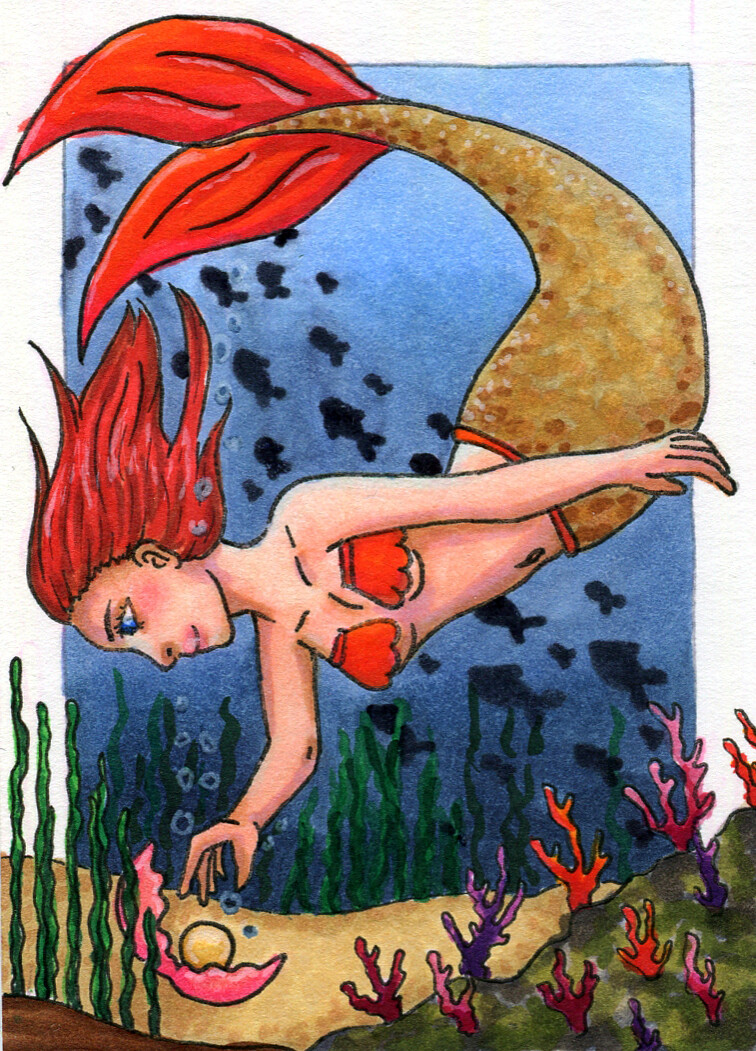 Sehr hübsche Karten so weit schon! Wäre es aber vielleicht möglich, die übermalten Stellen bei der Meerjungfrau mit Tusche/Gelstift/sonstiger weißer Farbe ein bisschen zu korrigieren? Gerade das Rot und Orange auf dem weißen Rahmen sticht sehr ins Auge und lässt die Karte etwas unsauber wirken