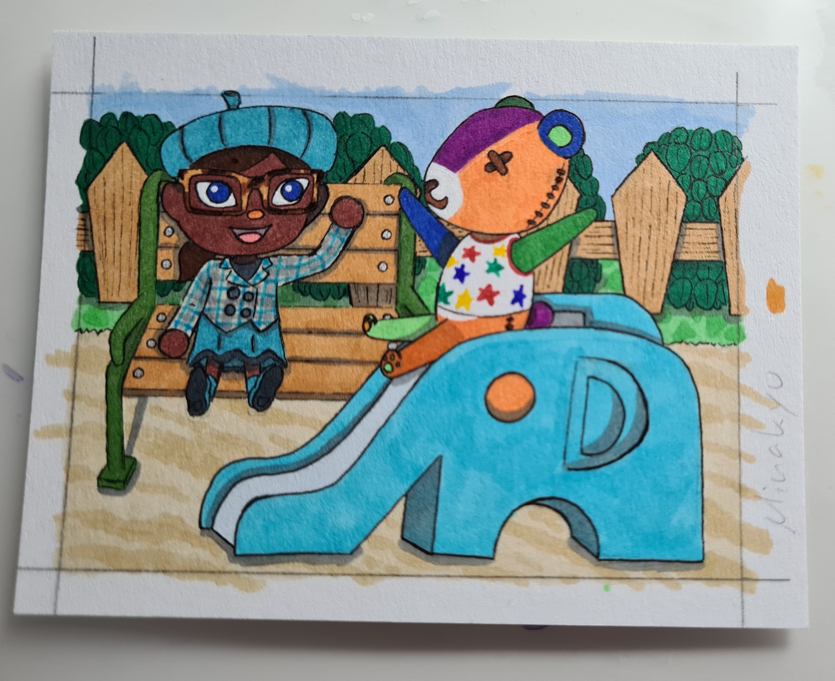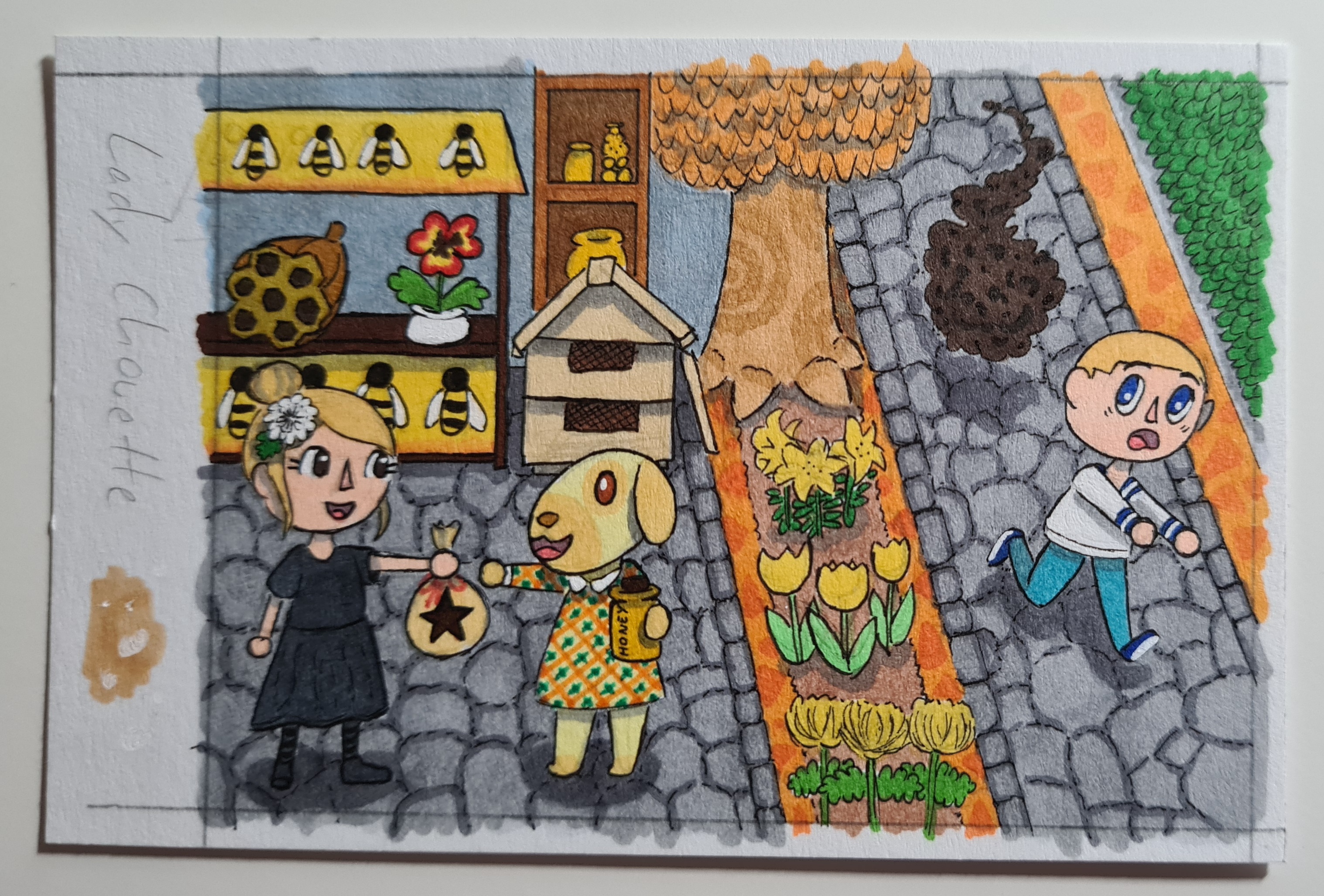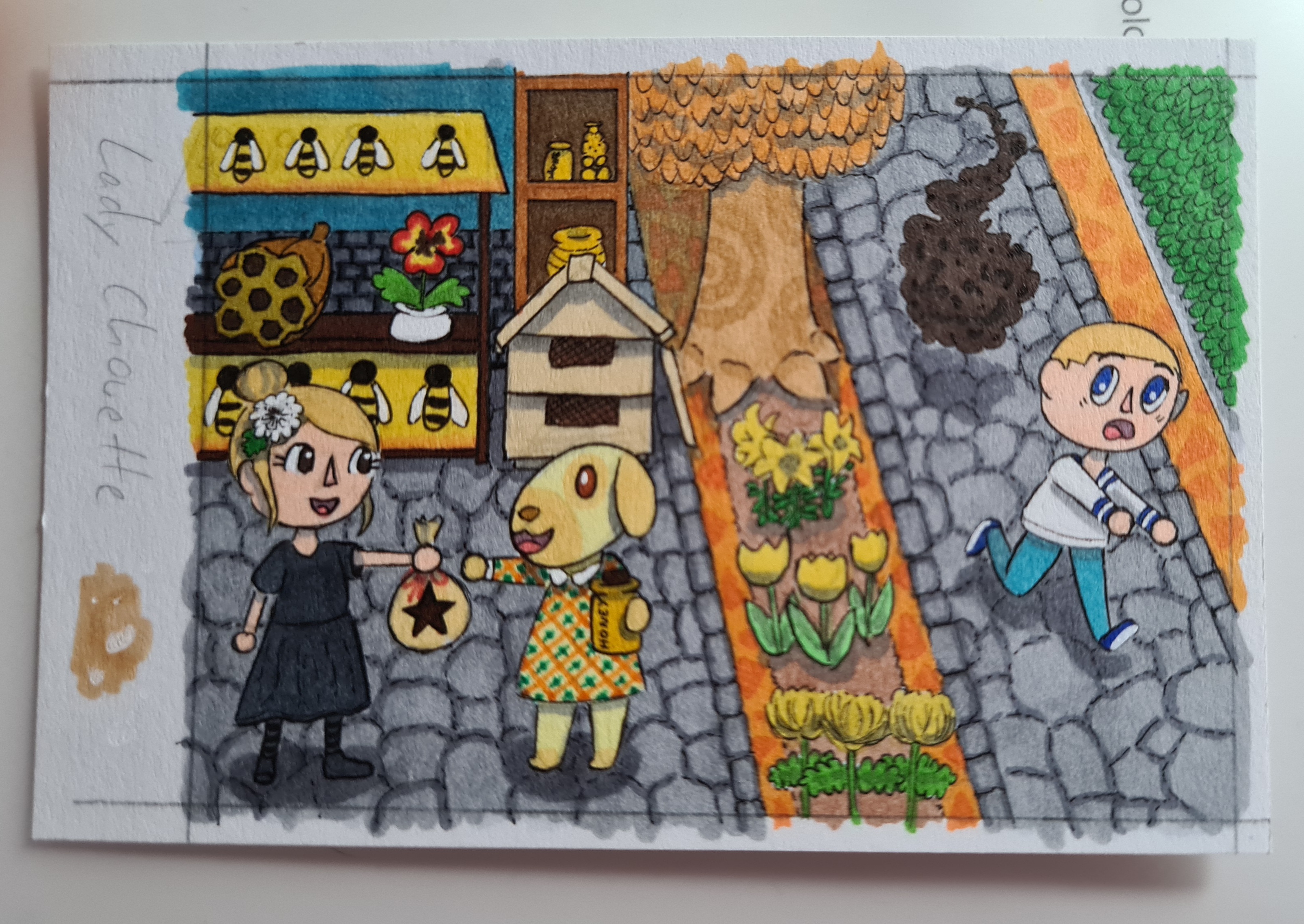 Meine Karte für @Lady_Chouette … leider habe ich wohl irgendwie Raum und Zeit verbogen, da hinter dem Honigstand direkt der Himmel zu sehen ist, während der Weg rechts bis nach hinten geht