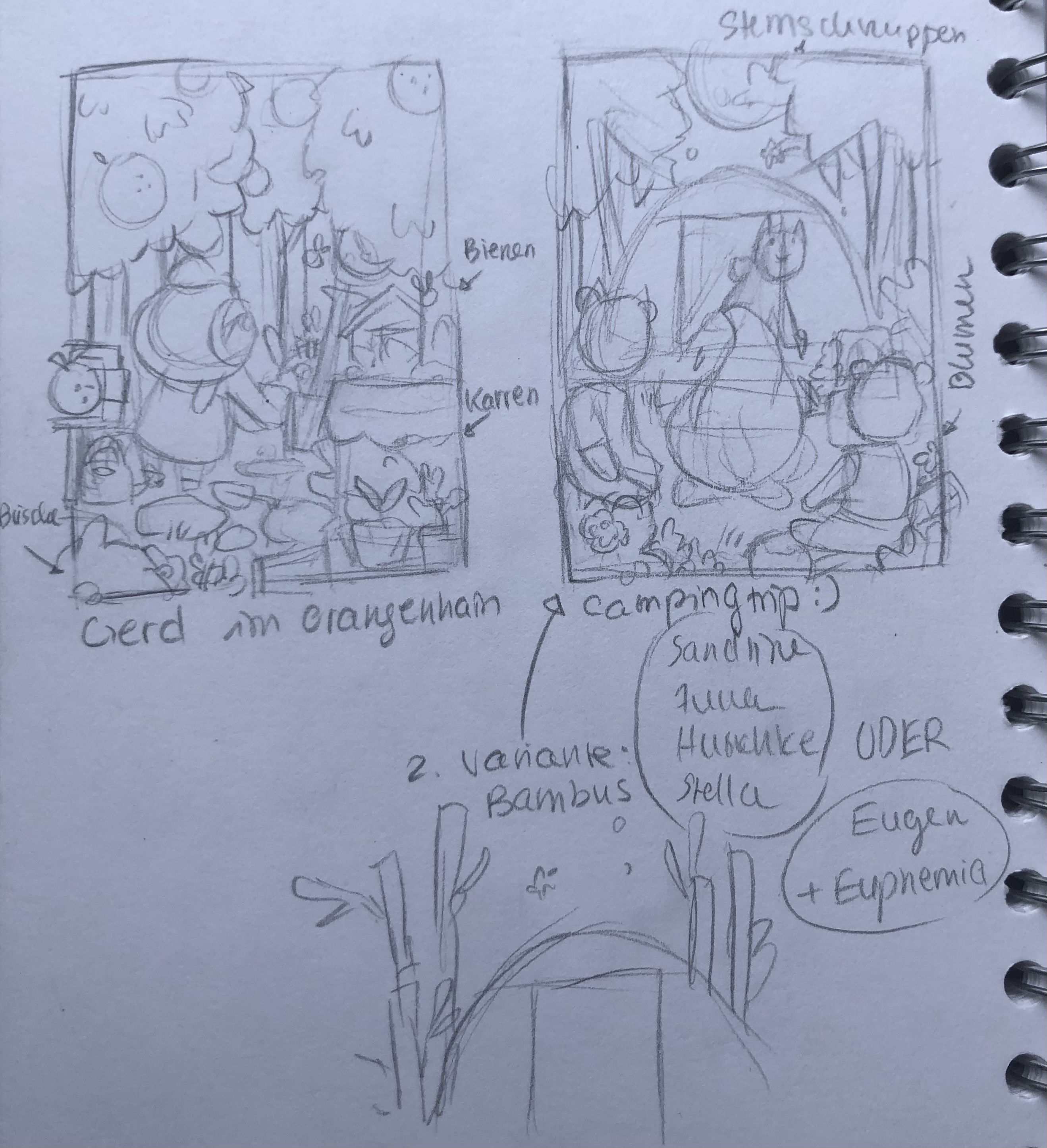 Rechts dann etwas, dass mich eben bei nochmaligem Lesen deiner Wünsche angesprochen hat. Und zwar eine Campingszene mit Lagerfeuer und ein paar Baumstammmöbeln. Ein paar deiner Bewohner haben beschlossen, Zelten zu gehen, ich dachte dabei an Juna, Sandrine und Stella. Und fand, dass Bambus statt der Bäume als Umgebung auch gut passen würden, das wäre ebenfalls deine Entscheidung. Es könnten auch Eugen und Euphemia sein, die Sternschnuppen schauen gegangen sind, davon gibt es nämlich auch welche zu sehen :D
