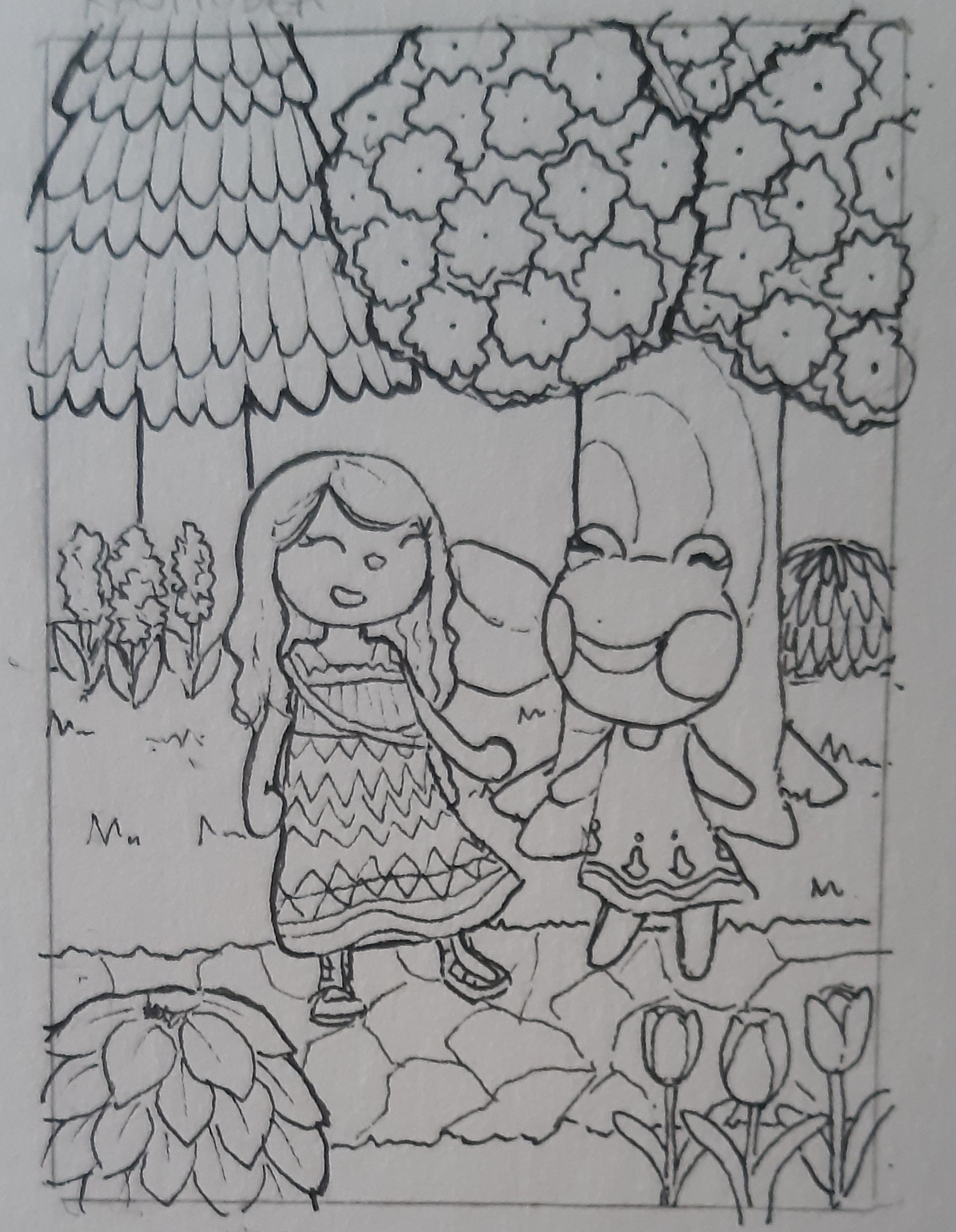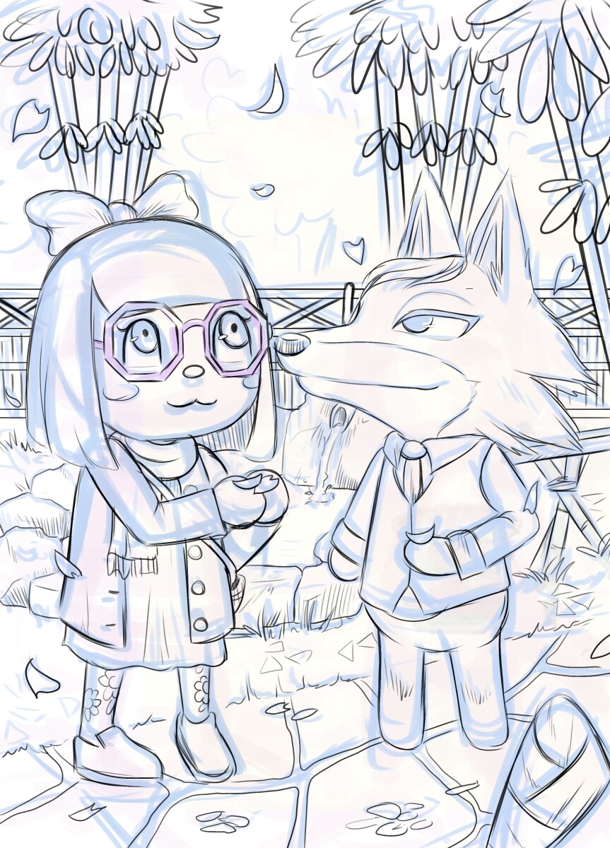 Ich hoffe, dass dir der Entwurf zusagt (und dass es dir nichts ausmacht, dass ich dir ebenfalls einen Wolf - deinen Sascha - gezeichnet habe. Ich hab ein persönliches Problem mit Ziegen, darum konnte ich deine anderen beiden Lieblingsbewohner leider nicht umsetzen x’'D;;;. Sollte dir das nicht zusagen, kann ich dir aber auch schauen, dass ich z.B. Julia zeichnen, sie mag ich auch gern, hatte sie selbst ne zeit lang als Bewohner).