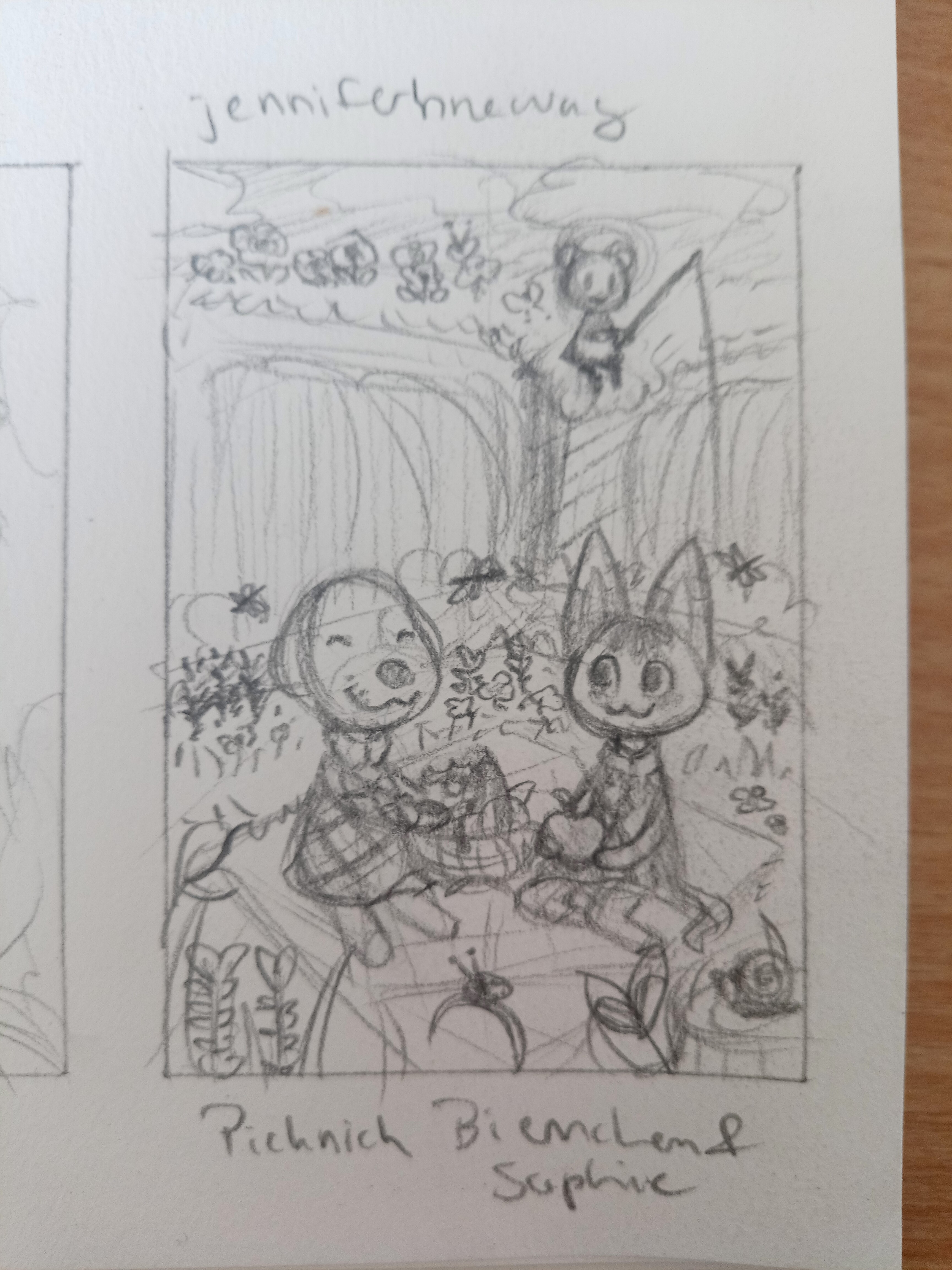 Die Karte wird unglaublich umfangreich, weshalb die Detailgenauigkeit ein wenig drunter leiden könnte, was so einzelne Elemente angeht… auf jeden Fall sind Bienchen und Sophie bei einem Picknick zu erkennen. Dabei habe ich versucht als Hintergrund den Ort aus deinen Fotos zu kopieren, an dem Wasserfall. :) Es schwirren am Wasser einige Flussjungfern umher. Am Wasser wachsen Stauden (Unkraut) auf und im Wasser wird etwas Schilf stehen. Im Vordergrund ist auf dem Baumstumpf unten rechts eine Schnecke und auf dem Grashalm mittig ein Marienkäfer zu erkennen. Im oberen Teil des Bildes sitzt eine kleine, stilisierte Misuzu auf dem Hangvorsprung und angelt. Um sie herum wachsen die gelben Stiefmütterchen auf und es fliegen Schmetterlinge (die gelben und weißen der Einfachheit halber) umher. Was die Tagesstimmung angeht wird es wohl bei einer Mittagsszene bleiben, damit ich mit dem Licht nicht noch mehr Chaos ins Motiv bringe. ^^ Die Essensgegenstände die die beiden in der Hand halten kann ich gerne auf Wunsch verändern. (Sophie Apfel, Bienchen Donut)