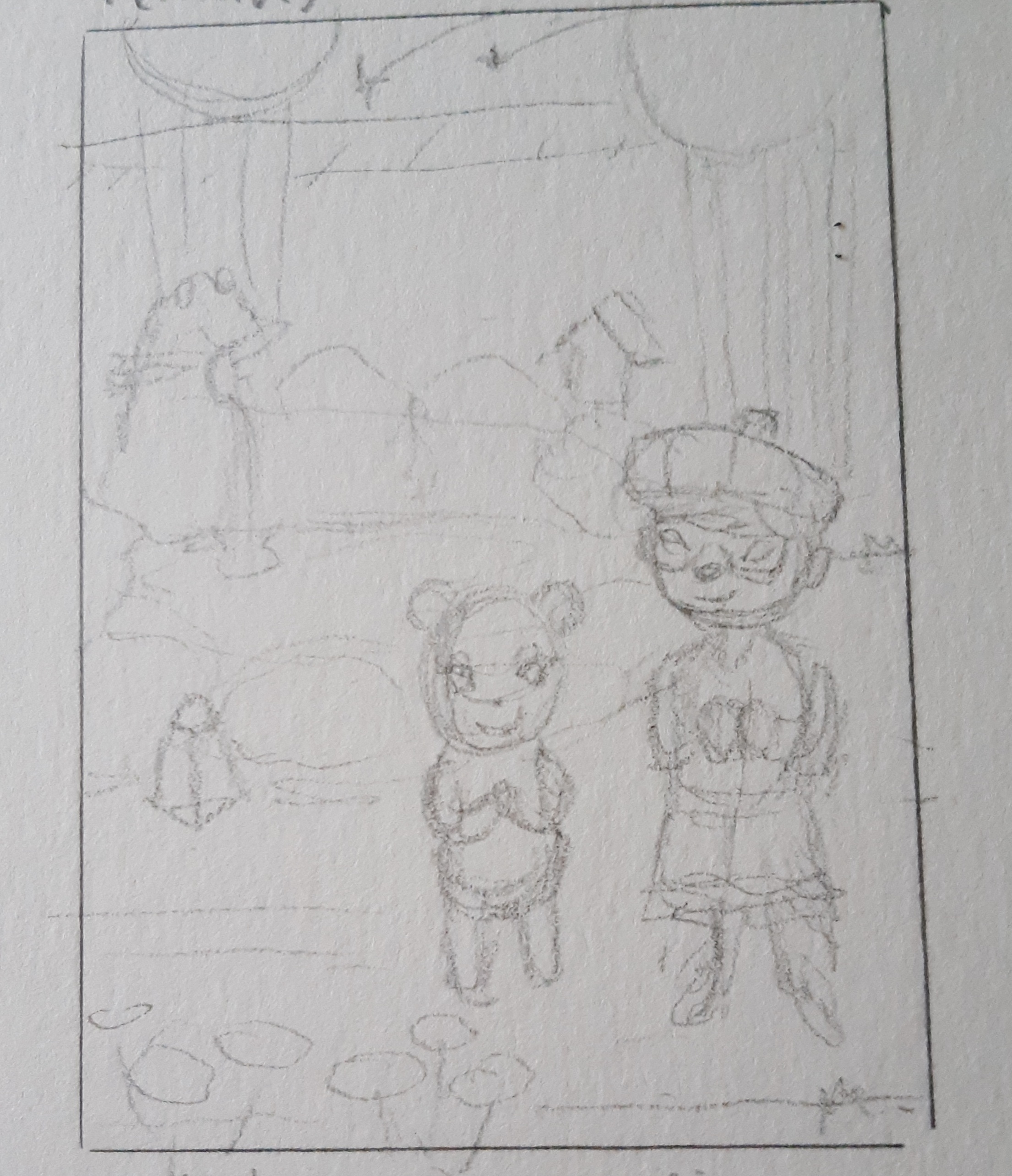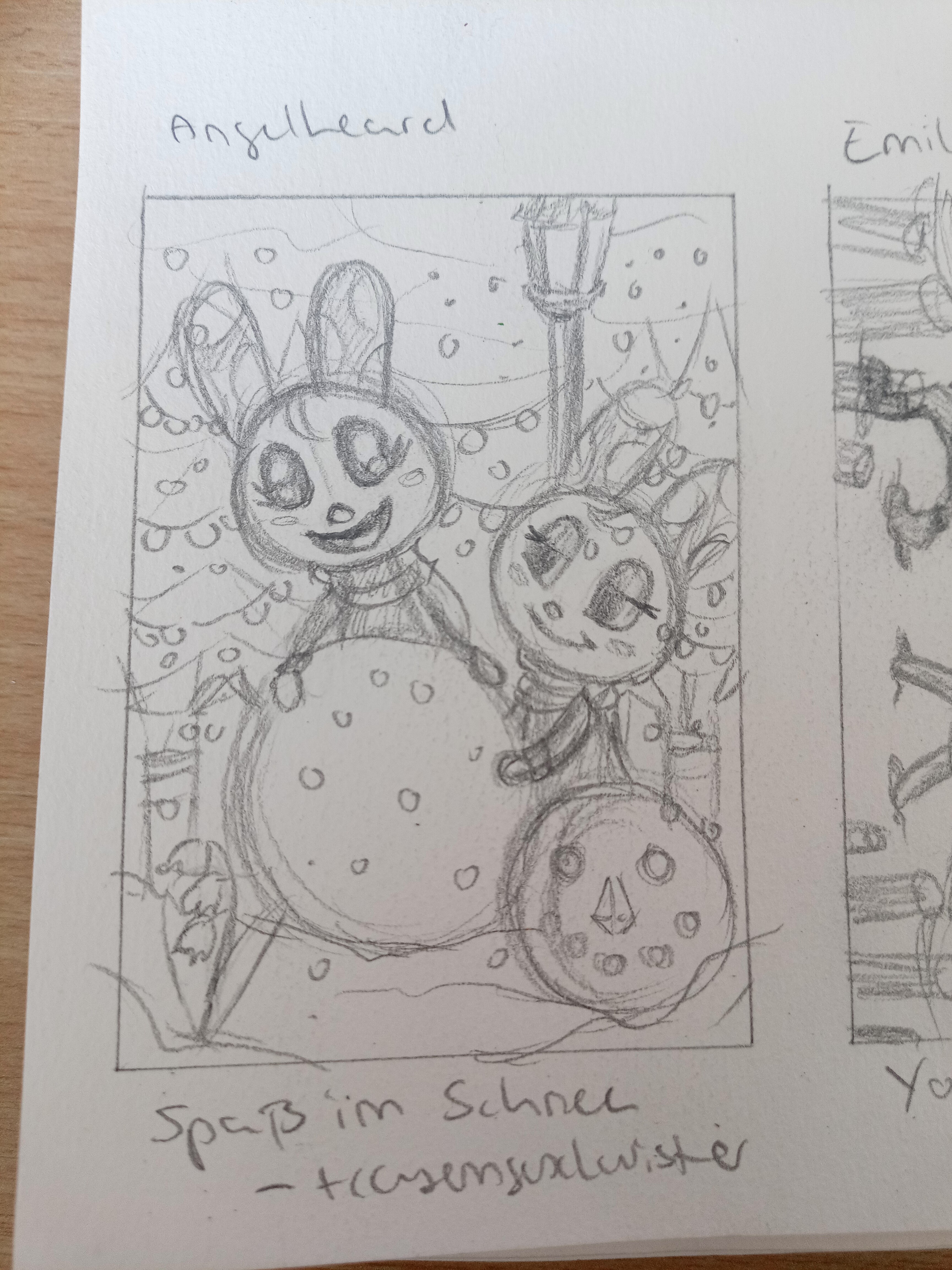 Gezeigt sind die beiden Hasengeschwister die zusammen einen Schnemil bauen. Es schneit leicht und die Tageszeit wird so früher Abend sein, so dass die Lichtstimmung in den rötlich-rosanen Bereich fallen wird. Im Hintergrund stehen Tannen mit Lichterketten. Im Vordergrund lugt ein Schneeglöckchen aus dem Schnee, davon kann ich gerne ein paar mehr malen…?