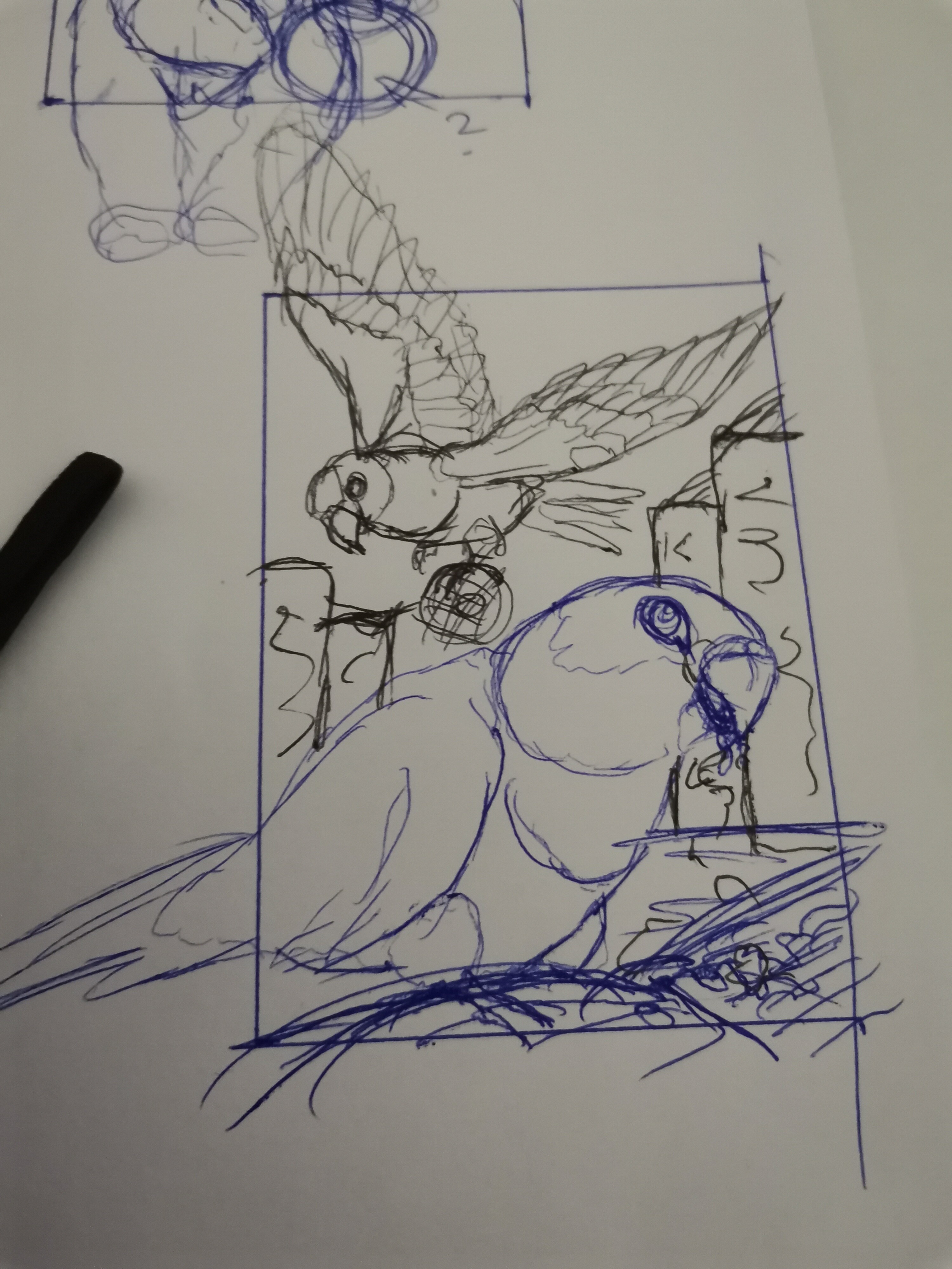 So, ich hätte auch mal ein paar Ideenskizzen im Angebot. Schaut mal, ob sie euch prinzipiell gefallen würden/ihr Anmerkungen habt. Sie sind noch recht grob aber ich hoffe man erahnt das wesentliche. Falls ihr sie gut findet würde ich gerne jeweils noch Referenzen nehmen, die zur Pose passen, falls vorhanden oder zu den Hg-Details, falls gewünscht. Dazu unten mehr.