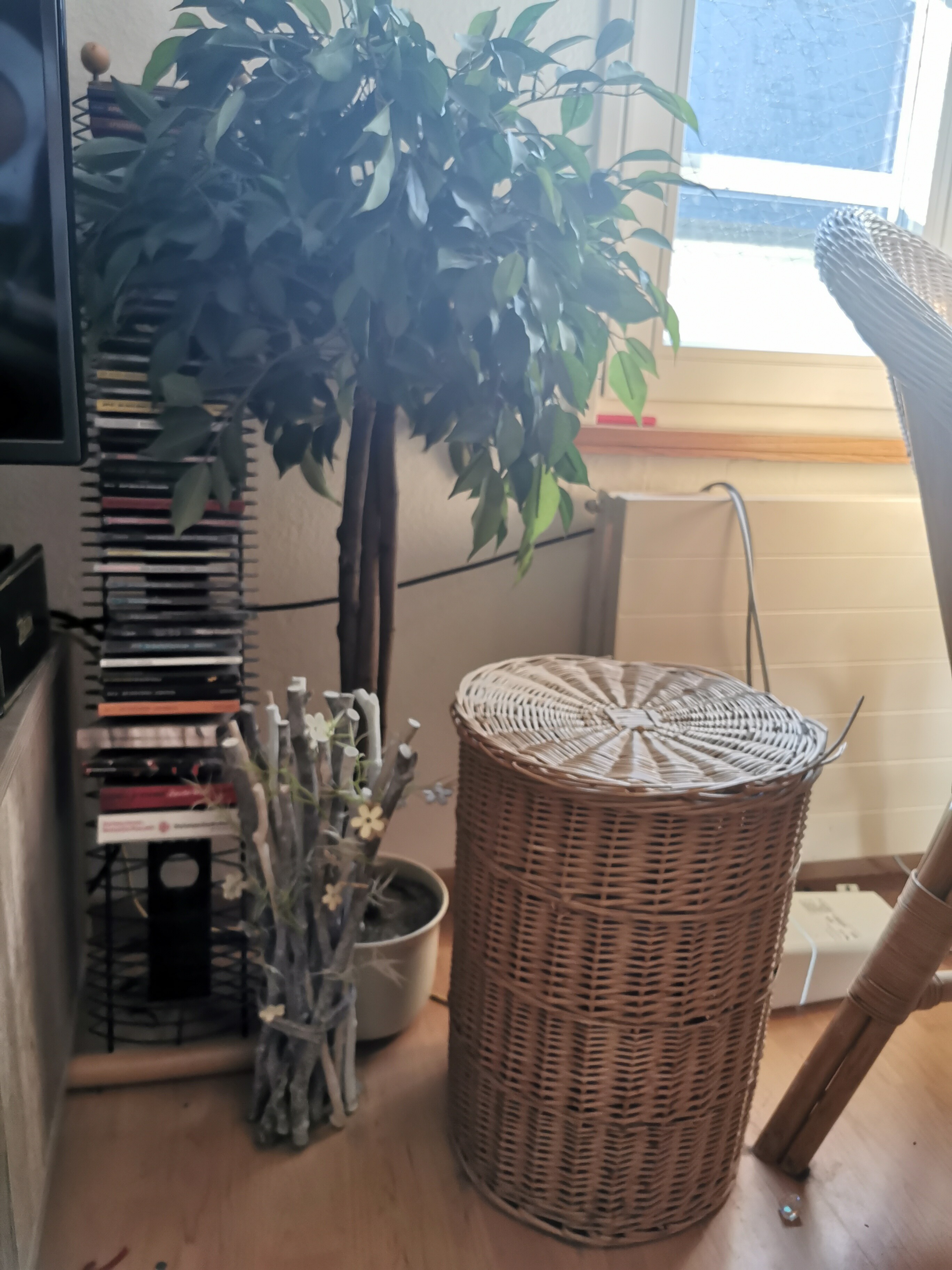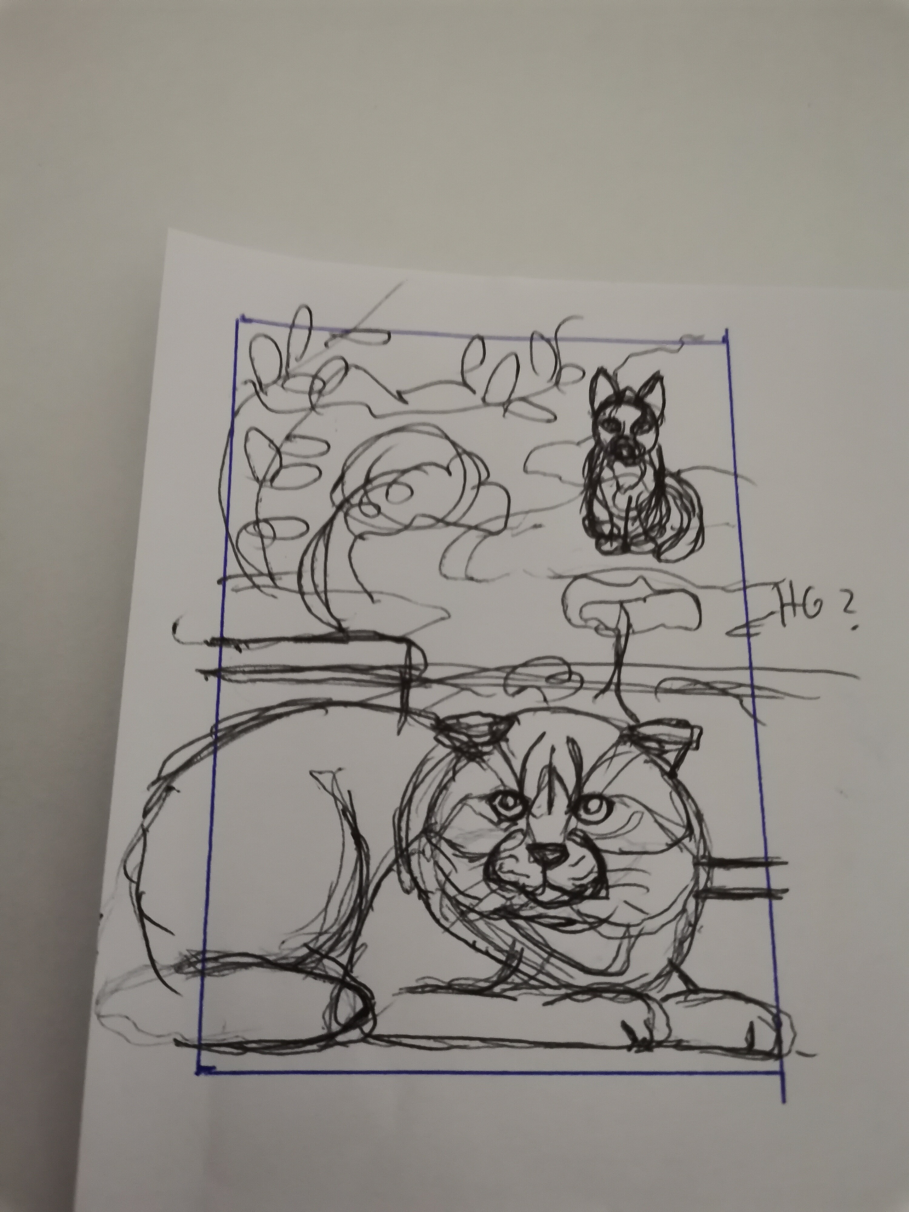 Die Idee ist Muknus, der im Fenster liegt. Eventuell eine Topfpflanzen mit auf der Fensterbank im linken Bildteil?