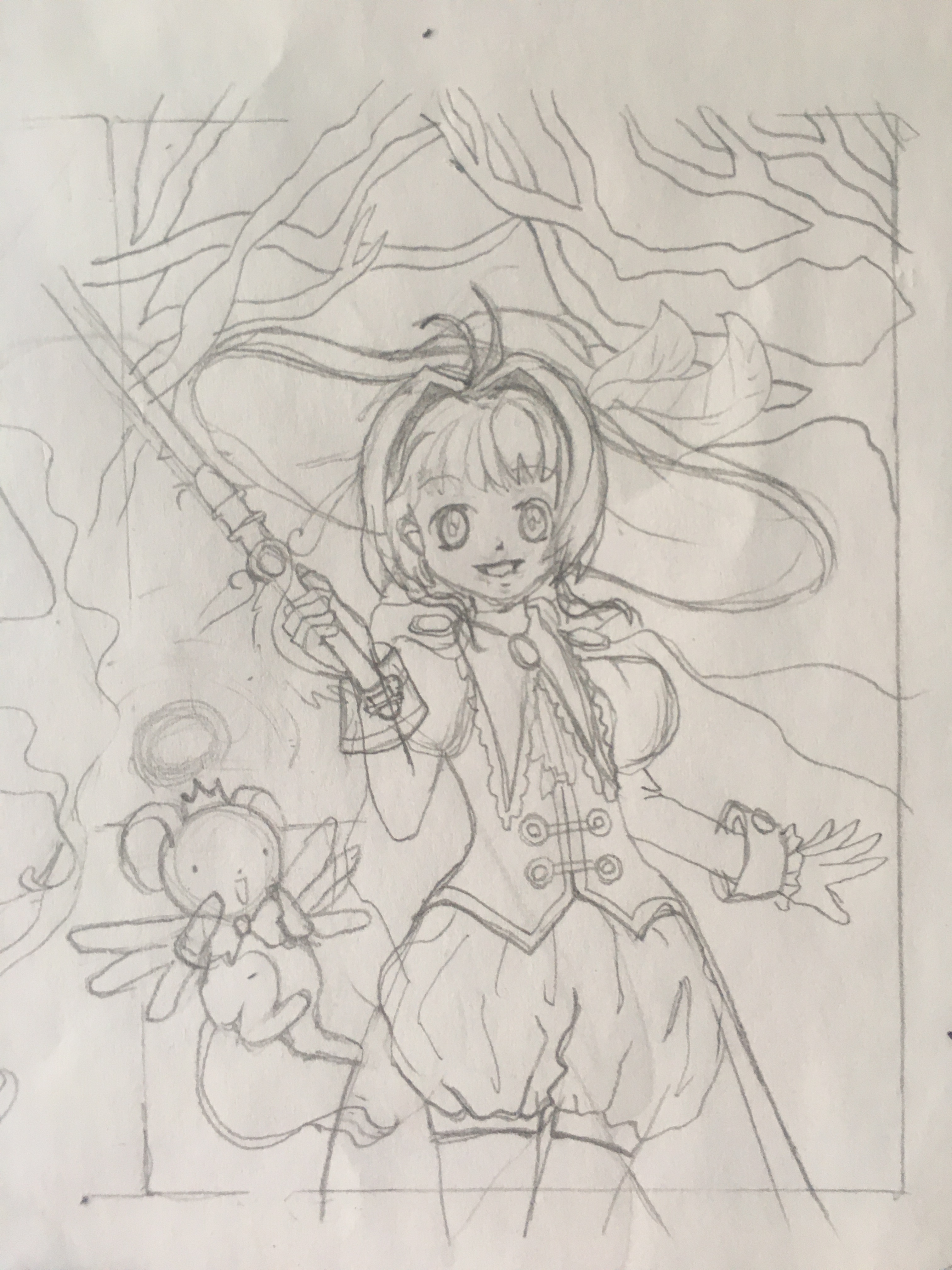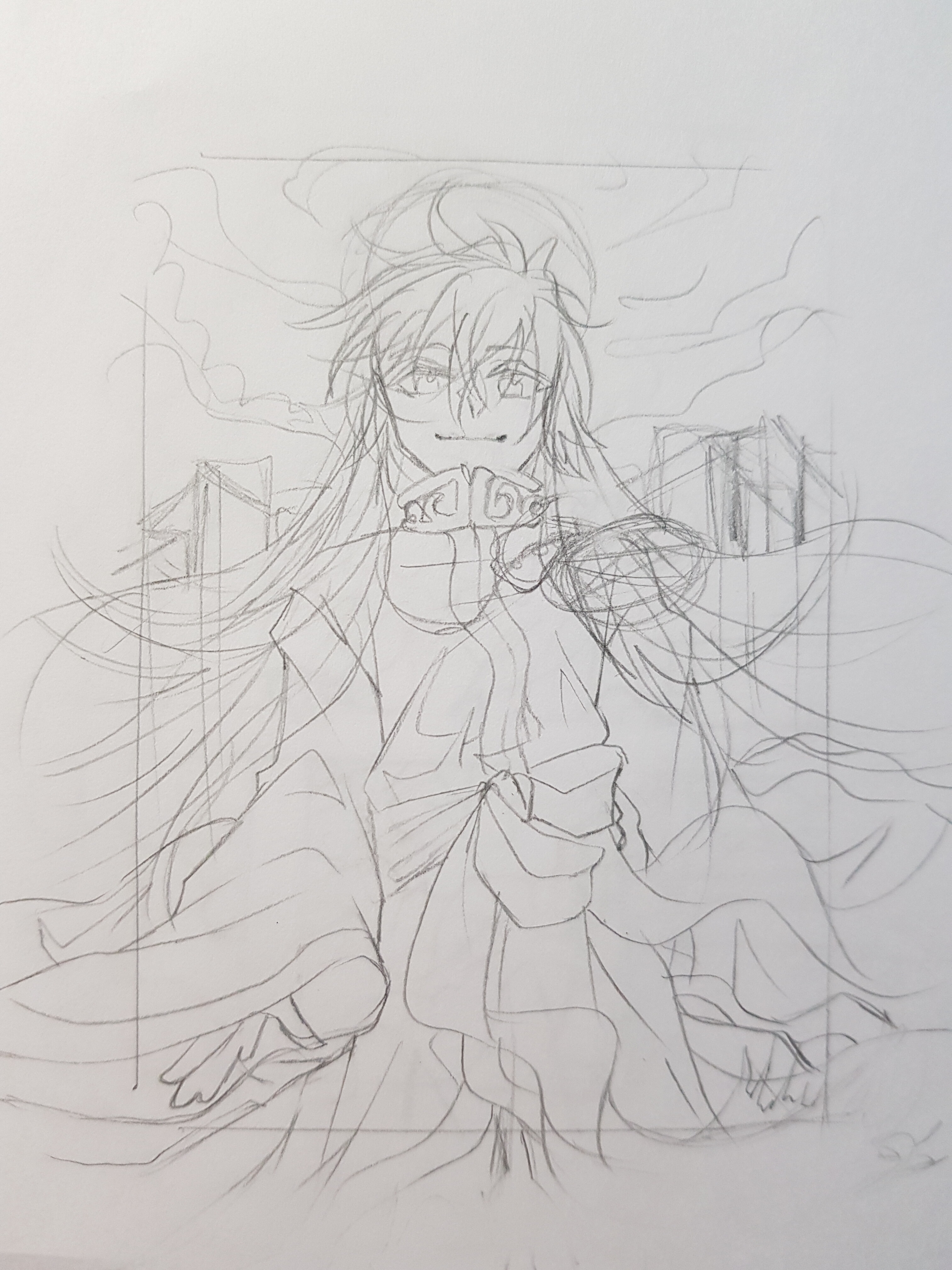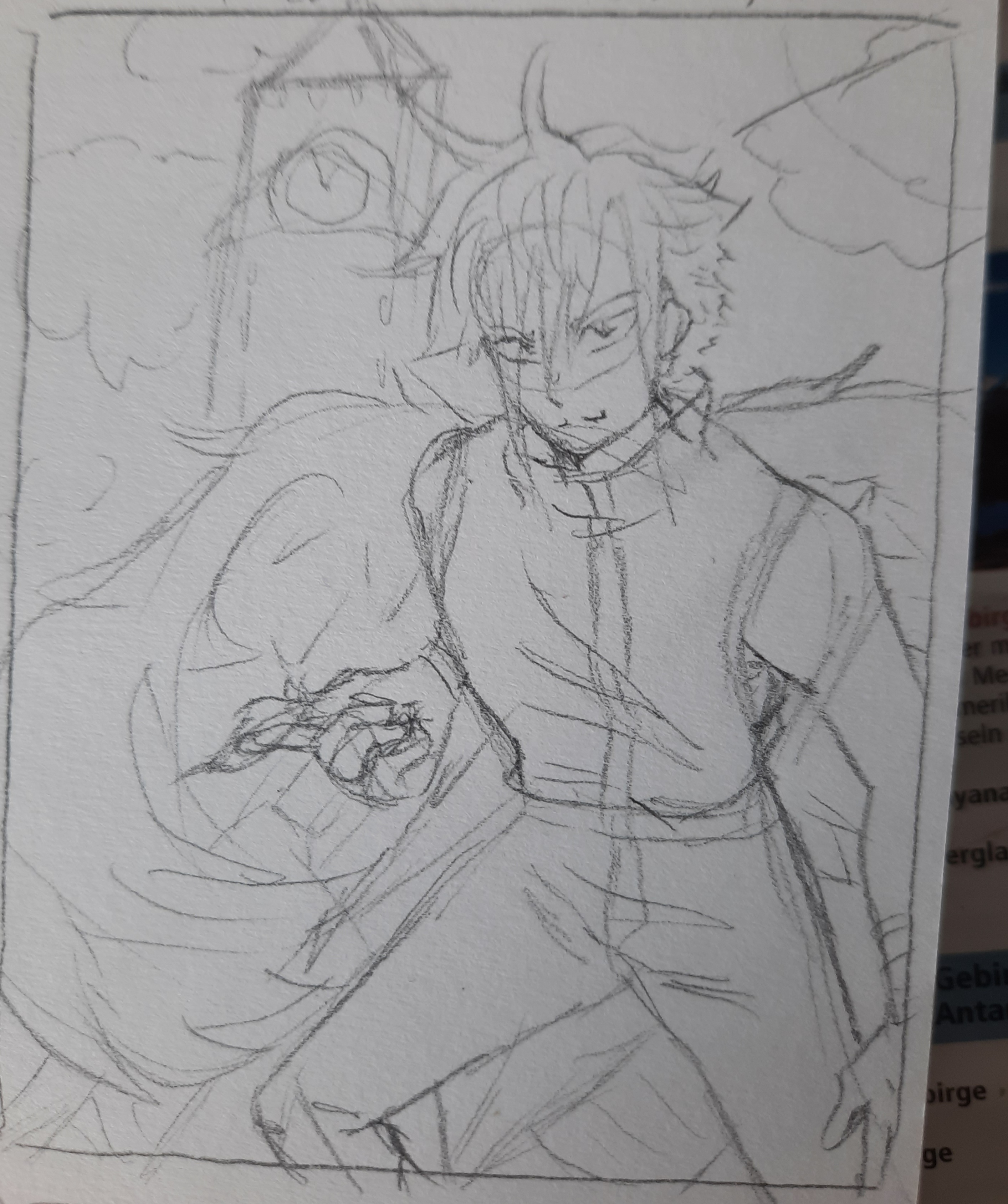 Habe hier schonmal die Skizze für Dark aus DN Angel. Habe das früher mal geschaut aber konnte mich kaum noch erinnern also hab ich nochmal die ersten paar Folgen angeschaut und habe den Uhrenturm im Hintergrund der da ja oft vorkommt eingebaut. In der Hand hat er die Feder die er immer benutzt. Ja meine Skizzen sind bisschen unübersichtlich aber sag gerne wenn dich noch was stört