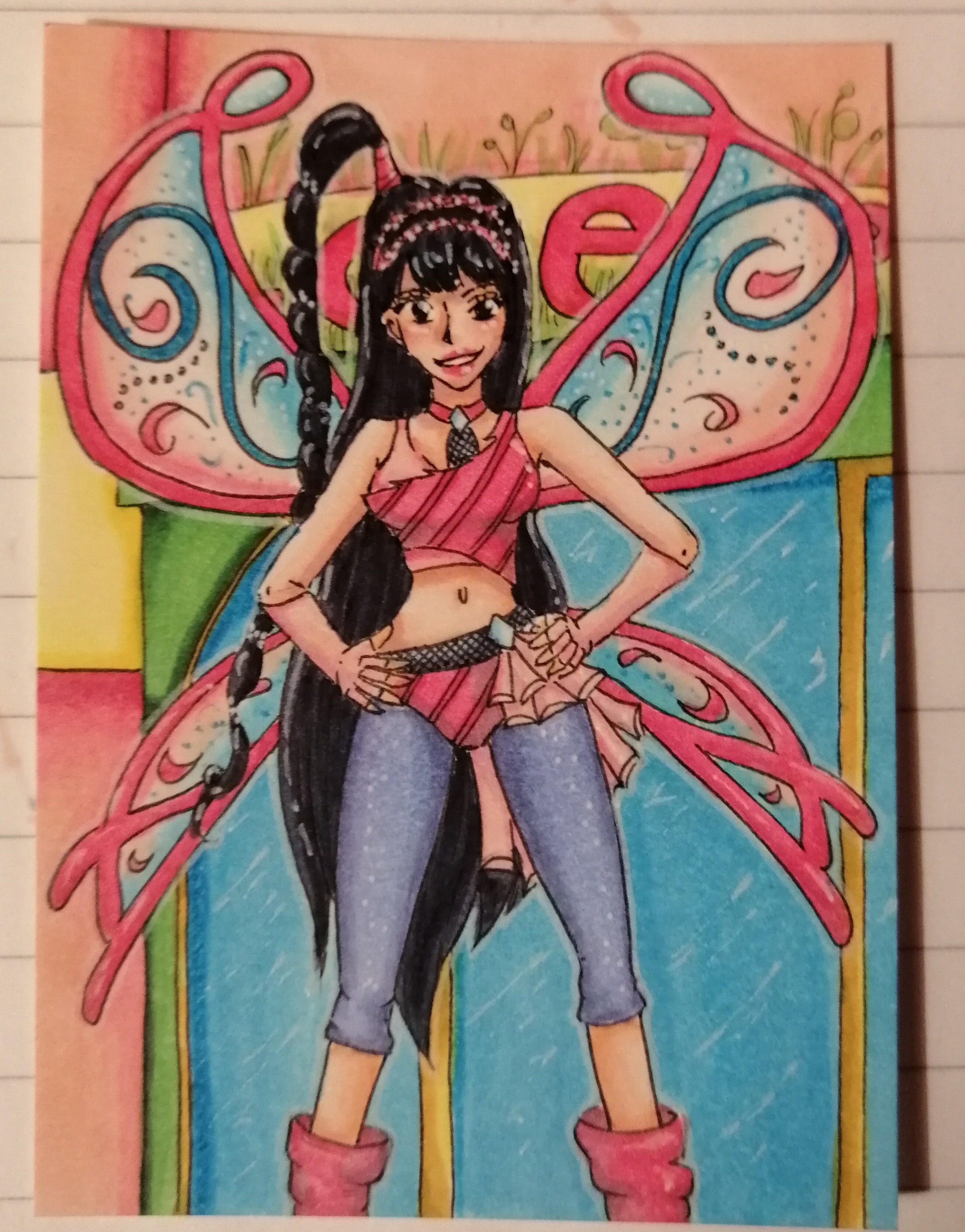 . Der Gesichtsausdruck und die Pose passen super zu ihr. Als Hintergrund wäre vielleicht eine Stadtansicht von Gardenia passend oder eines der Gebäude aus der Stadt, wie den Love and Pet shop oder die Frutti Music bar. Aber auch Tir nan og könnte ich mir gut vorstellen, in Alfea sind die Winx in der 4. Staffel nämlich nicht sehr häufig.