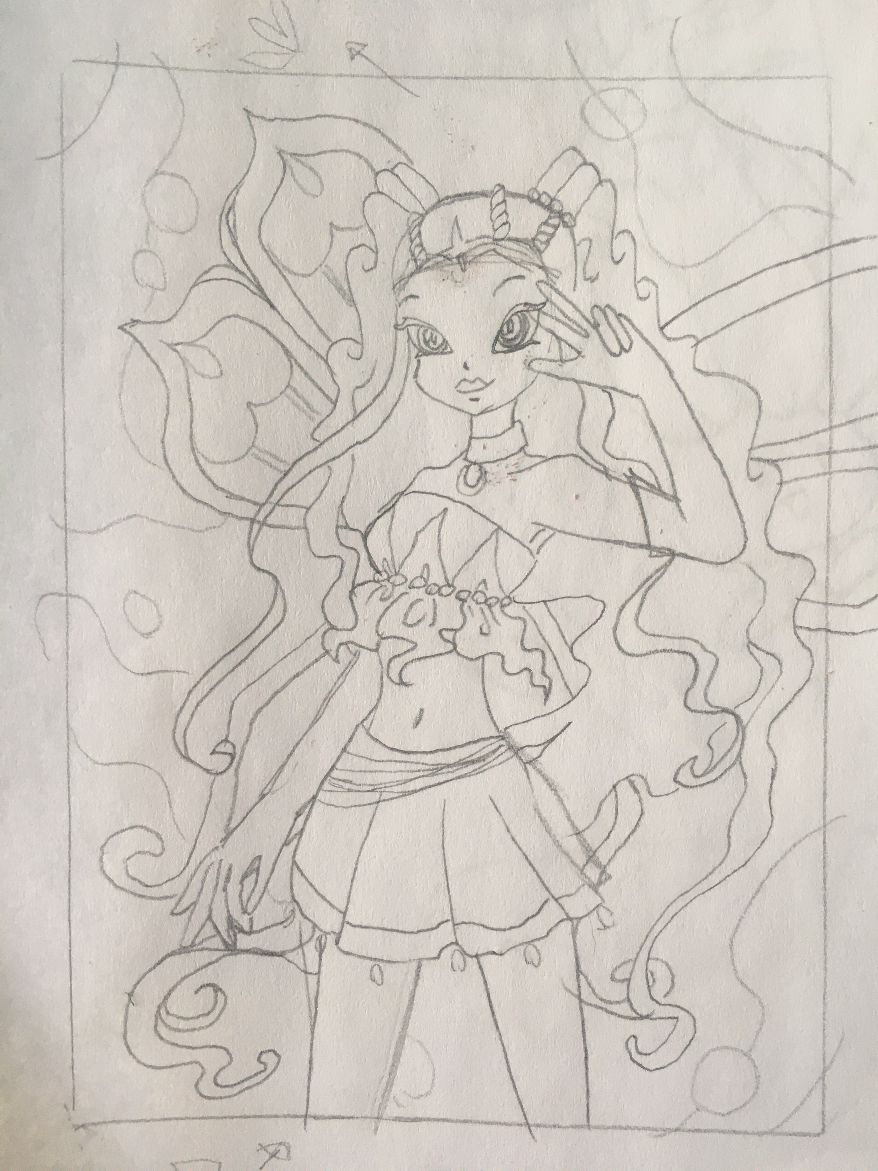 Ich hab auch schon die erste Skizze für @Sarah24 fertig. Als Hintergrund für Flora hab ich mich für die Wassertreppe entschieden, die fand ich ganz passend. Gefällt dir die Skizze so oder soll ich noch etwas ändern?