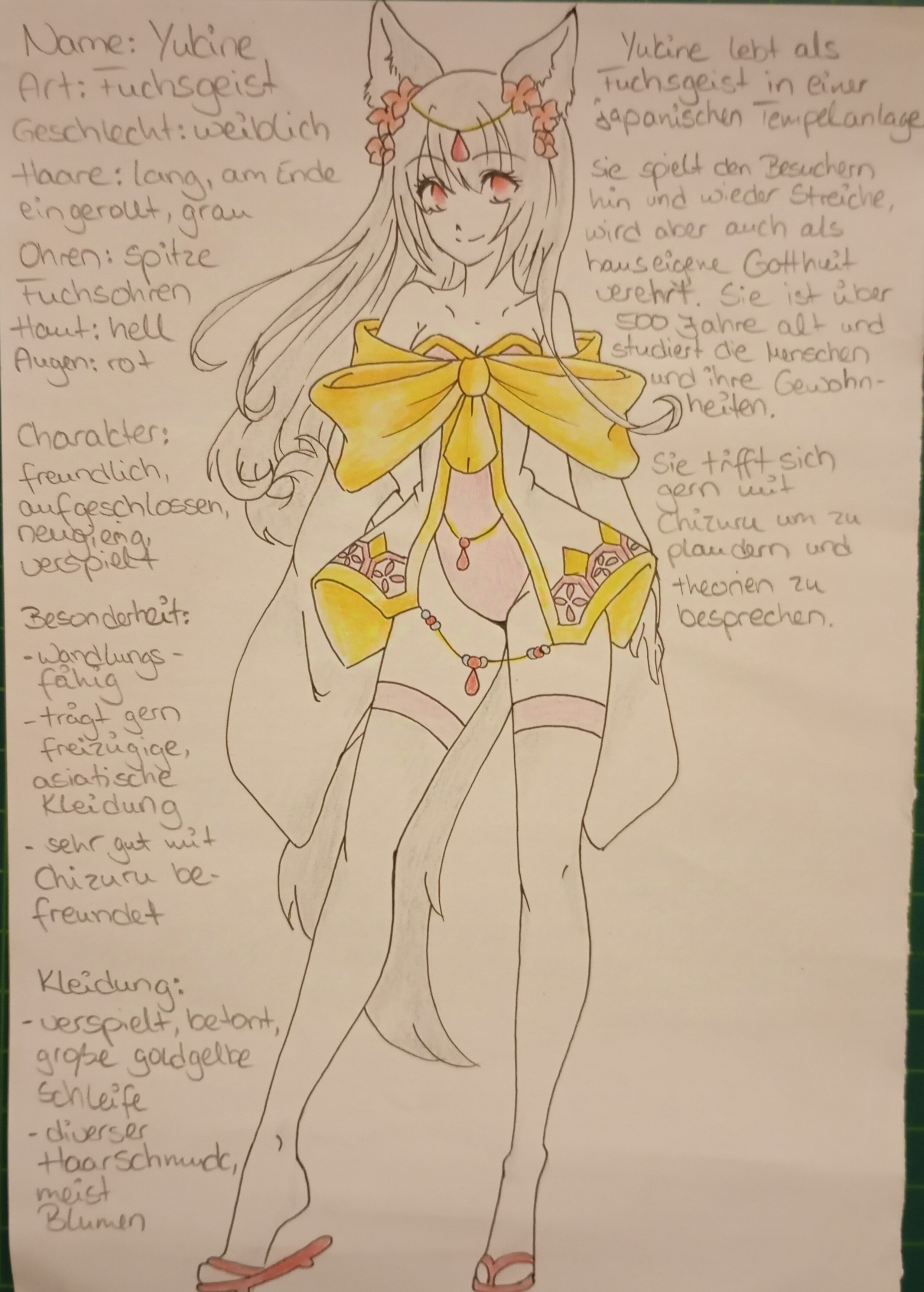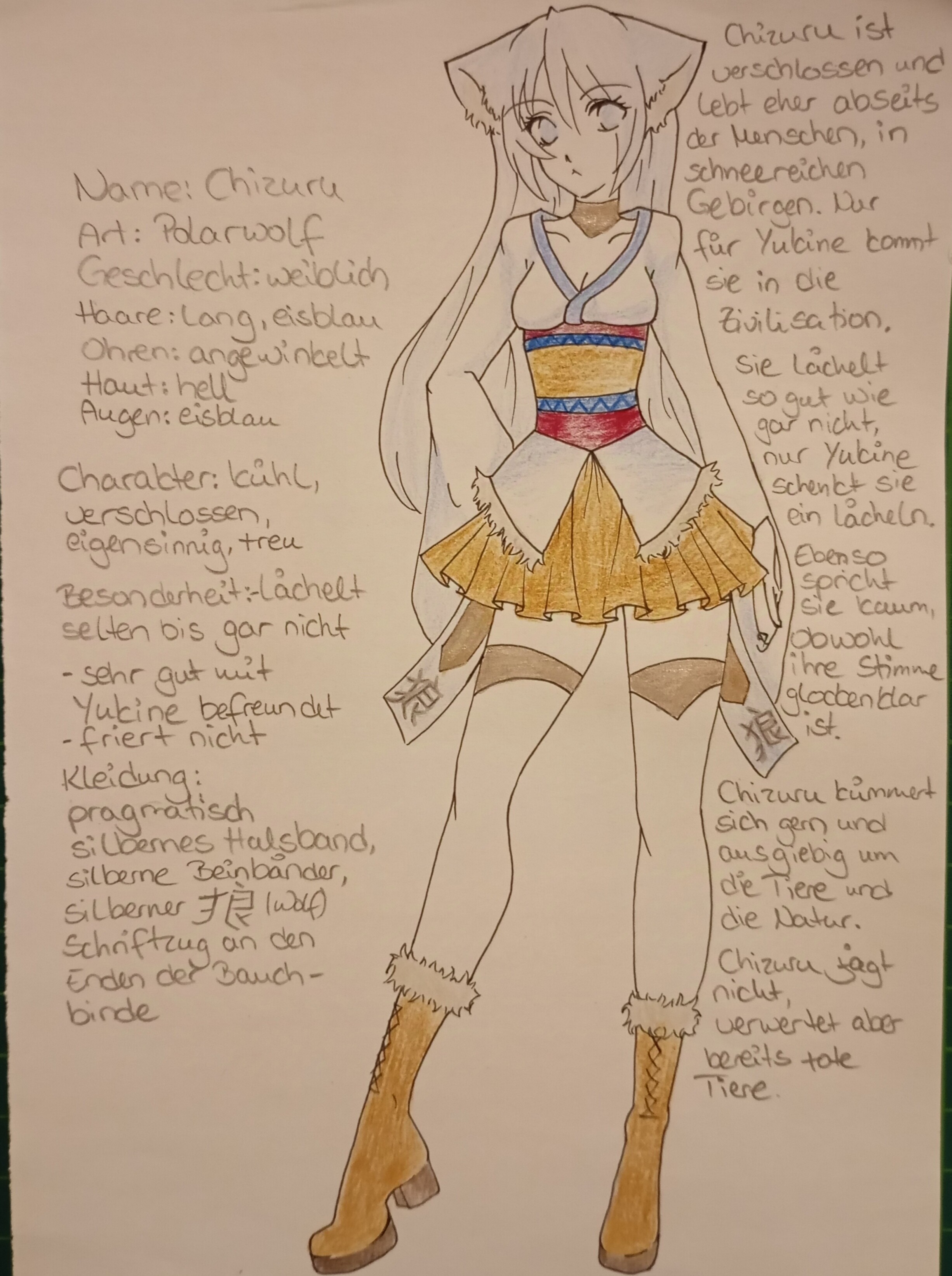 So, eins meiner Charakter, die im Rahmen von meinem Illu Kurs entstanden sind. Das hier ist eine Polarfuchs-Mensch-Mutantin, die in einem Laboratorium, wo illegale Experimente gemacht wurden, entstanden ist. Sie ist ein gelungener Embryo, welcher mit Polarfuchs-Genen bestickt wurde. Das ganze Setting ist am Nord Pol, im tiefem Wald damit das Laboratorium nicht gefunden werden kann. Sie selber hat eine Explosion im Laboratorium überlebt und ist dadurch freigekommen, jetzt muss sie alleine in der Wildnis überleben. Sie hat keine Eltern/Verwandte, nur eine Biologin, die sie als Mutter ansieht und sie weiß nicht ob diese überlebt hat, da sie nur ein Teil des Namenschildchens gefunden hatte.