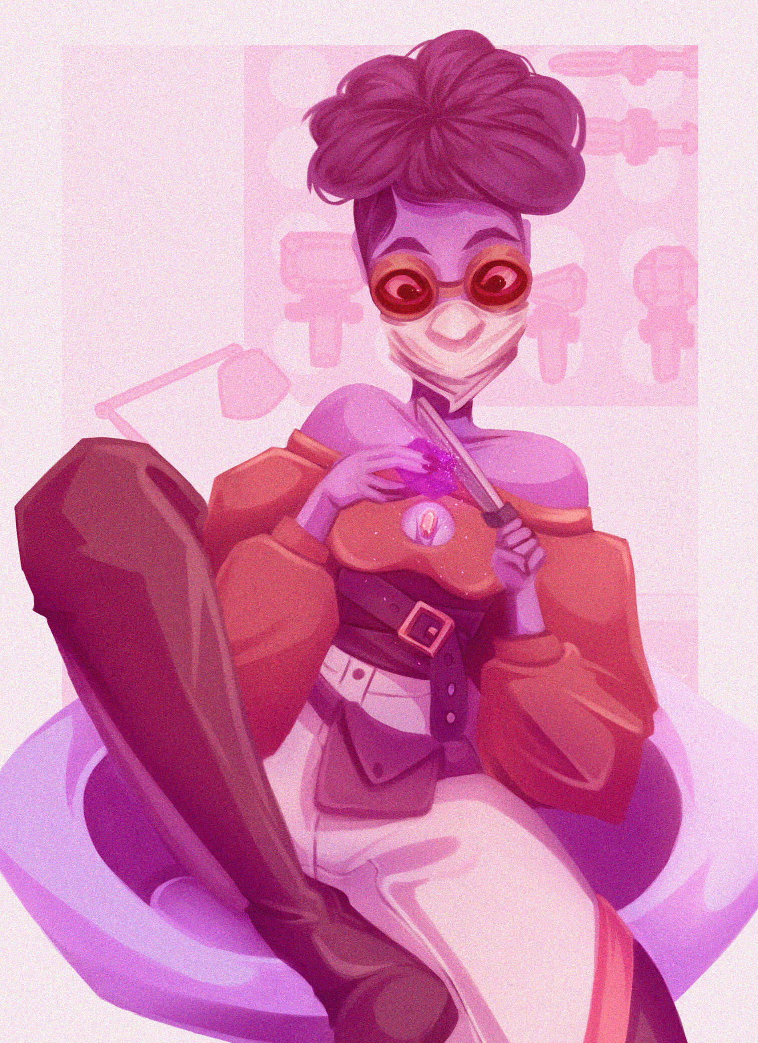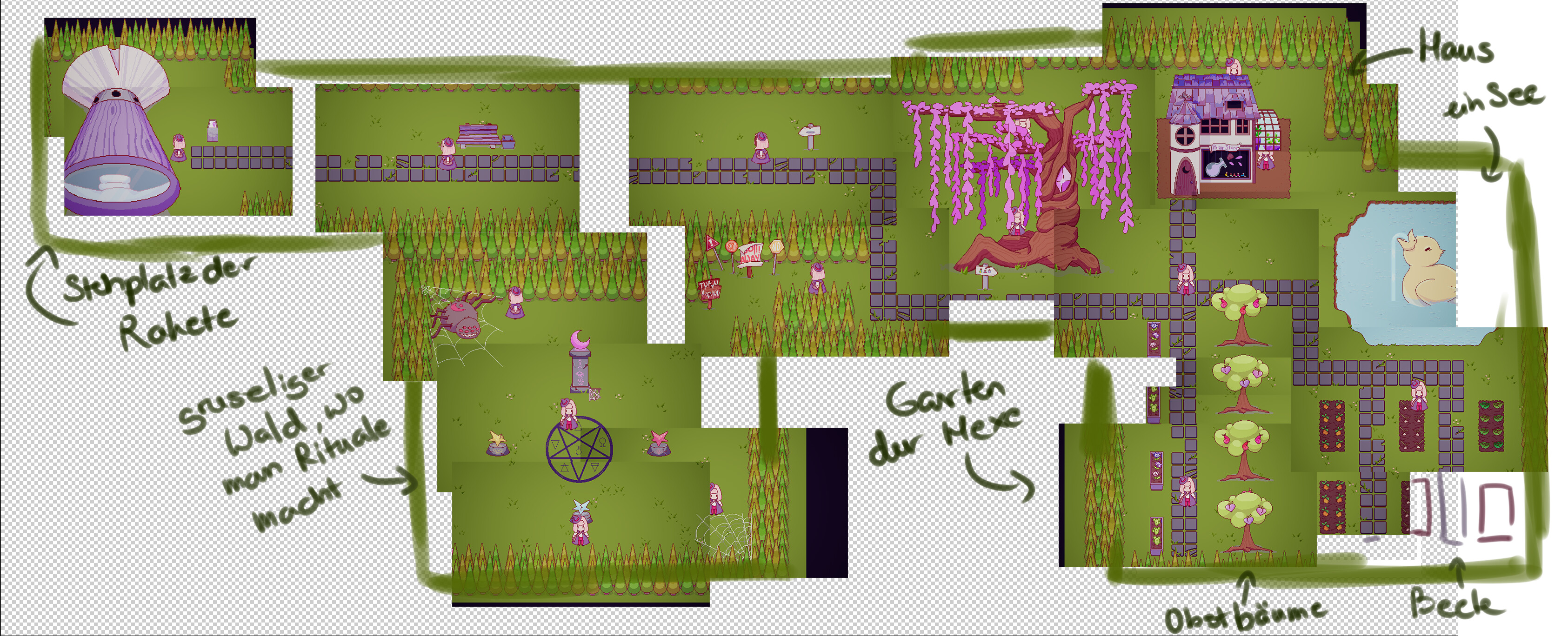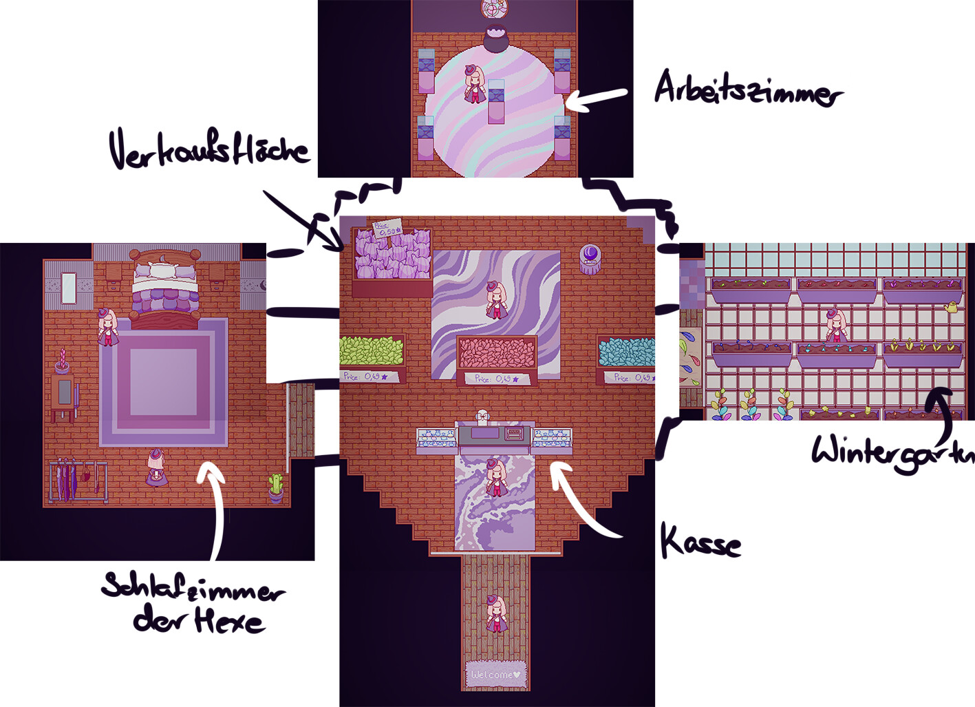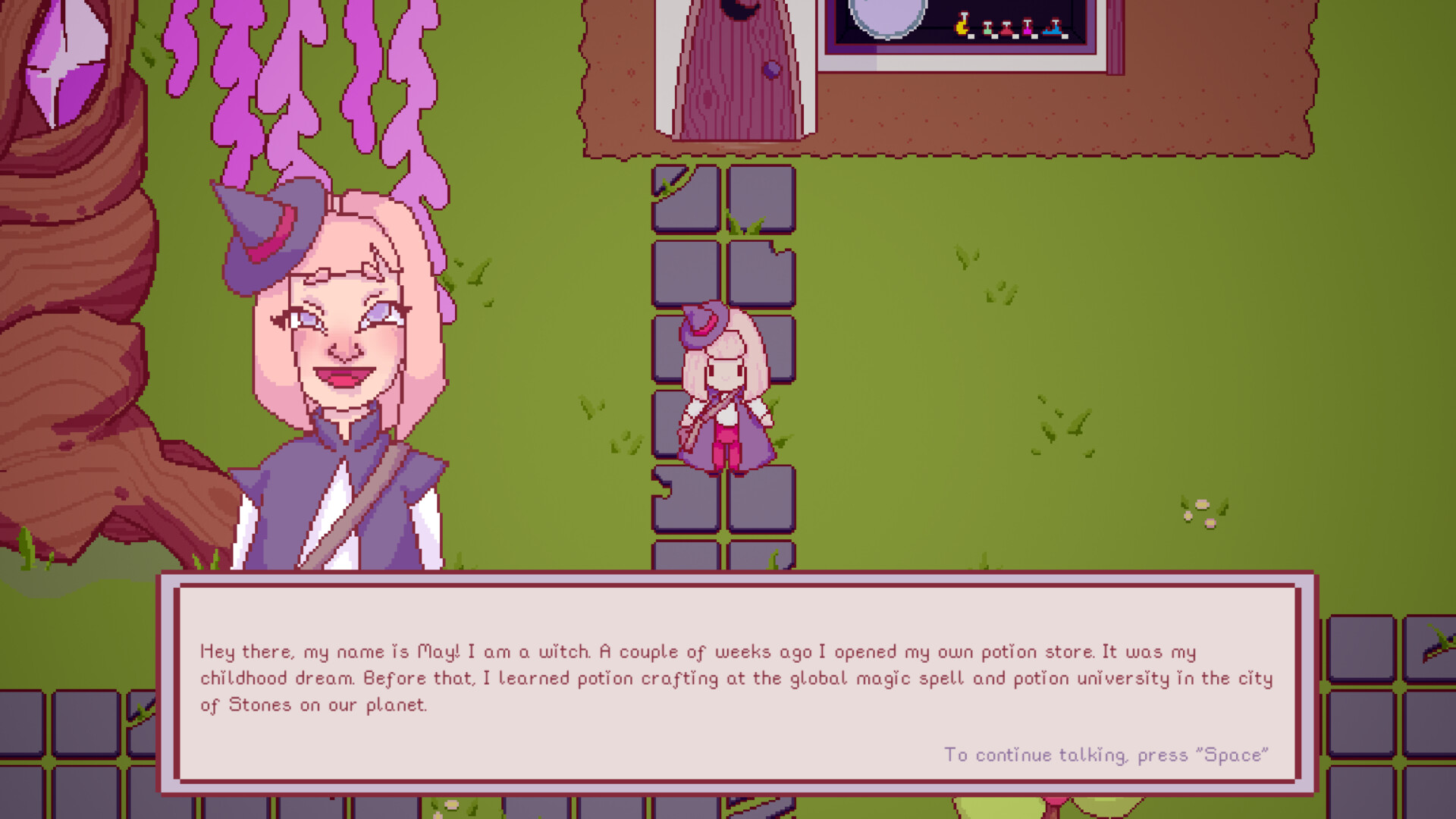 Die Hexe May ist im Rahmen meines ersten Spiels, welches ich als Abgabe für ein Game Dev Kurs im Studium erstellt habe, entstanden. Sie ist eine Hexe mit einem kleinen Laden, wo sie ihre Tränke verkauft. Um die Zutaten für die Tränke zu sammeln reist sie durch das All zu anderen Planeten in ihrer Besen-Rakete.Das Spiel selber war ein Objekt-Sammel-Ding, also man läuft durch die Welt, sammelt verschiede Zutaten, z. B. Pilze, Kräuter, Schleim usw., kehrt zu dem Häuschen der Hexe zurück, wo man die Zutaten bei dem Hexenkessel für Tränke mixen muss. Ich hatte insgesamt 5 Tränke und die bestanden aus 5 verschiedenen Kombinationen der Zutaten.