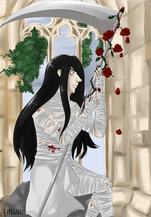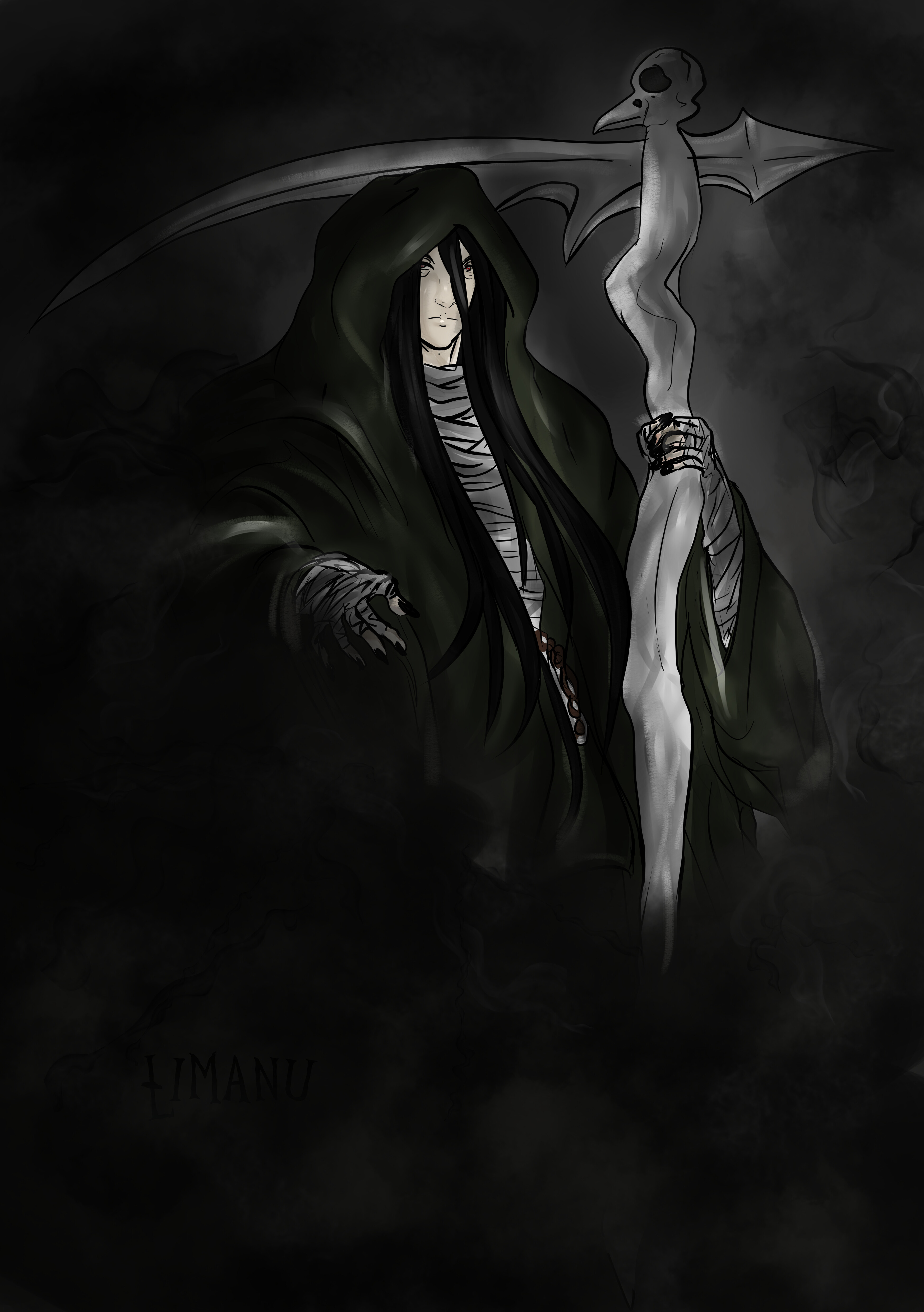 Zu ihm passen gory und auch blutige Motive. Mit seiner Sense, die er für die Morde nutzt, kann er auch dargestellt werden.