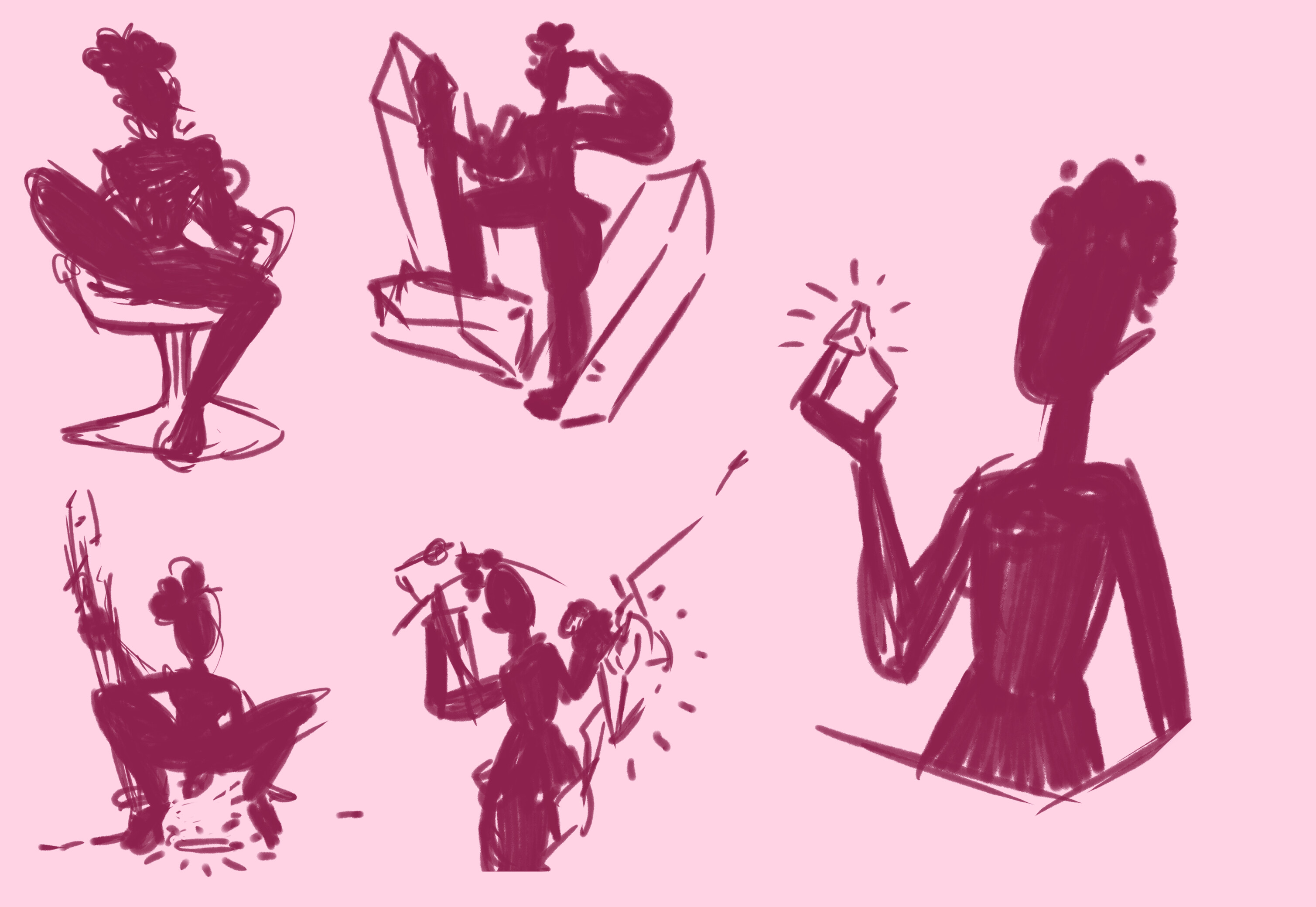 Beispiele wie man den Charakter darstellen kann: Beim Steinesammeln, wobei sie vielleicht auf Monster oder unvorhersehbare Wetter-/Umweltbedingungen trifft, beim Schleifen der Steine(kann man einfach so zeichnen oder wenn ihr ein Stein zerbricht und z. B. etwas Böses/Böse Magie aus dem Stein rauskommt), beim Verkauf/reden mit Kunden oder Einräumen ihrer Ware/Aufbauen ihres Standes.