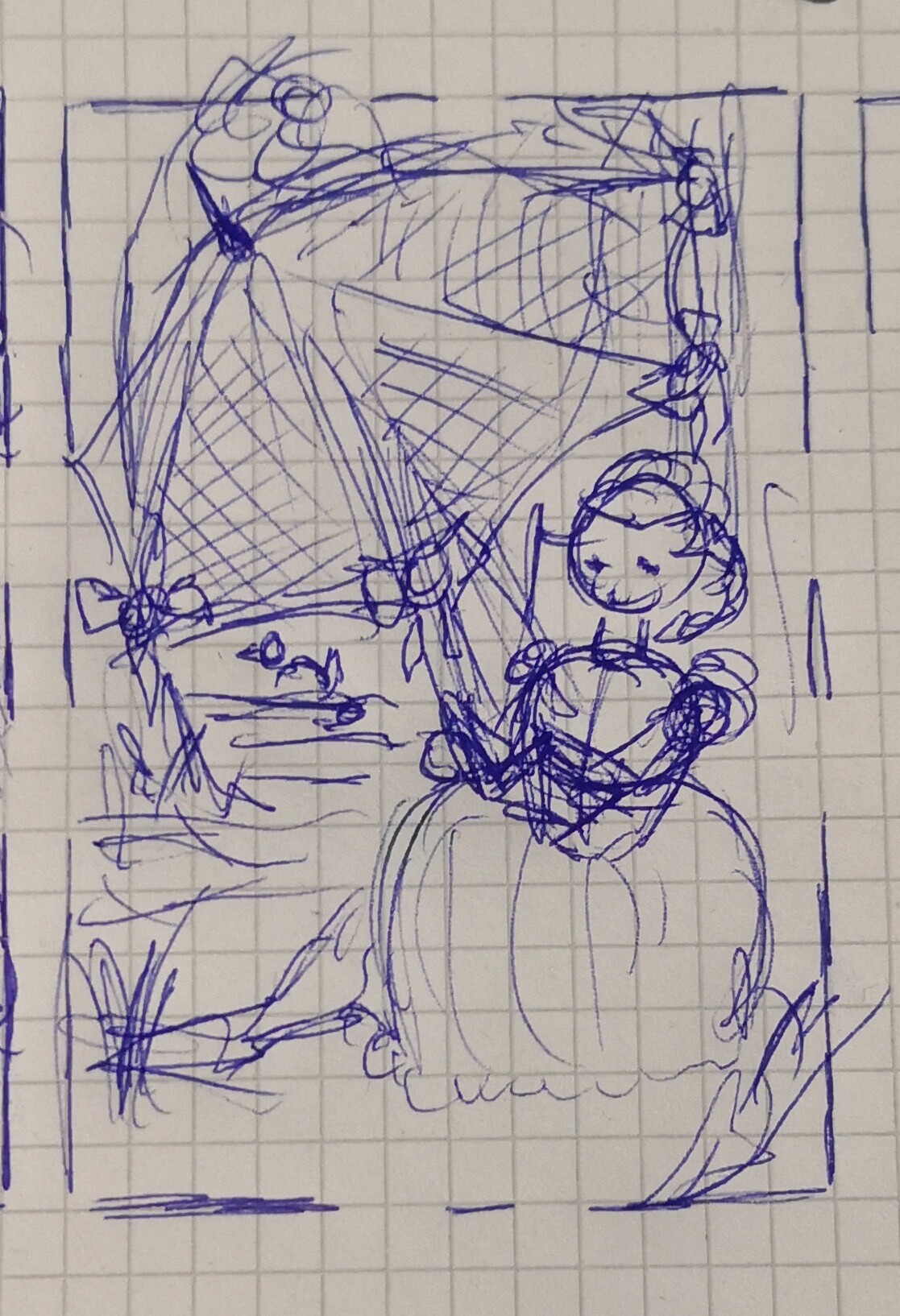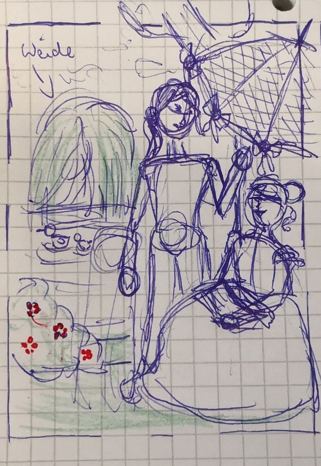 Ich dachte an Mary, wie sie mit Kleid und einem “aufgepufften” Rock unter einem Baum an einem See sitzt und liest. Der Sonnenschirm ist in der Skizze etwas groß geworden.