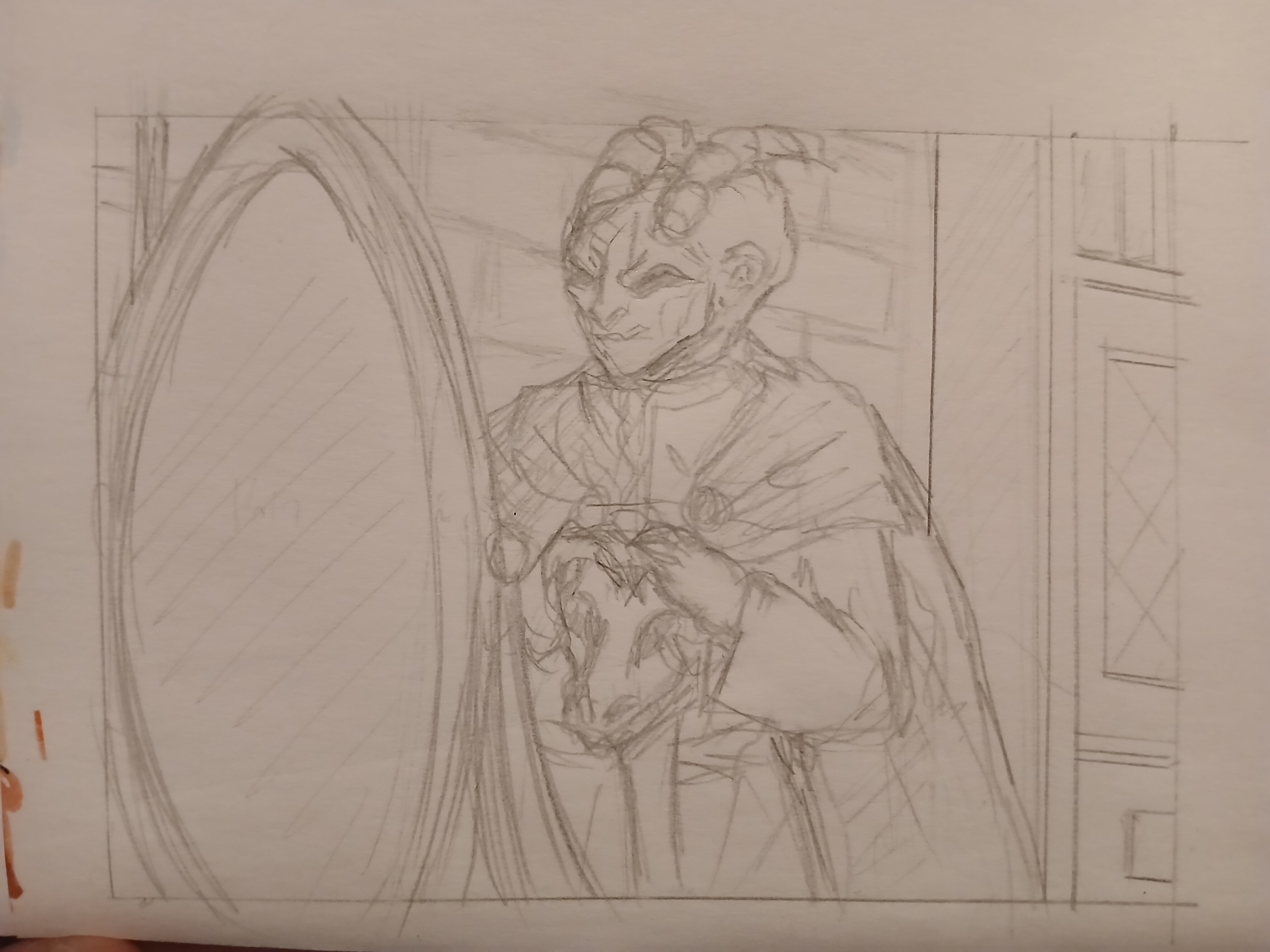 Links hinter dem Spiegel ist ein Fenster und rechts ein Schrank. Ich könnte die Szenerie im Dunkeln colorieren oder bei Tag, wie du willst ^_^